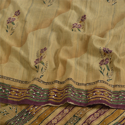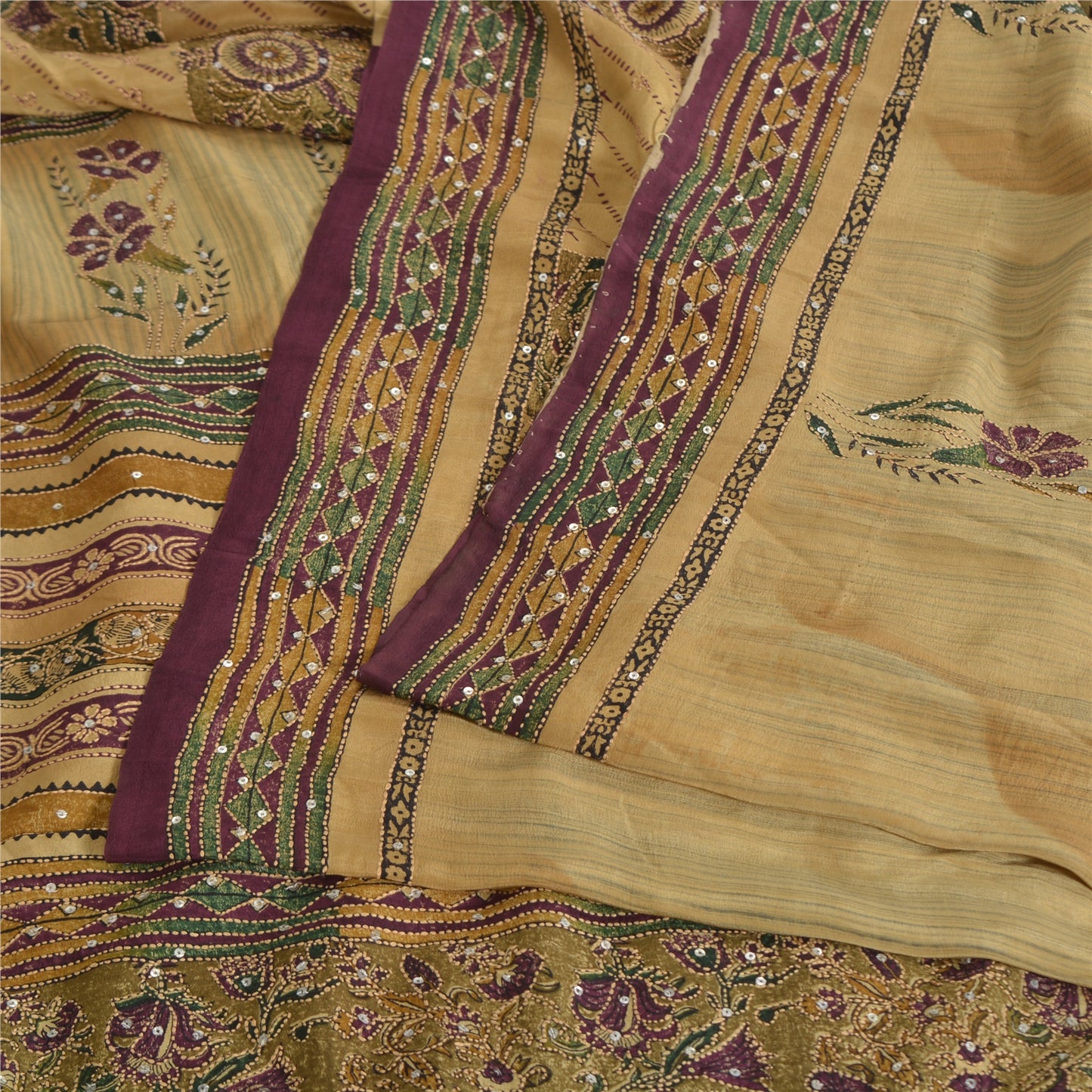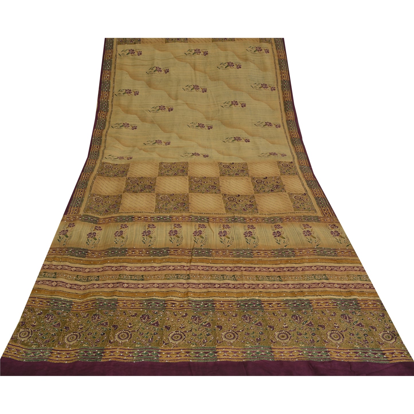Sanskriti Vintage Sarees Cream Hand Beaded Kantha Pure Crepe Printed Sari Sustainable Fabric