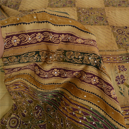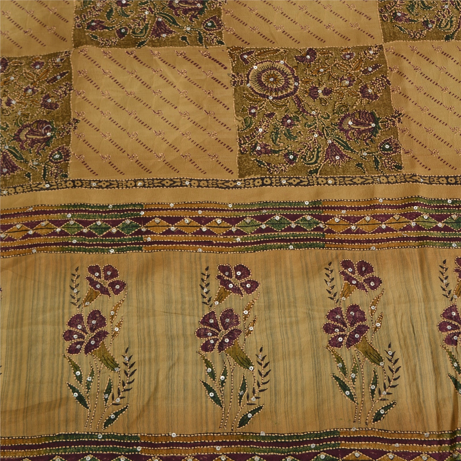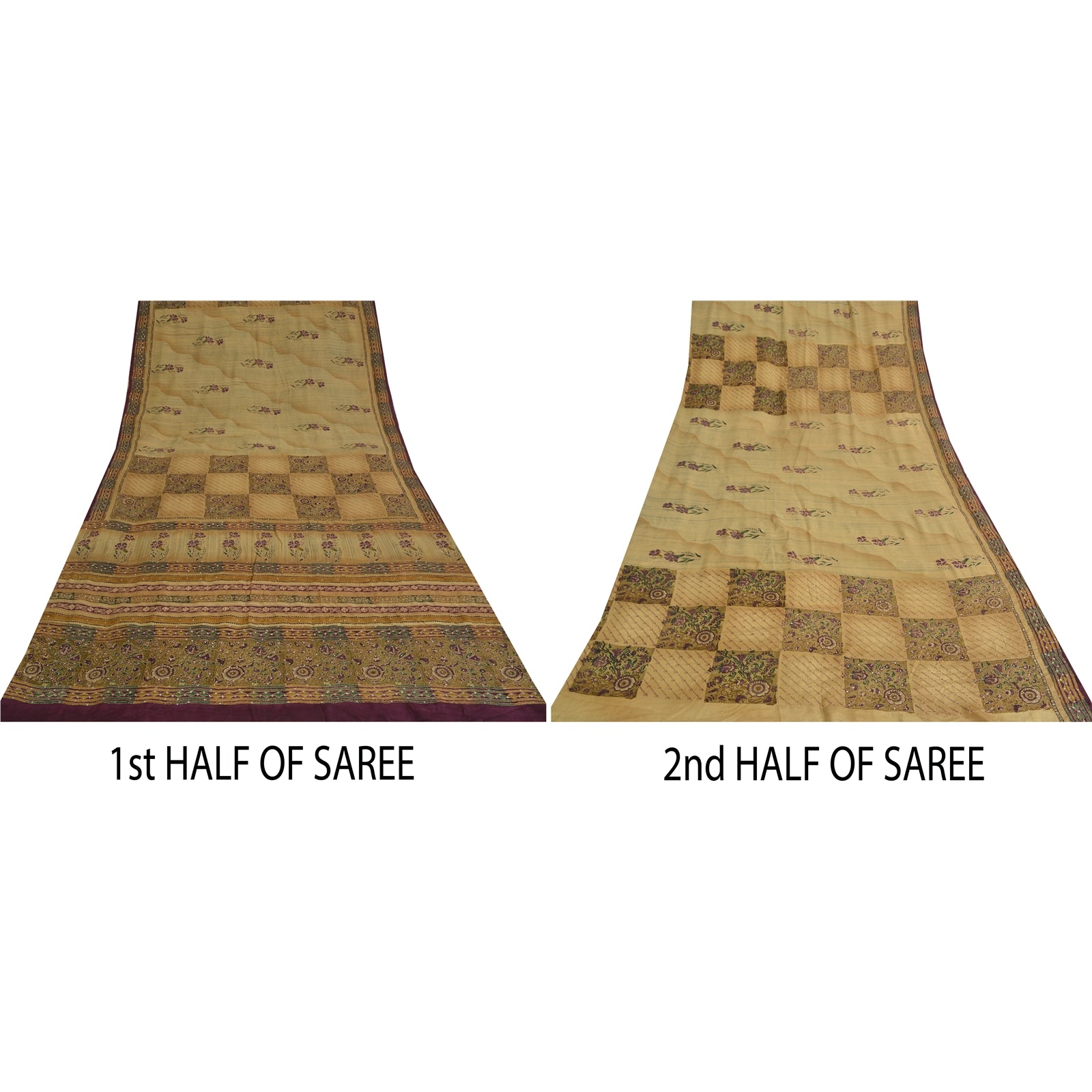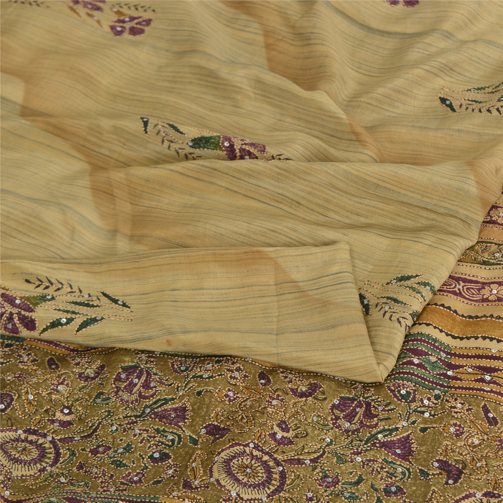 Sanskriti Vintage Sarees Cream Hand Beaded Kantha Pure Crepe Printed Sari Sustainable Fabric