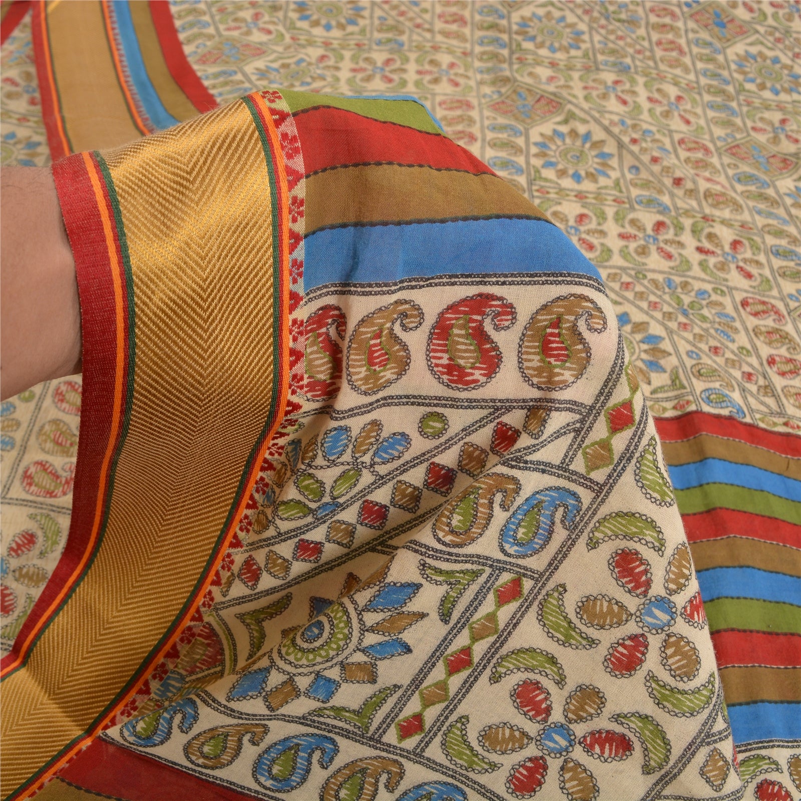 Sanskriti Vintage Sarees Cream Kantha Printed Pure Cotton Sari Soft Craft Sustainable Fabric