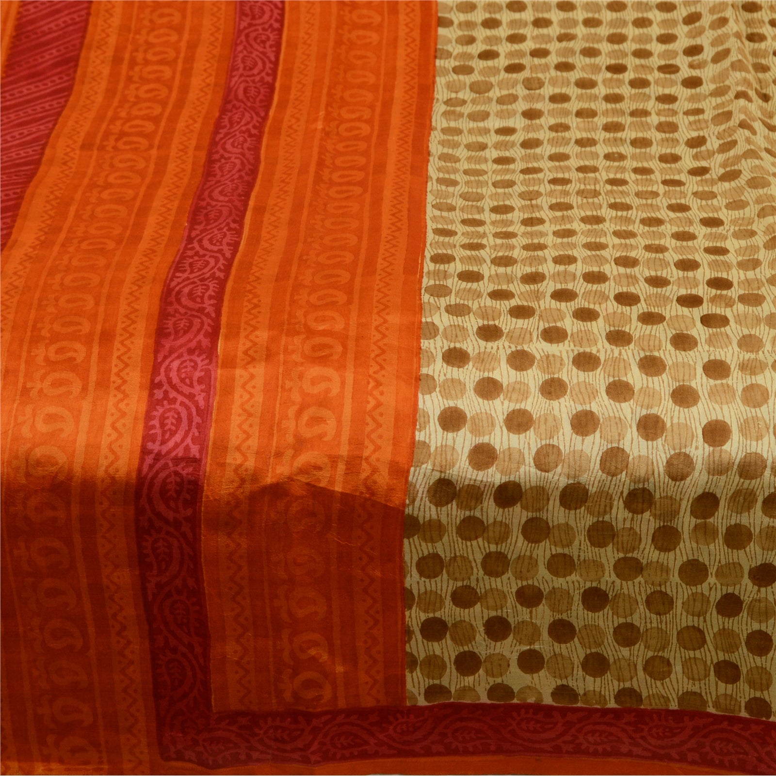 Sanskriti Vintage Sarees Cream & Orange Pure Silk Printed Sari 5yd Craft Sustainable Fabric