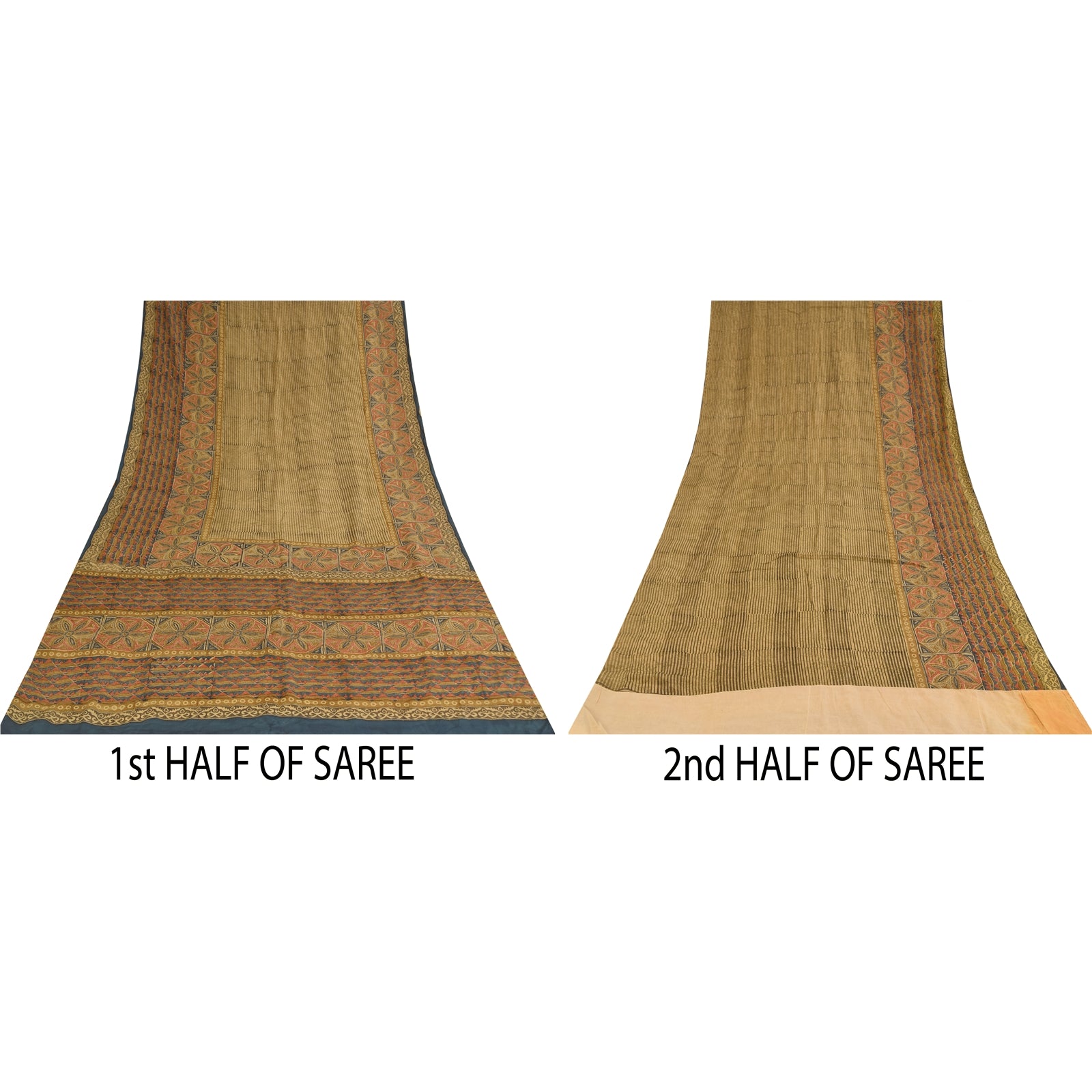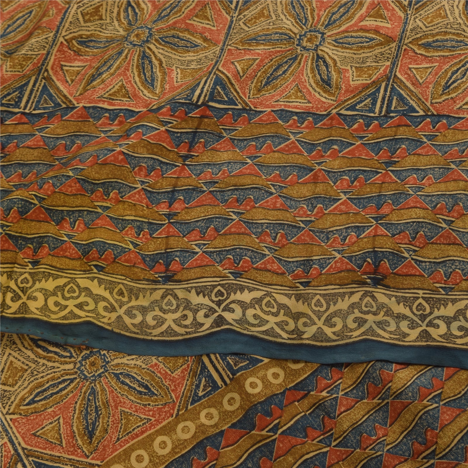 Sanskriti Vintage Sarees Cream Pure Crepe Silk Printed Sari 6yd Craft Sustainable Fabric
