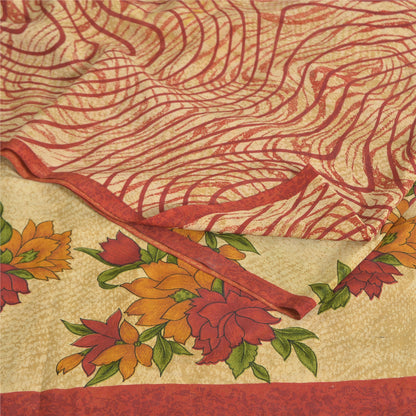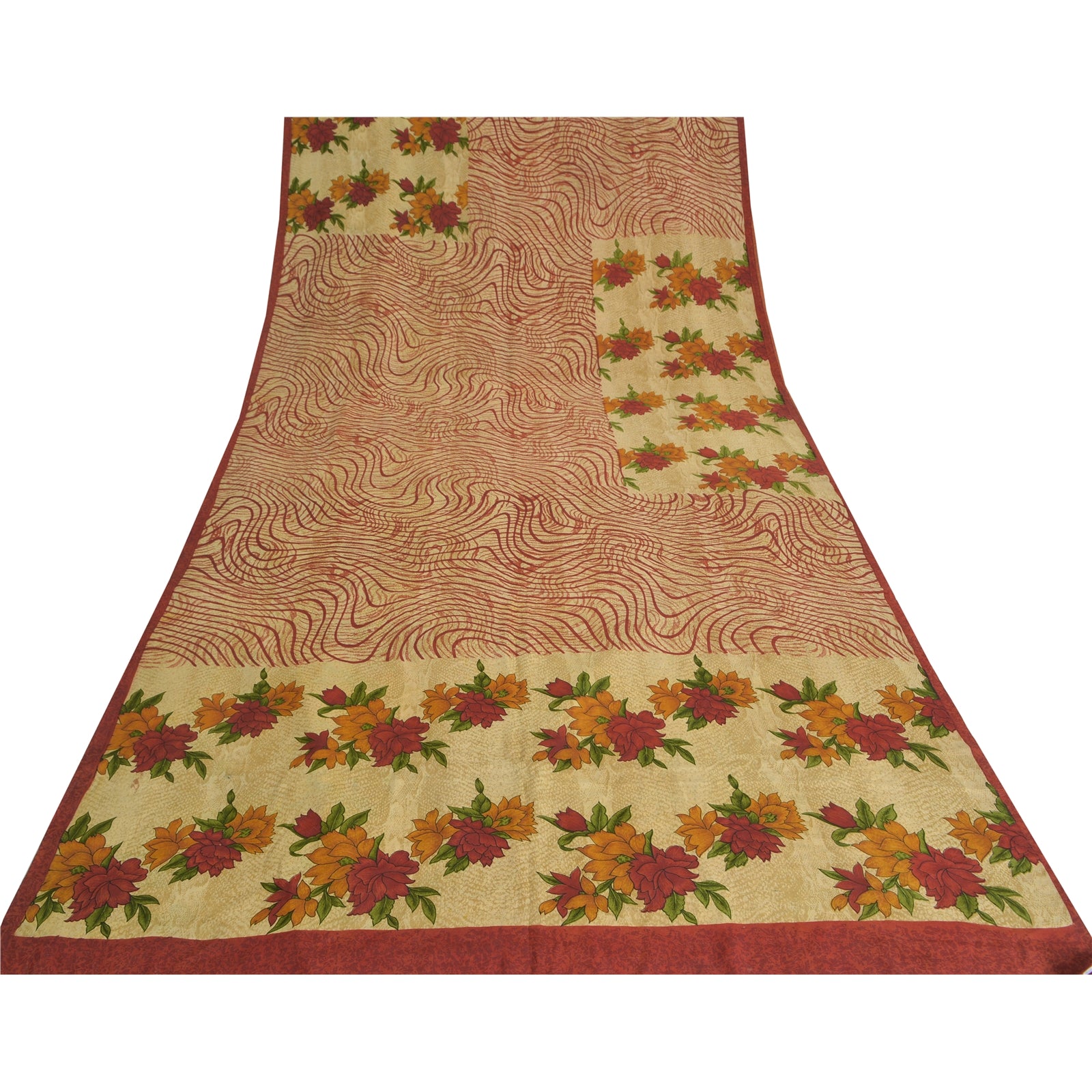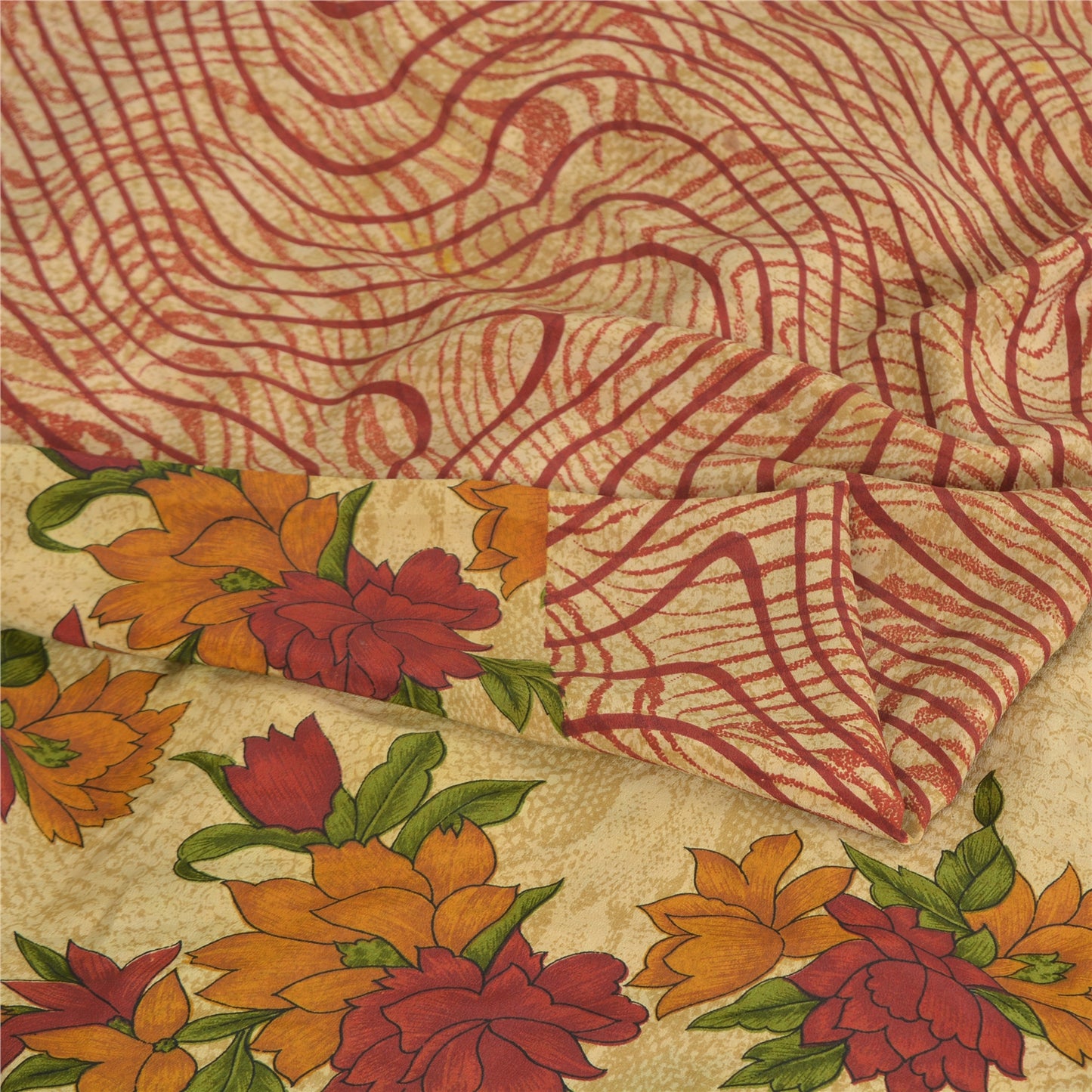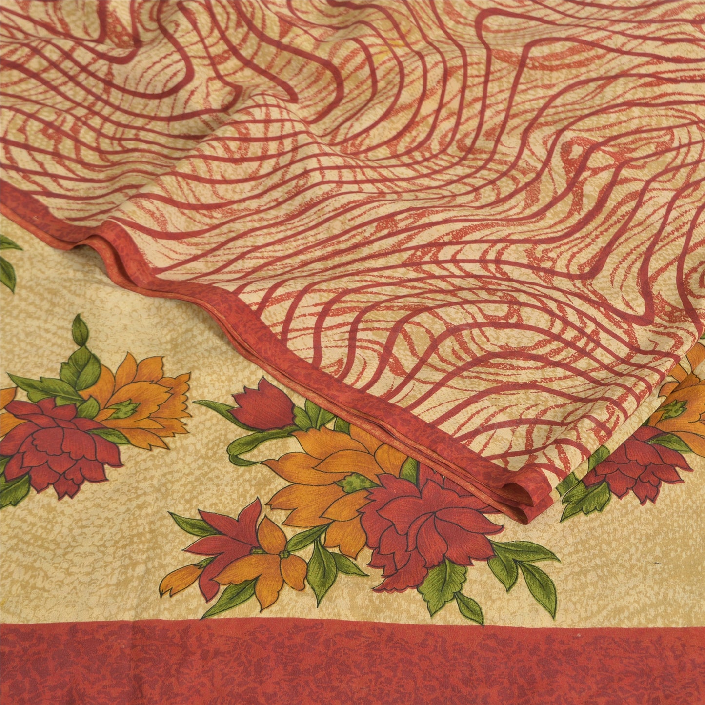 Sanskriti Vintage Sarees Cream/Red Pure Crepe Silk Printed Sari 5yd Craft Sustainable Fabric
