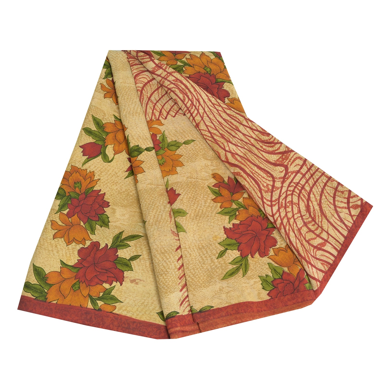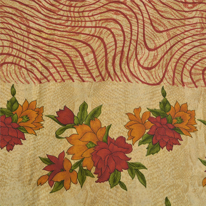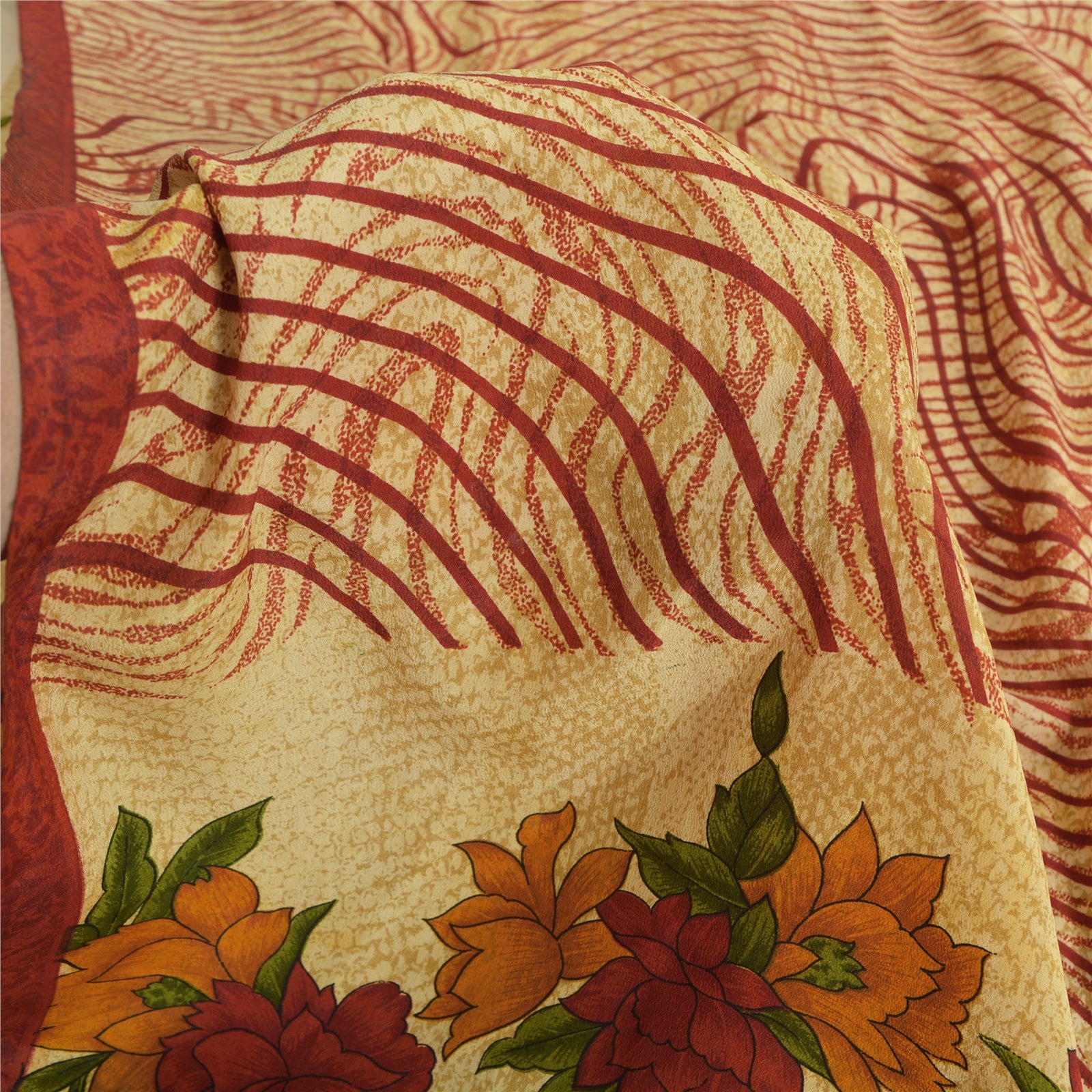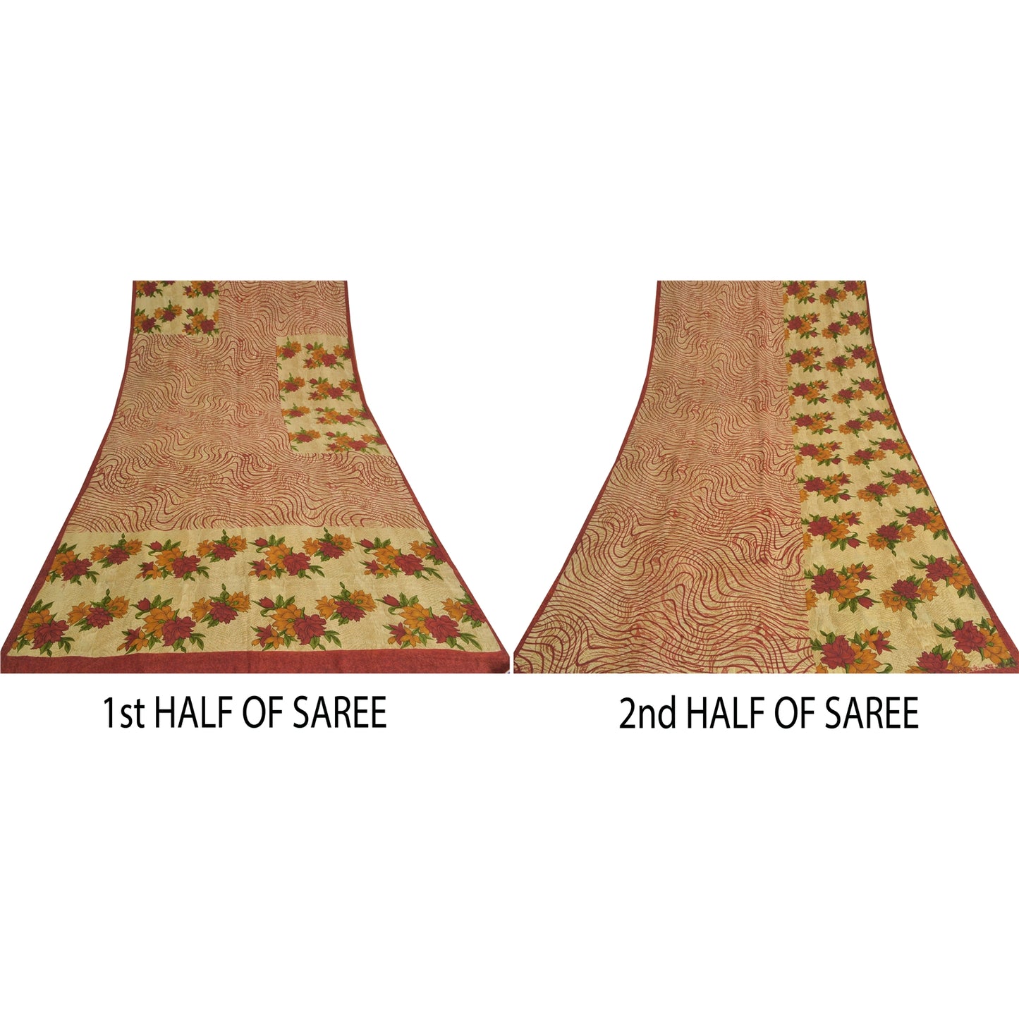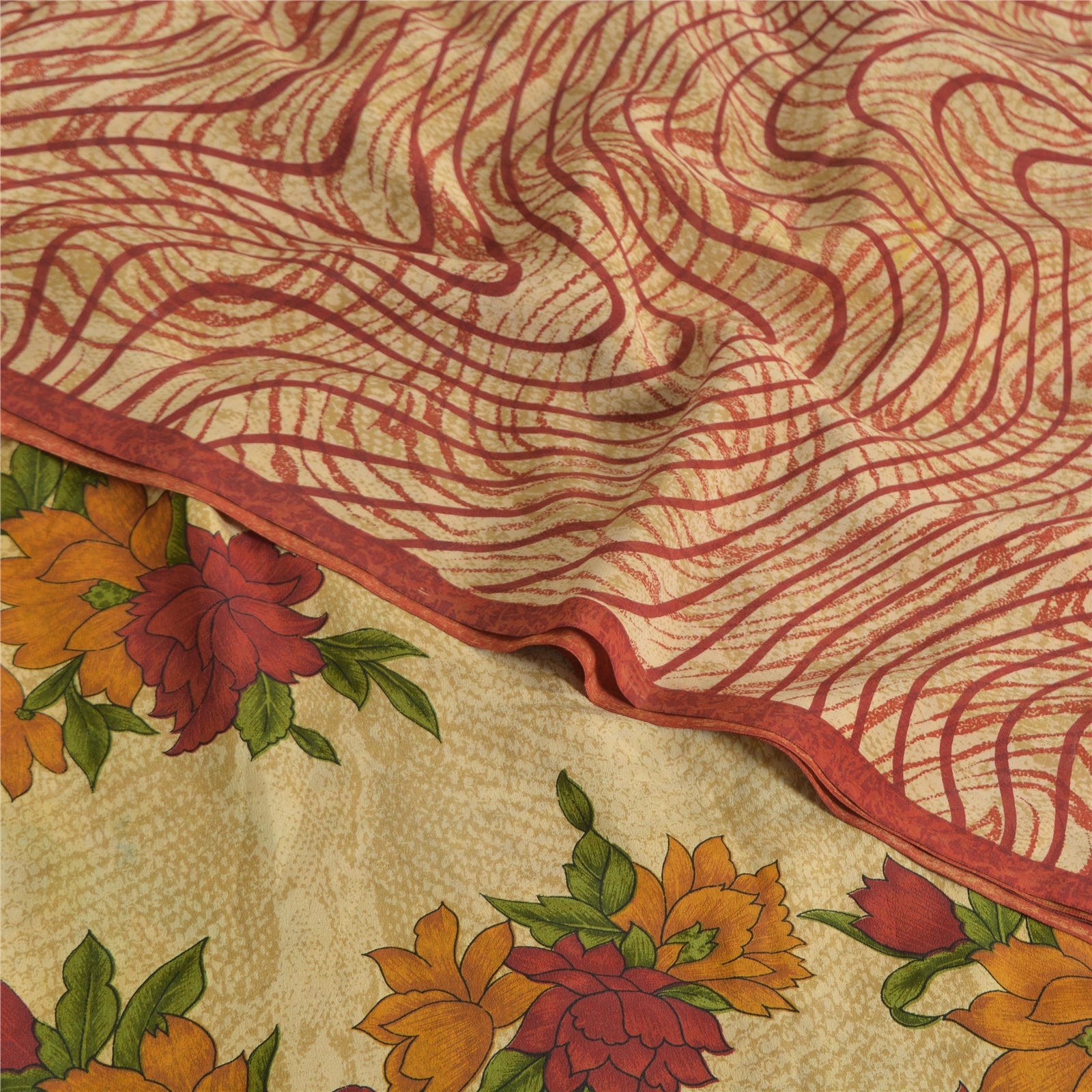 Sanskriti Vintage Sarees Cream/Red Pure Crepe Silk Printed Sari 5yd Craft Sustainable Fabric