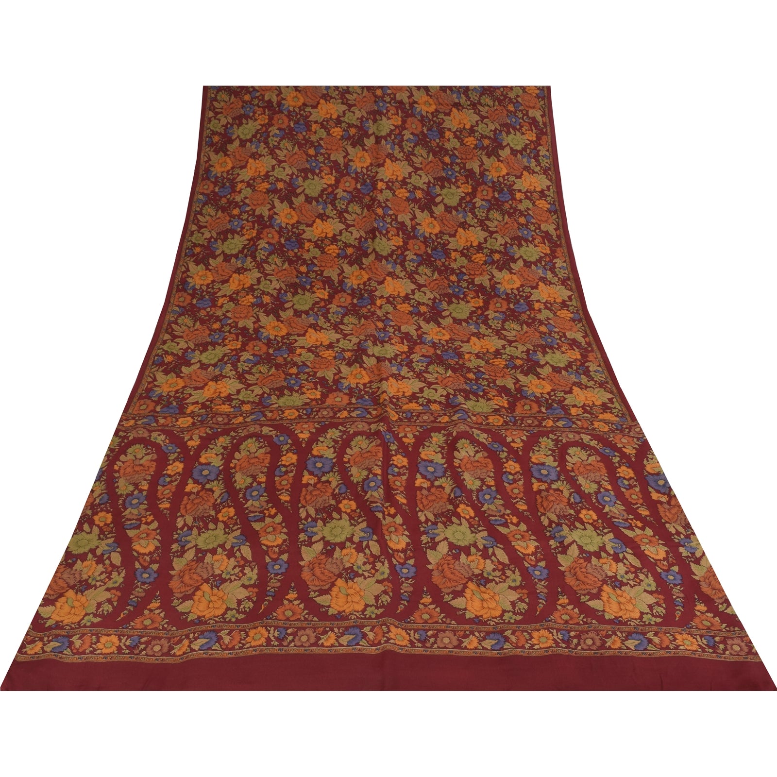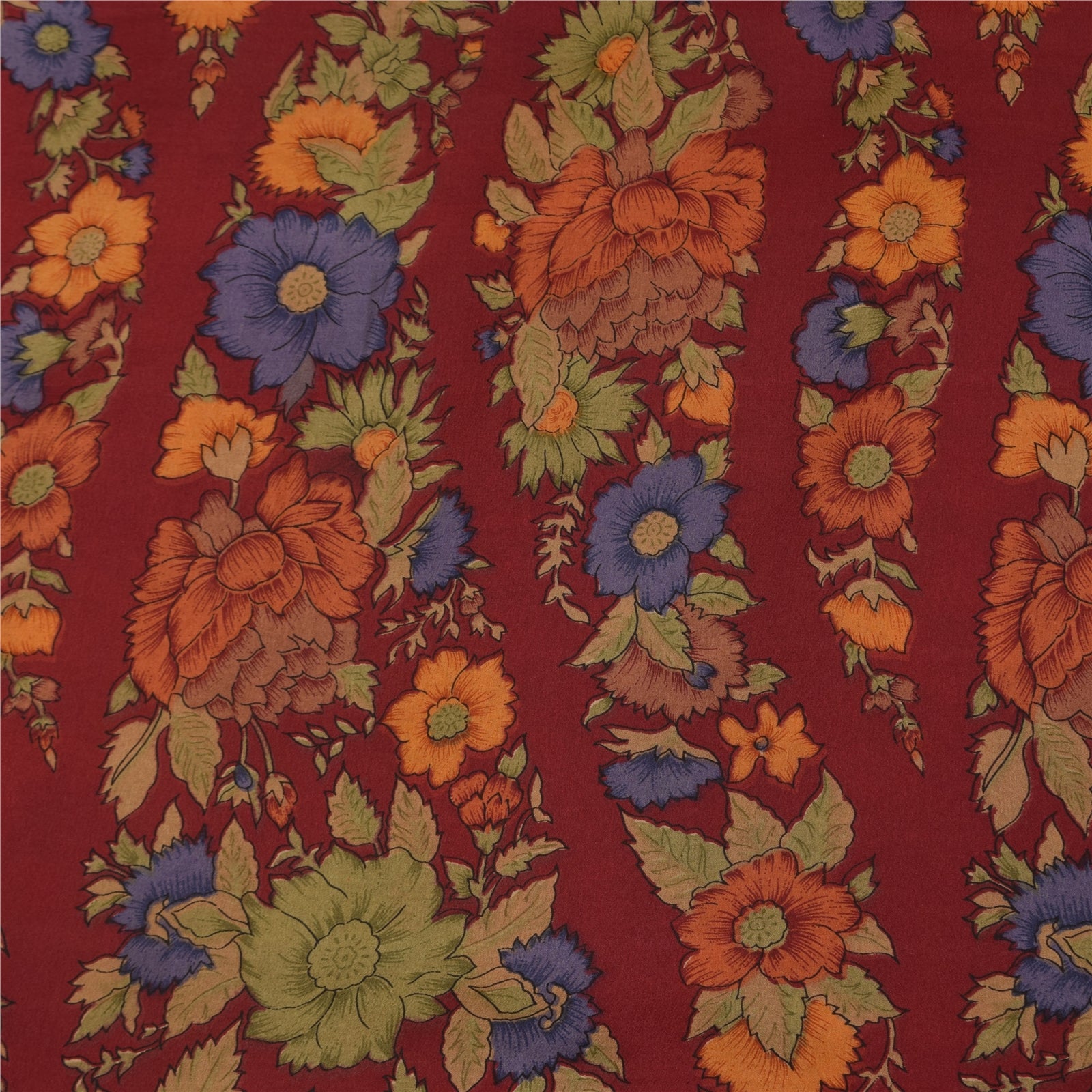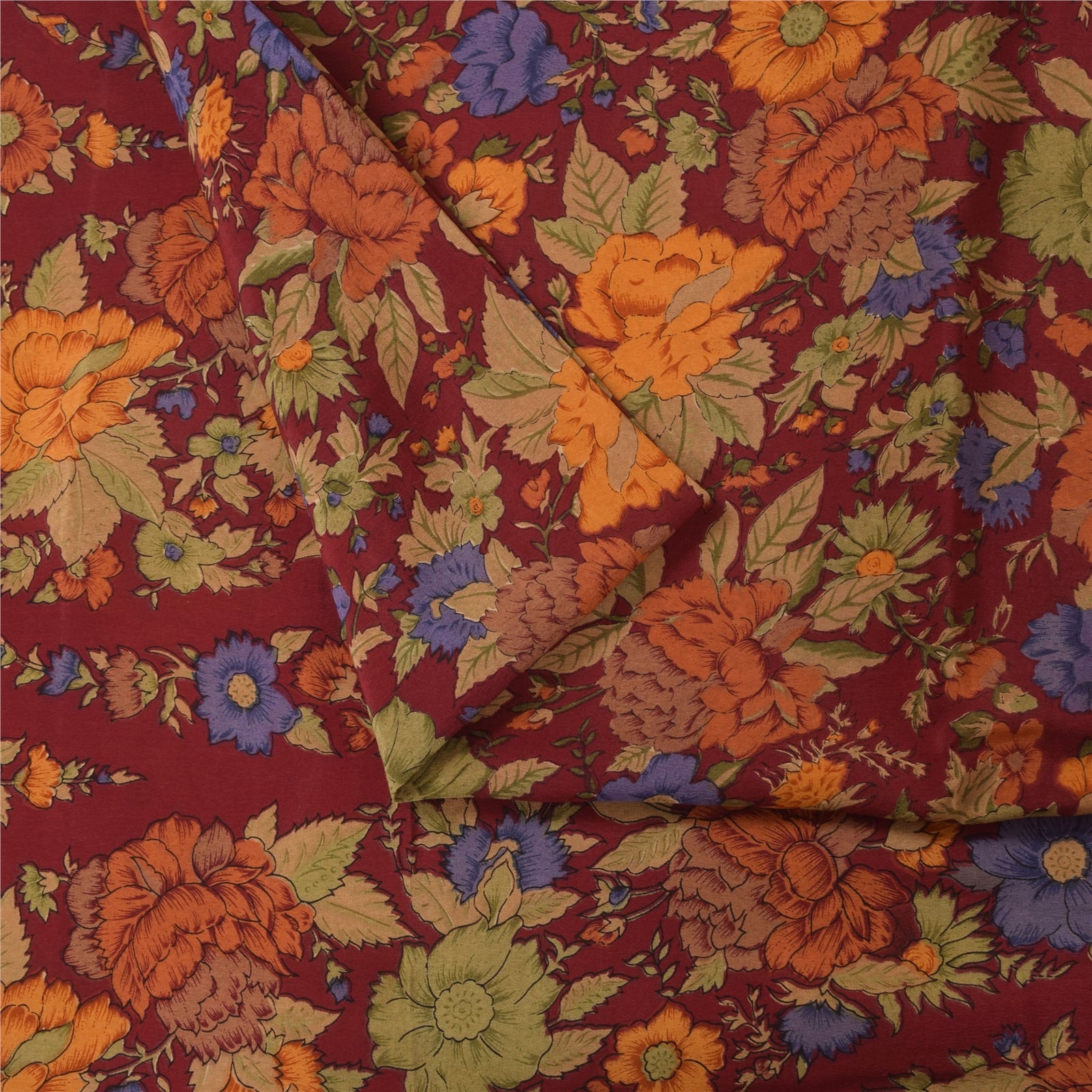 Sanskriti Vintage Sarees Dark Red Pure Crepe Silk Printed Sari 5+yd Craft Fabric