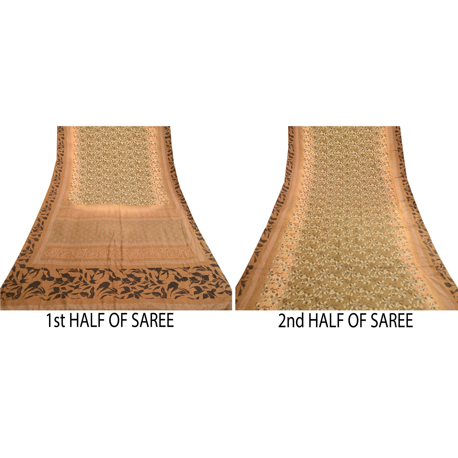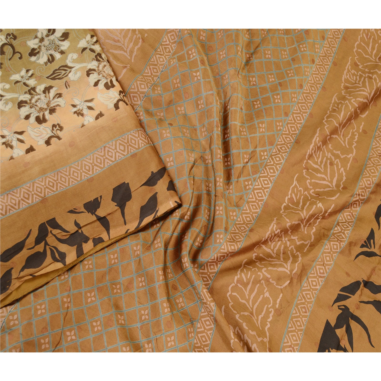 Beautiful shades of green & brown colored pure silk printed saree. Pallu & Border has printed floral design. Floral design in center part of saree. What is special about this saree? Fabulous design is really enhancing the beauty of the saree.This unique vintage saree can be used for various crafting ideas even if you don't want to use it as a sari. Design a dress, use it as window,dressing, upholstery, sarongs, throw, dress making and table linen much more. Let your creative juices flow and use this decorated Sustainable Fabric in multiple fashion.