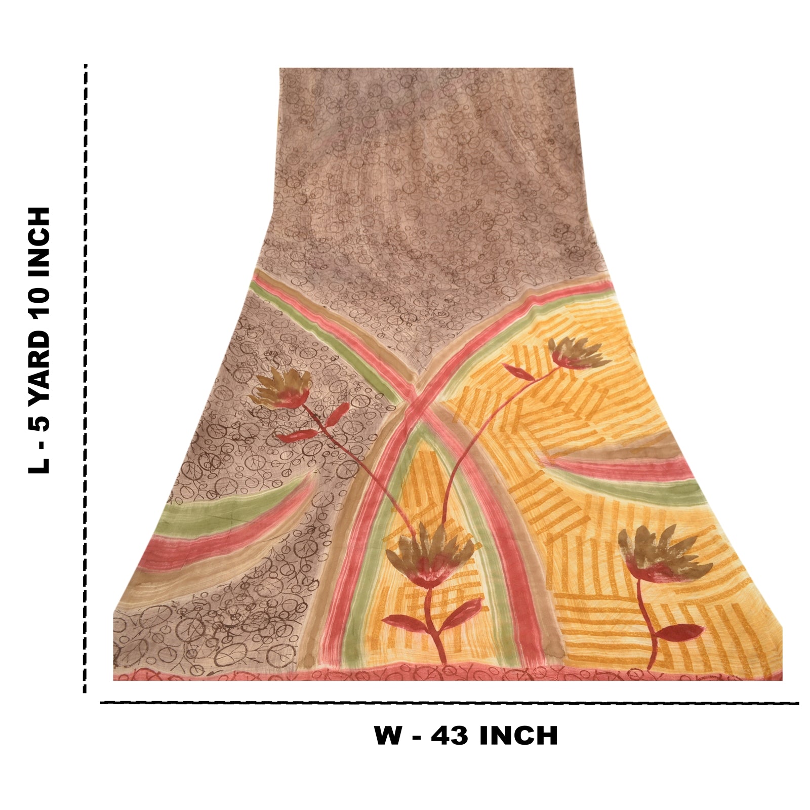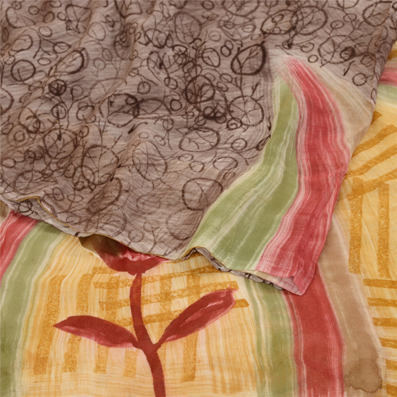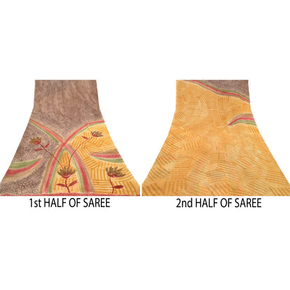 Beautiful gray & saffron colored blend georgette printed saree. Pallu & Border has printed floral design. Similar design in center part of saree. What is special about this saree? Brilliant design on soft Sustainable Fabric is really enhancing the beauty of the saree.This unique vintage saree can be used for various crafting ideas even if you don't want to use it as a sari. Design a dress, use it as a as window dressing, upholstery, sarongs, throw, dress making and table linen much more. Let your creative juices flow and use this decorated Sustainable Fabric in multiple fashion.