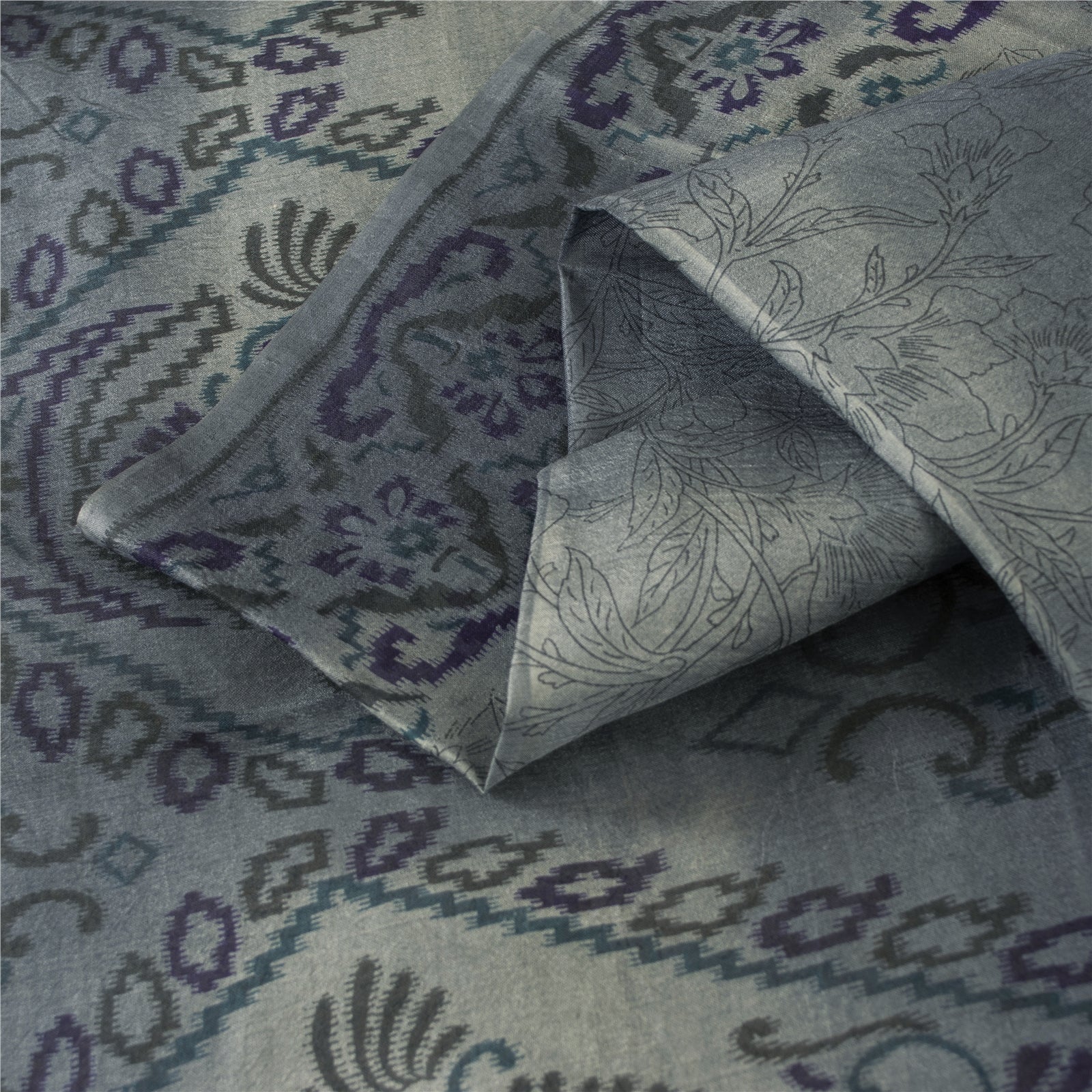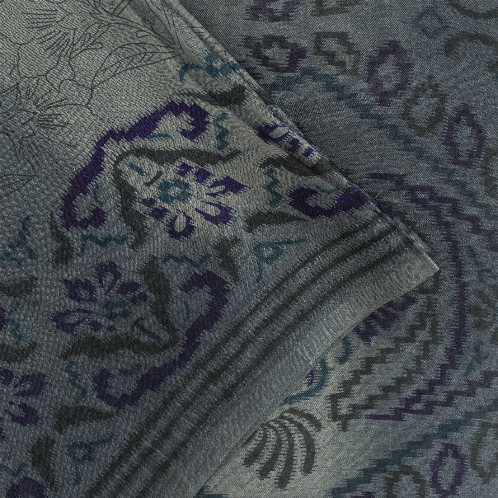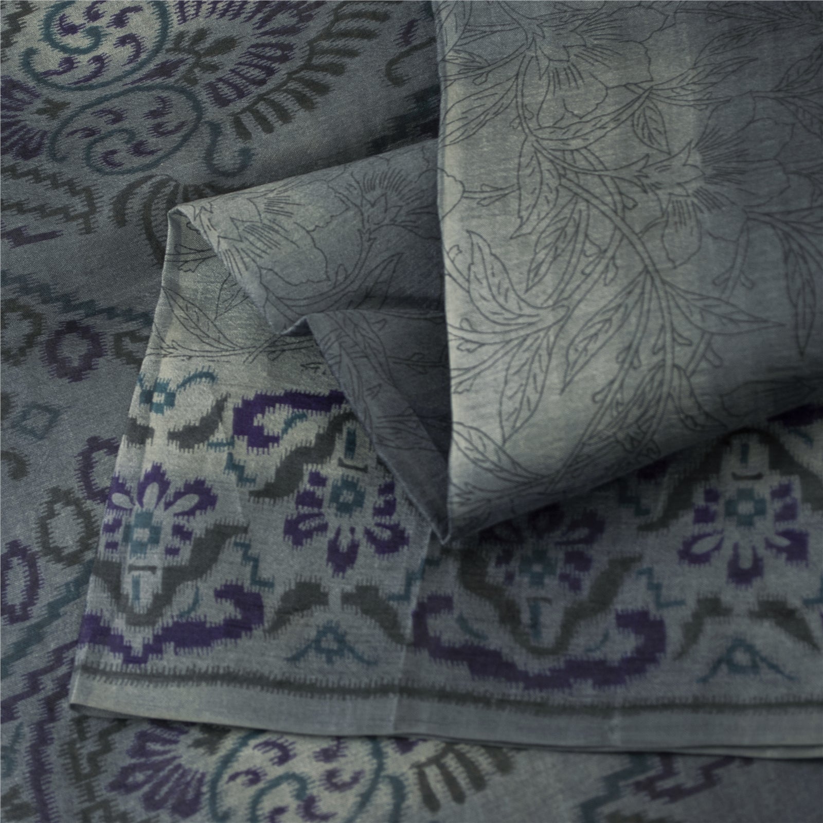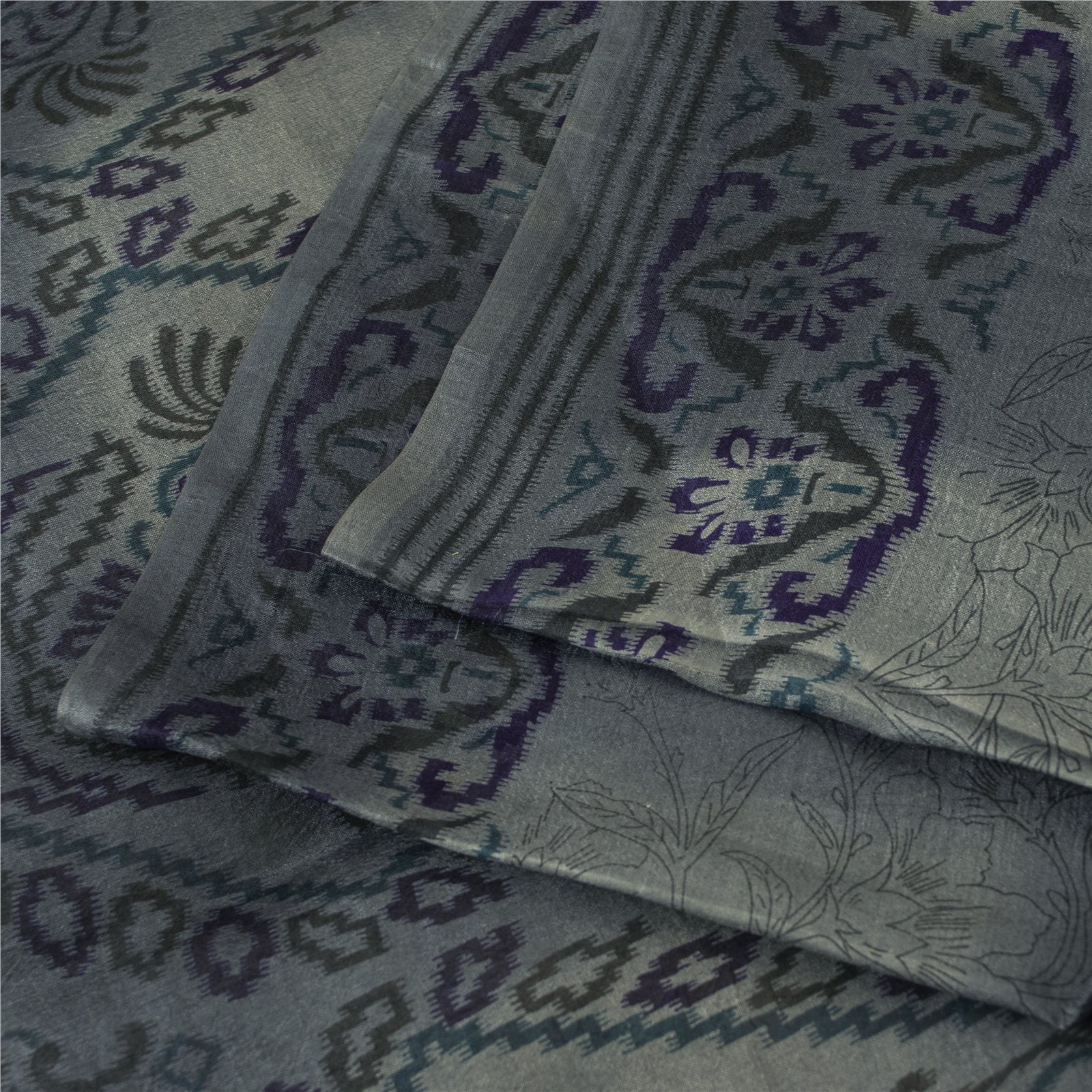 Sanskriti Vintage Sarees Gray Pure Silk Floral Print 5+yd Sari For DIY Projects