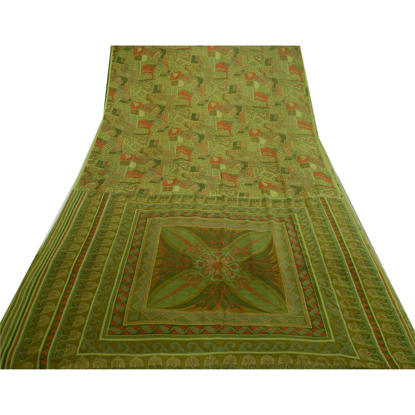 Sanskriti Vintage Sarees Green Indian Printed 100% Pure Silk Sari Craft Sustainable Fabric