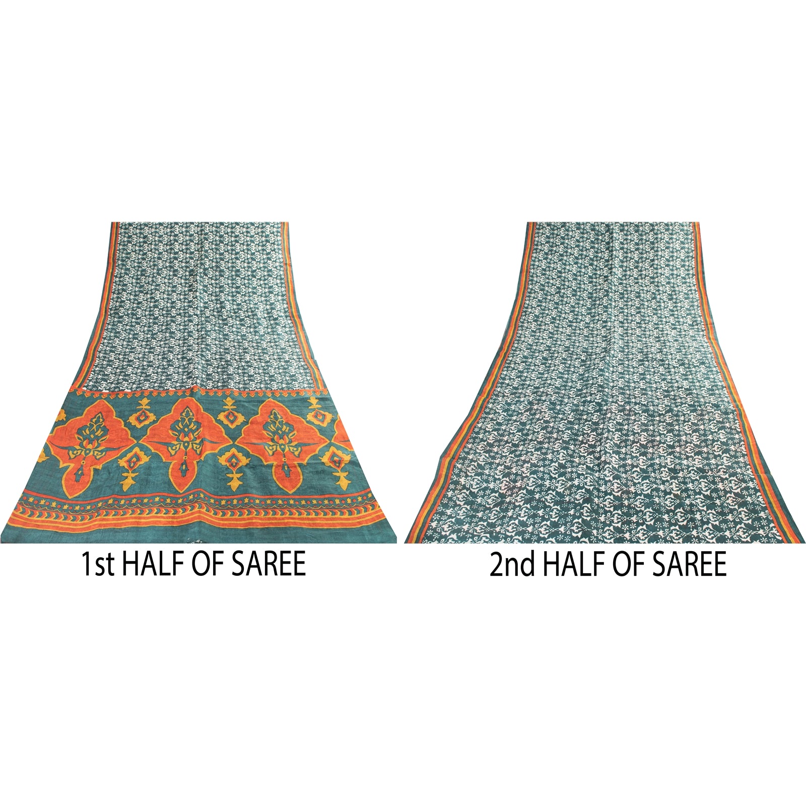 Sanskriti Vintage Sarees Green Indian Pure Silk Printed Sari 5+yd Craft Fabric