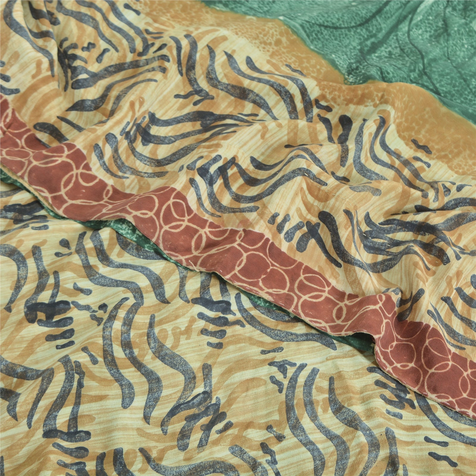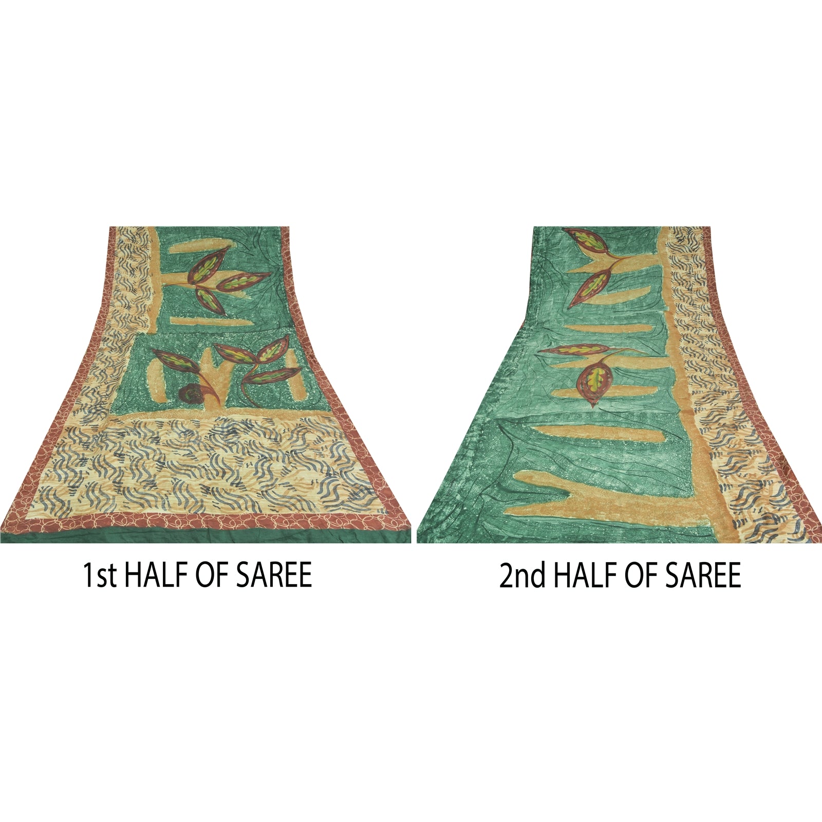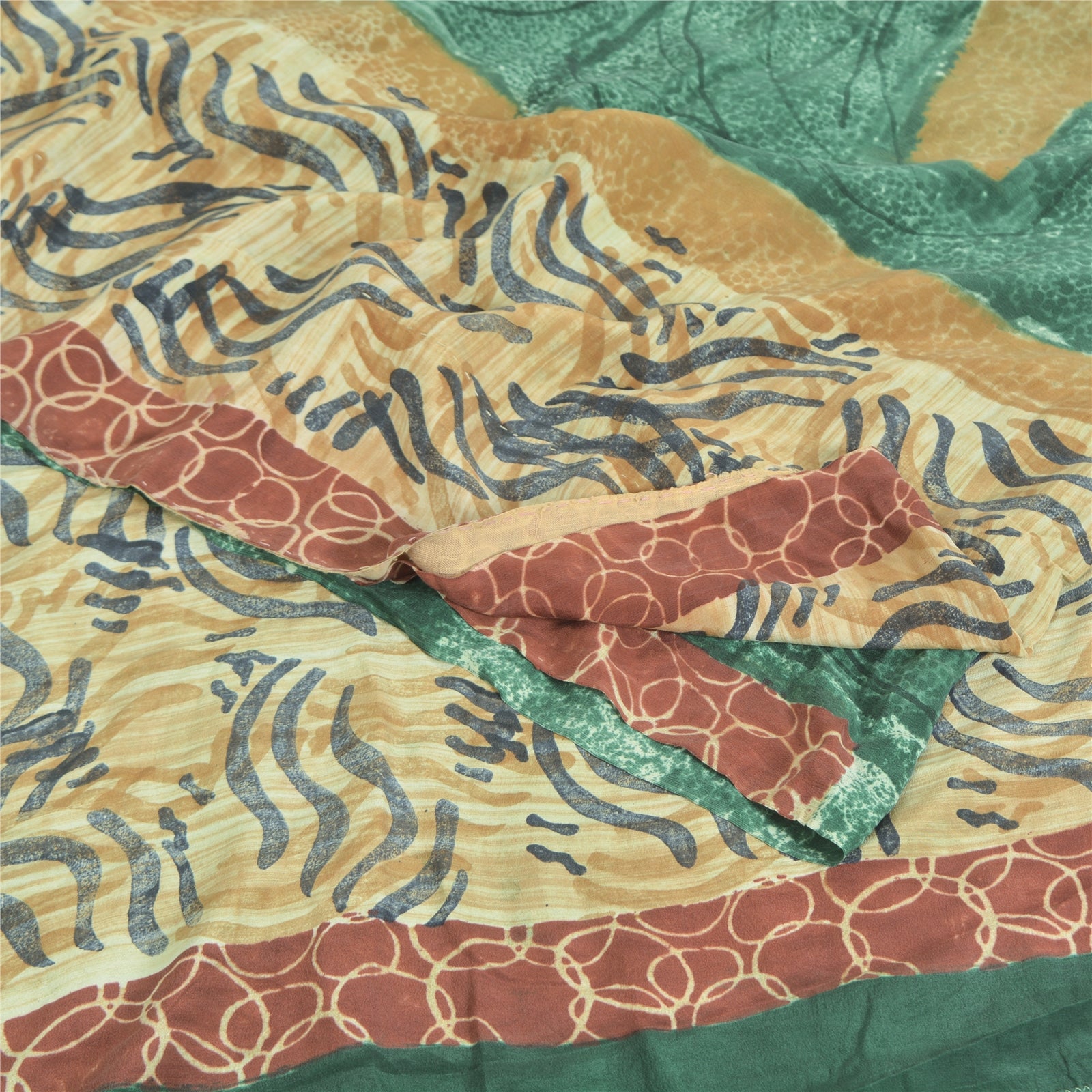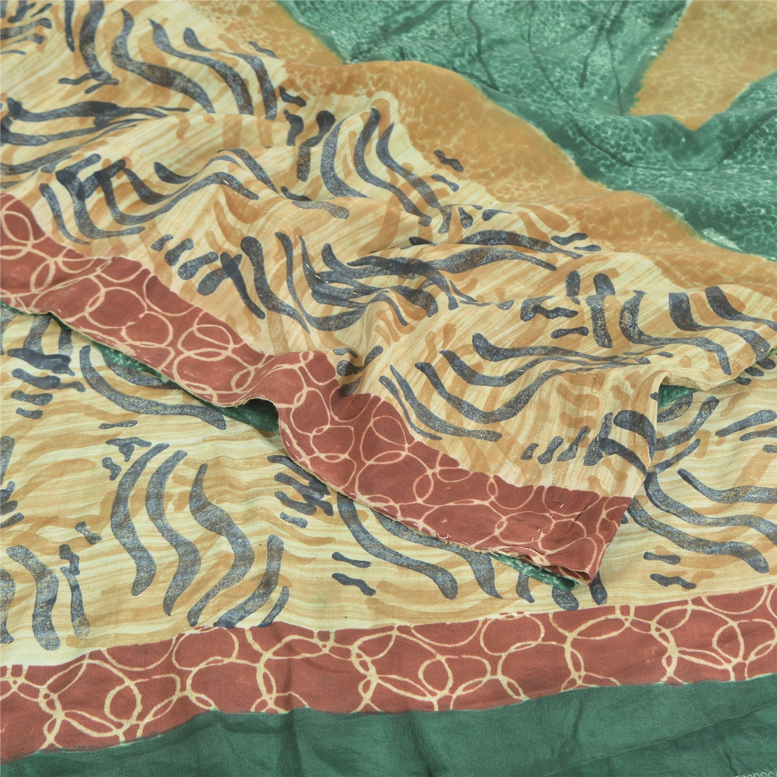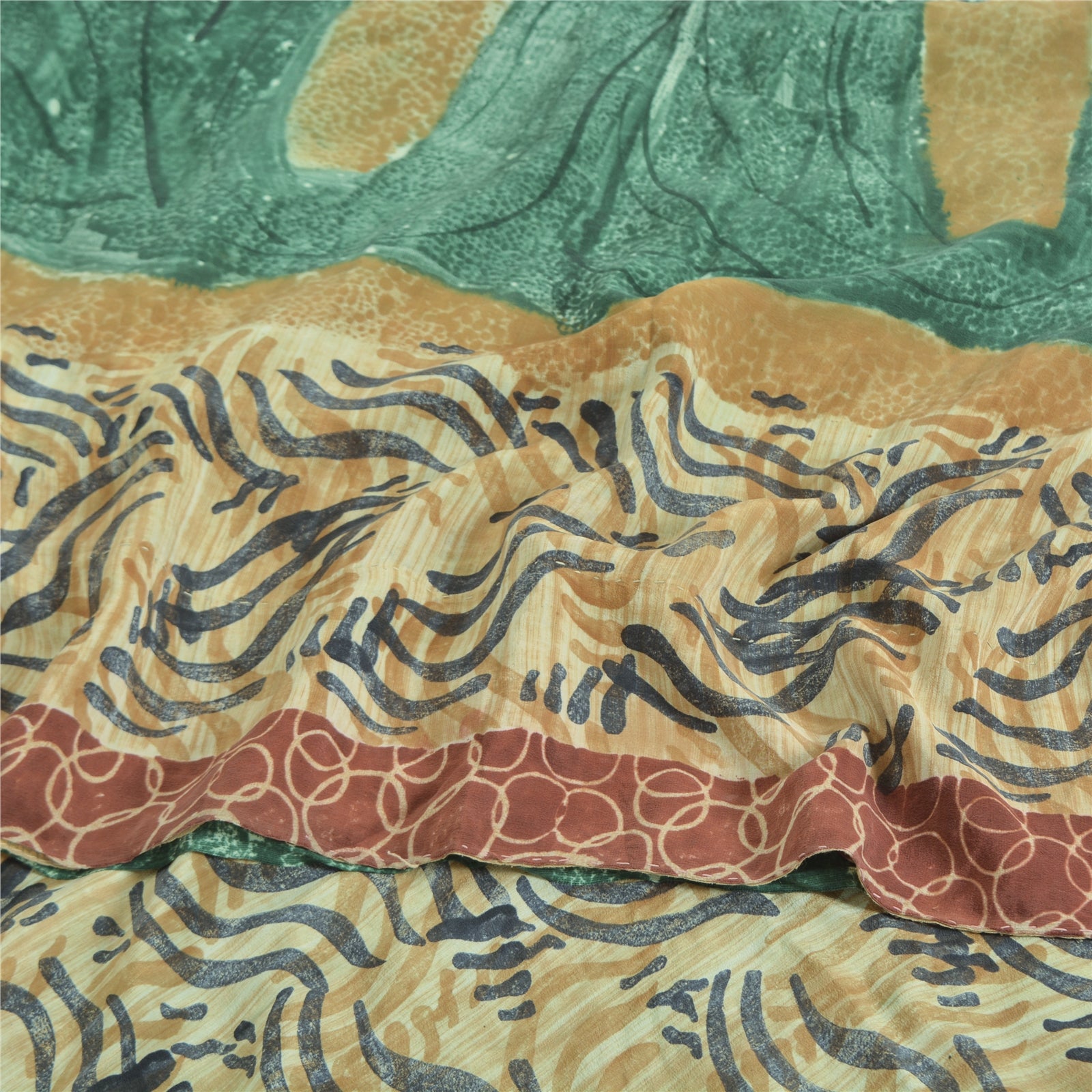 Sanskriti Vintage Sarees Green/Ivory Pure Crepe Silk Printed Sari 5yd Sustainable Fabric