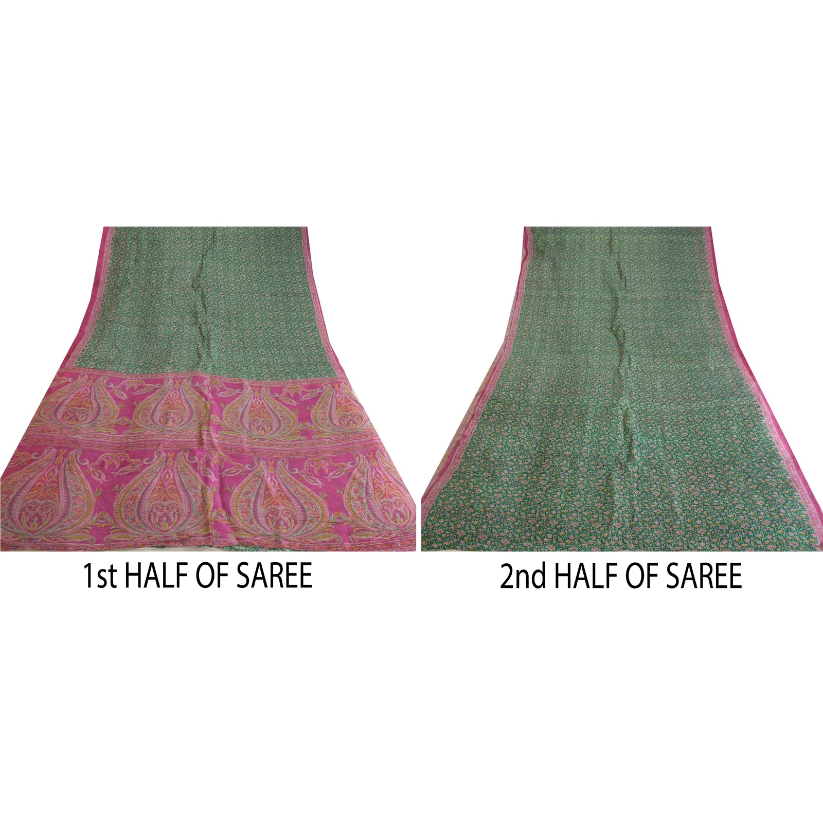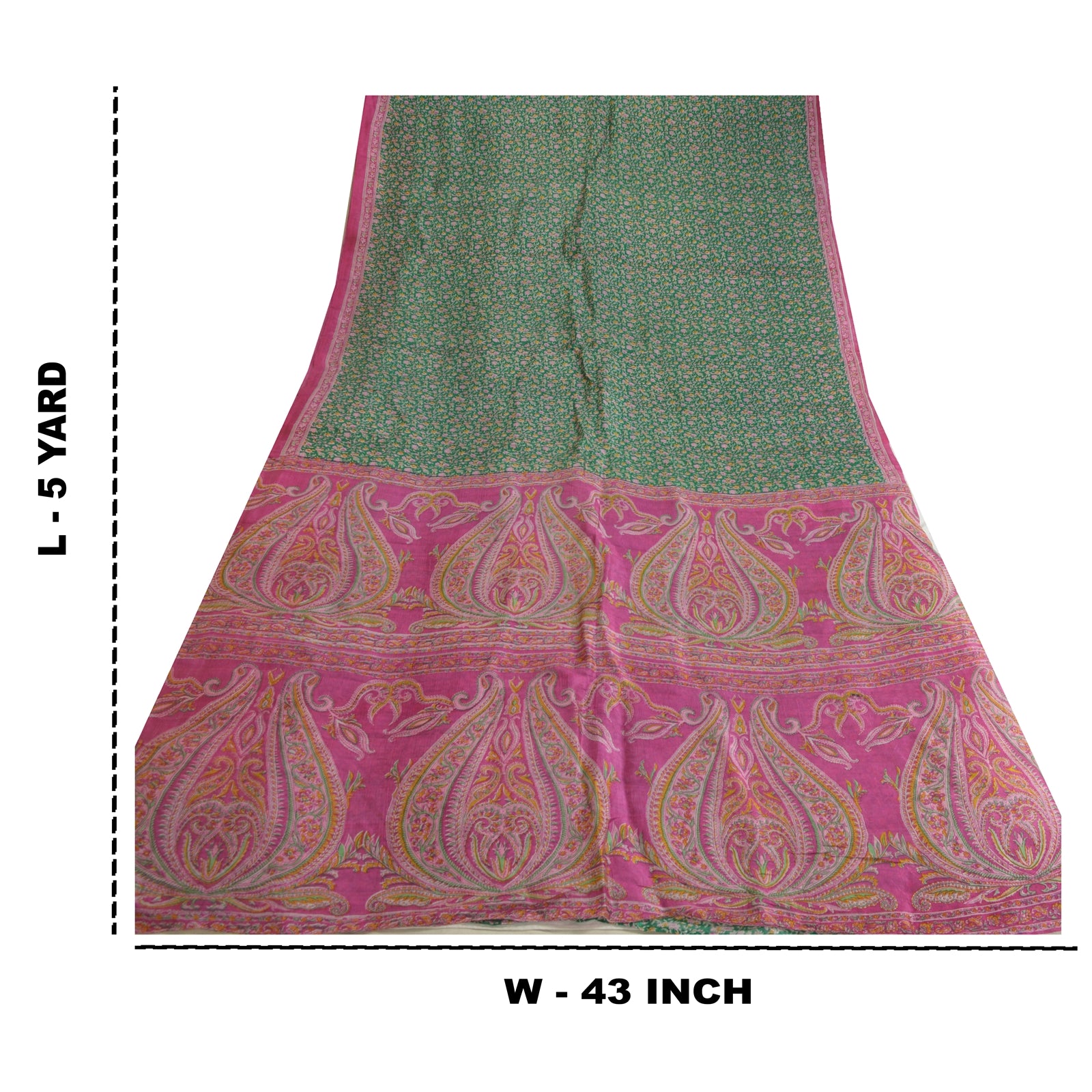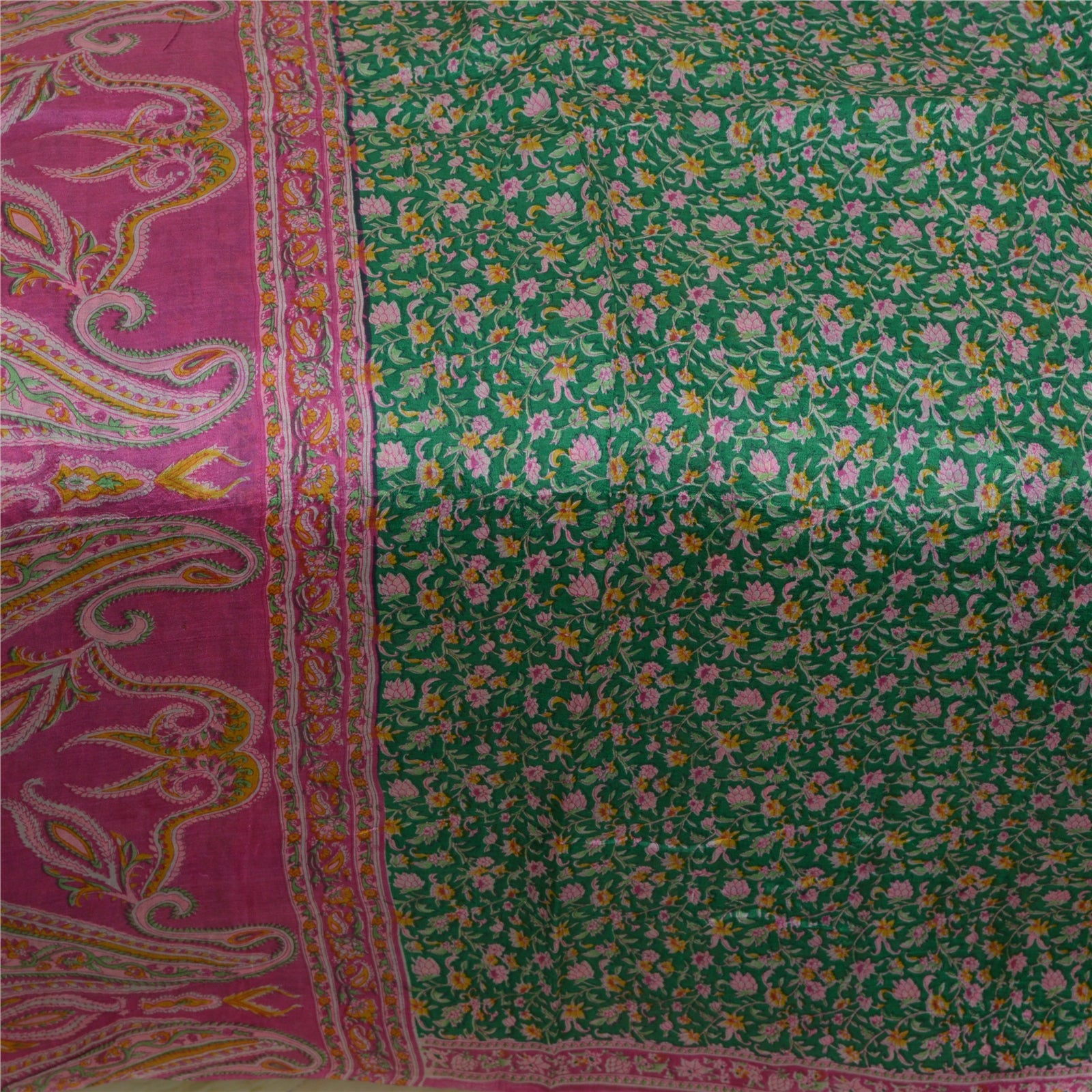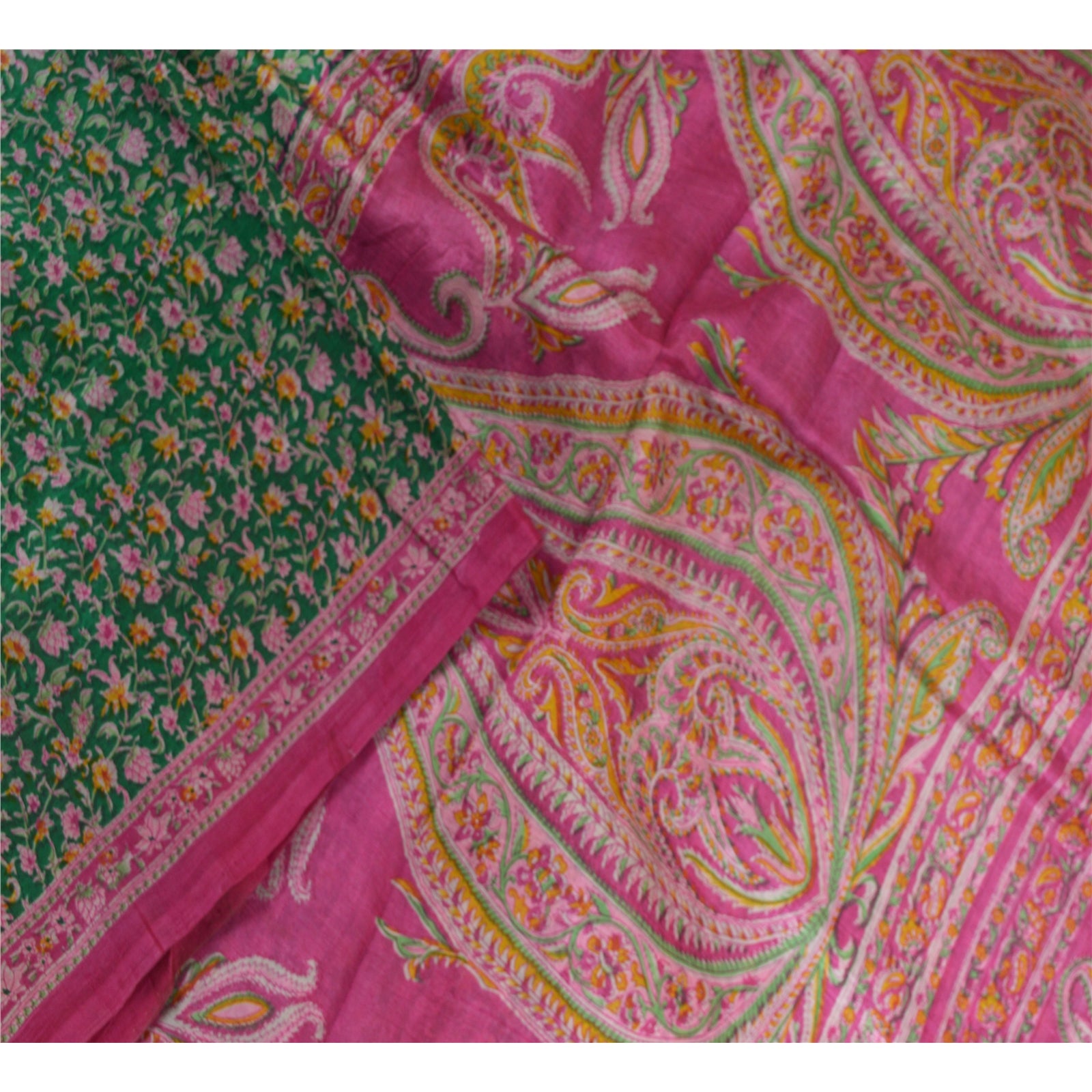 Sanskriti Vintage Sarees Green/Pink Pure Silk Printed Sari Soft 5yd Craft Sustainable Fabric