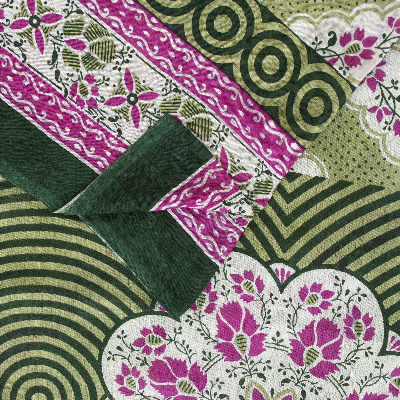 Sanskriti Vintage Sarees Green Pure Cotton FloralPrint 5+yd Sari Indian Material