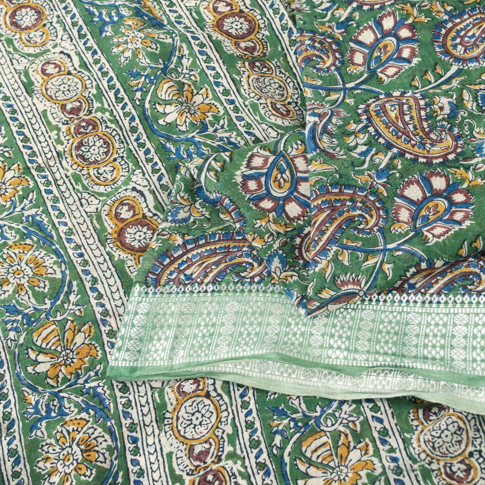 Beautiful green colored pure cotton hand block printed kalamkari saree with floral design on pallu, border, & center part. Woven work on borders. Uses-Crafting, Repurpose, Breathable fabric, Creative Sewing Project, Dressmaking, Kaftans, Use It As A Sari, Window Dressing, Upcycling, Sarongs, Throw,Table Linen,Decorative Fabric, Sustainable Indian Fabric. THE ITEM COLOR OR SHADE MAY BE DARKER OR LIGHTER THAN THE PICTURE.' International buyers please note: Import duties, taxes, and charges are not included in the item price or postage cost. Buyer will pay custom duty/tax,VAT, and any applicable charges at the time of delivery. PCS-7273