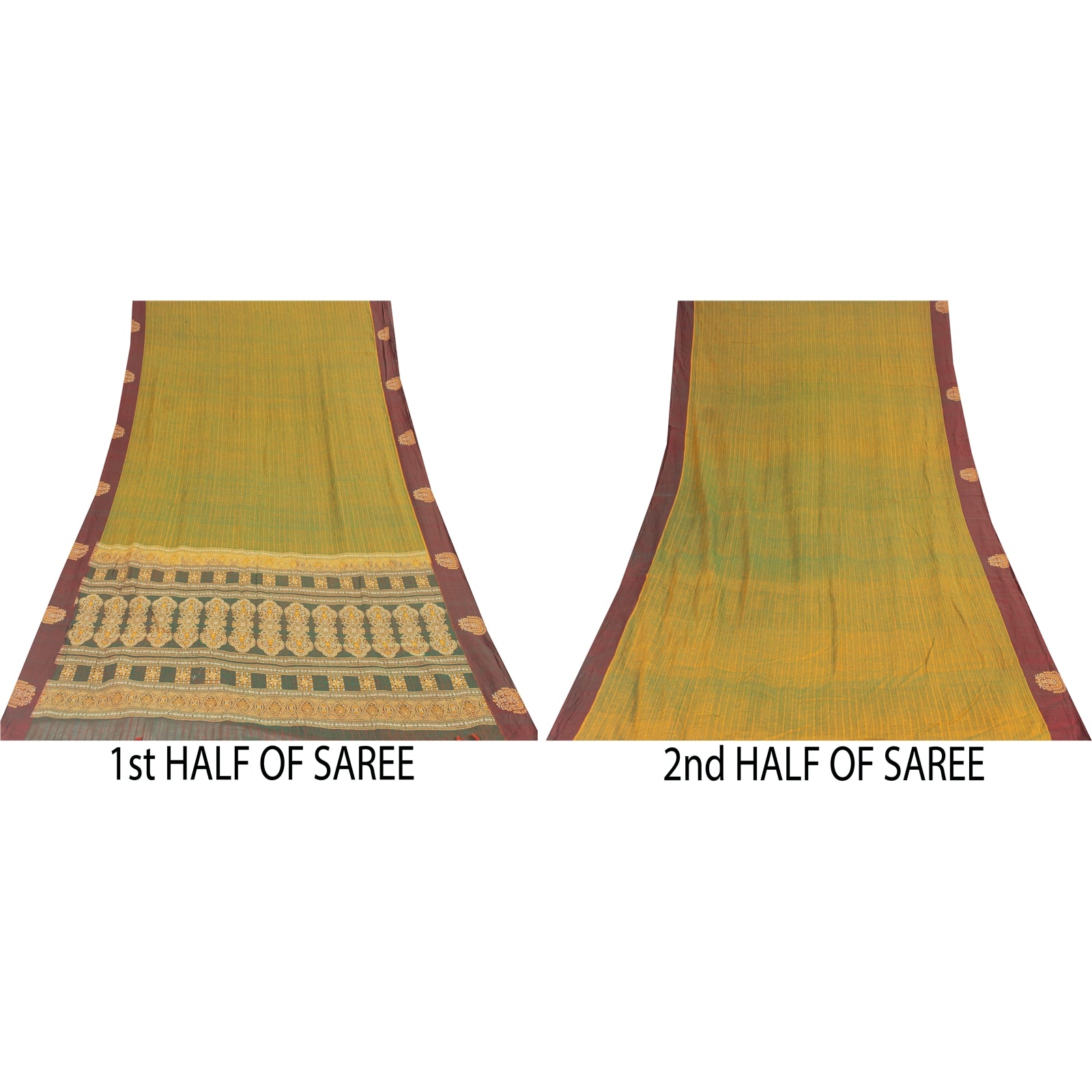 Sanskriti Vintage Sarees Green Pure Cotton Lines Printed Sari 5+yd Craft Fabric