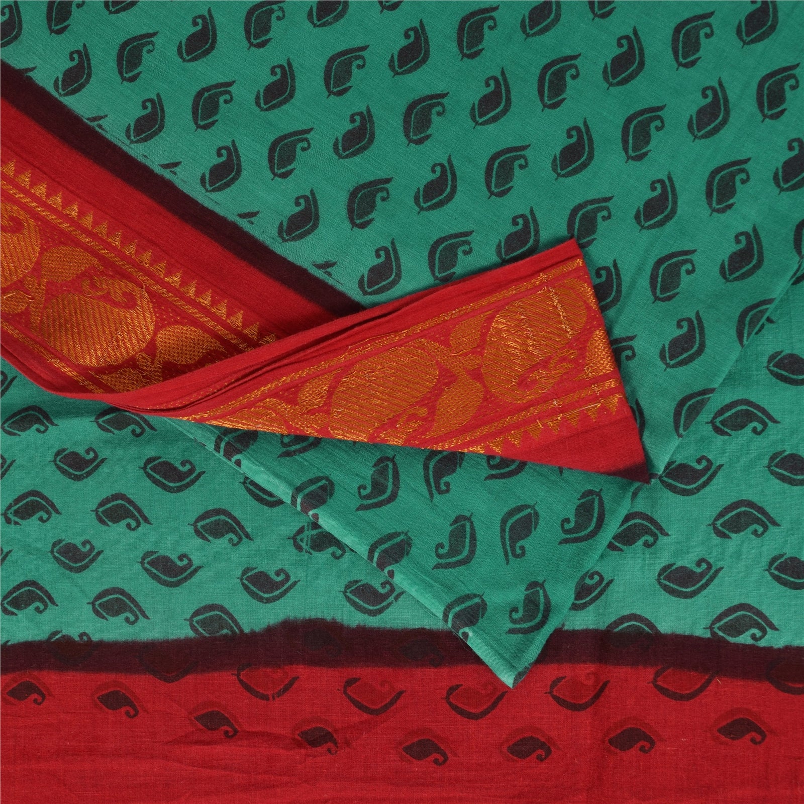 THE ITEM COLOR OR SHADE MAY BE DARKER OR LIGHTER THAN THE PICTURE. Attractive green colored pure cotton printed & zari woven sari. Pallu & Border has floral & lines design with golden woven work. Printed floral design in center part of saree.. This unique vintage saree can be used for various crafting ideas even if you don't want to use it as a sari. Design a dress, use it as a as window dressing, upholstery, sarongs, throw, dress making and table linen much more. Let your creative juices flow and use this decorated Sustainable Fabric in multiple fashion. Shipping Note: 'International buyers please note: Import duties, taxes, and charges are not included in the item price or postage cost. These charges are the buyer's responsibility. Please check with your country's customs office to determine what these additional costs will be prior to bidding or buying. Buyer will pay custom duty/tax. It is calculated and charged differently by every country. As a seller I do not have any control over it. VAT or sales tax is calculated by the platform at the time of checkout. Customs charge is payable at the time of delivery.' PCS-6728