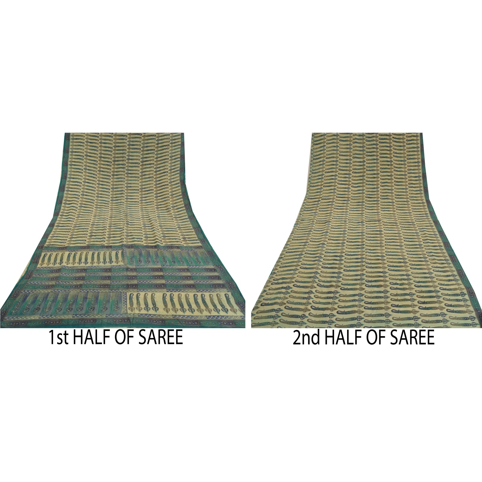 Sanskriti Vintage Sarees Green Pure Crepe Silk Paisley Printed Sari Craft Sustainable Fabric