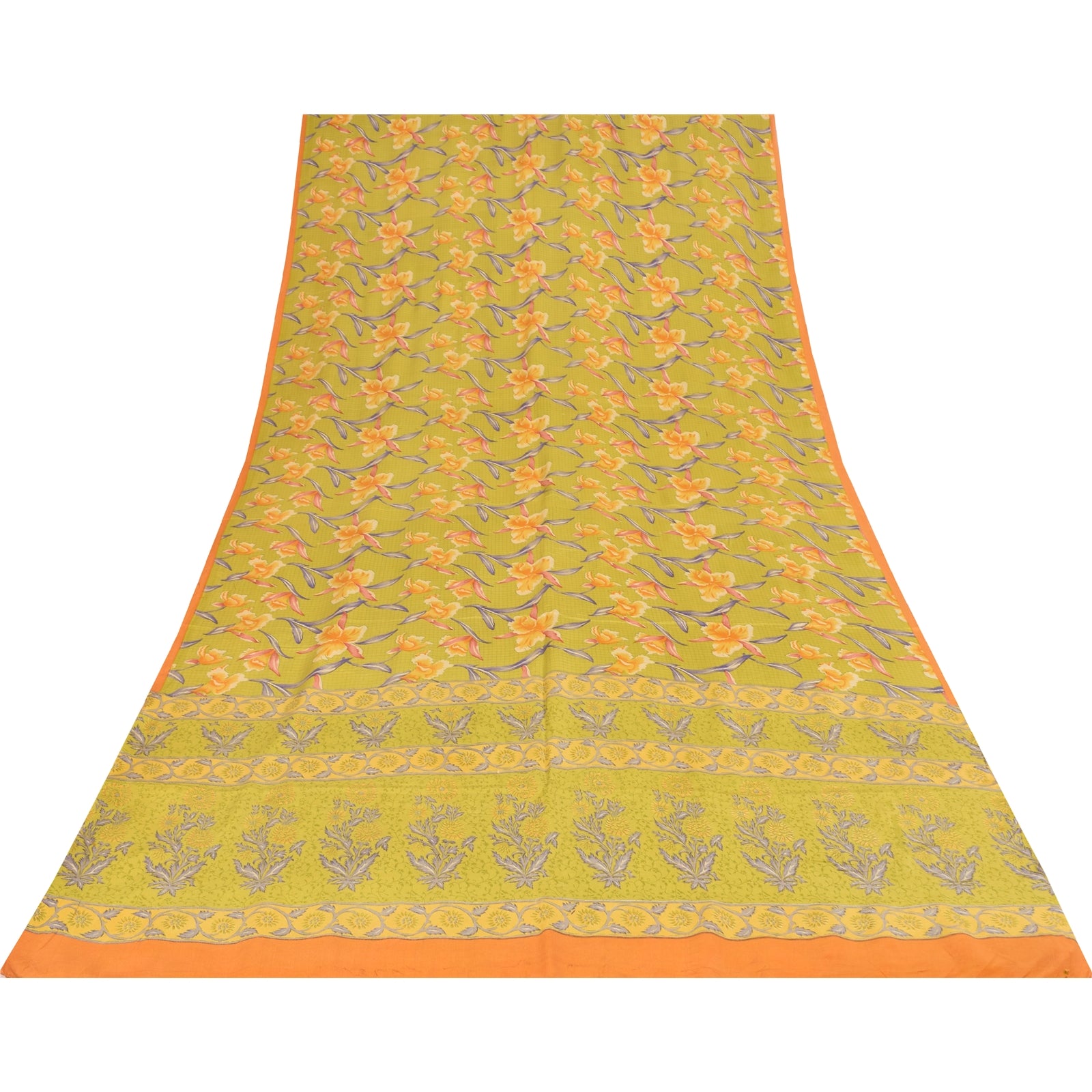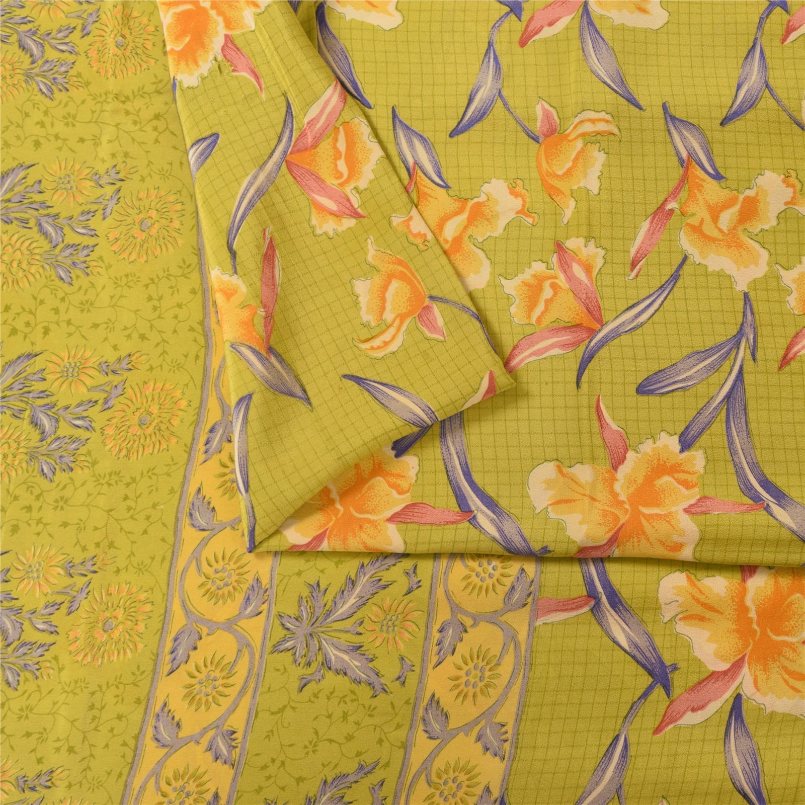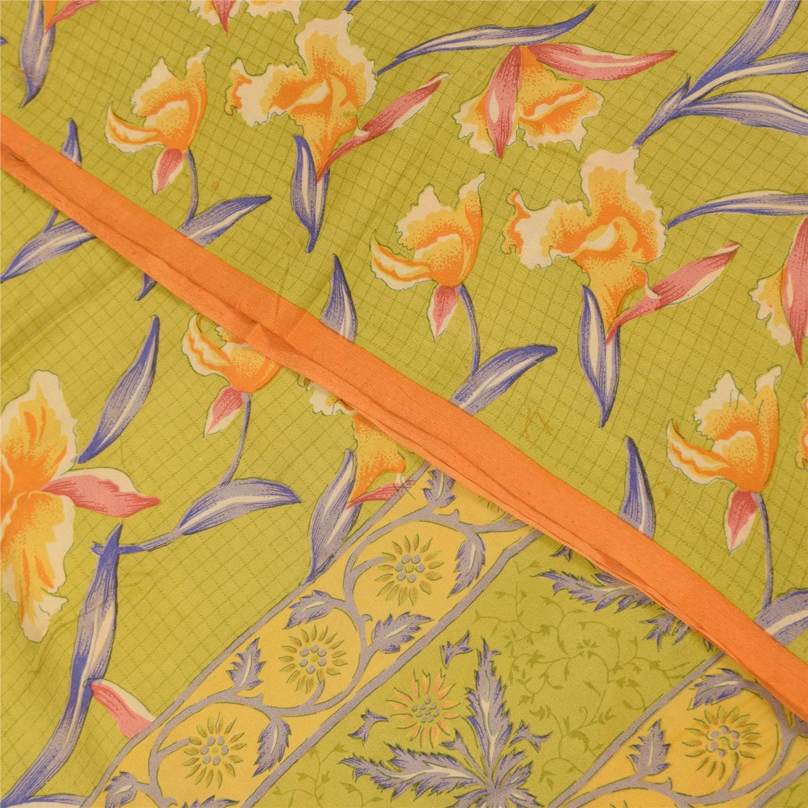 Sanskriti Vintage Sarees Green Pure Crepe Silk Printed Sari 5+yd Craft Fabric