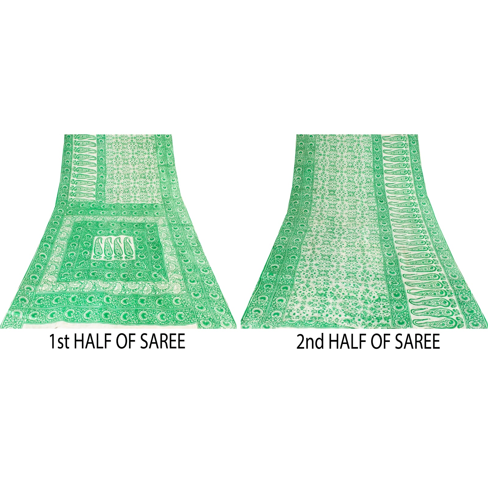 Sanskriti Vintage Sarees Green & White Kalamkari Pure Cotton Printed Sari Fabric
