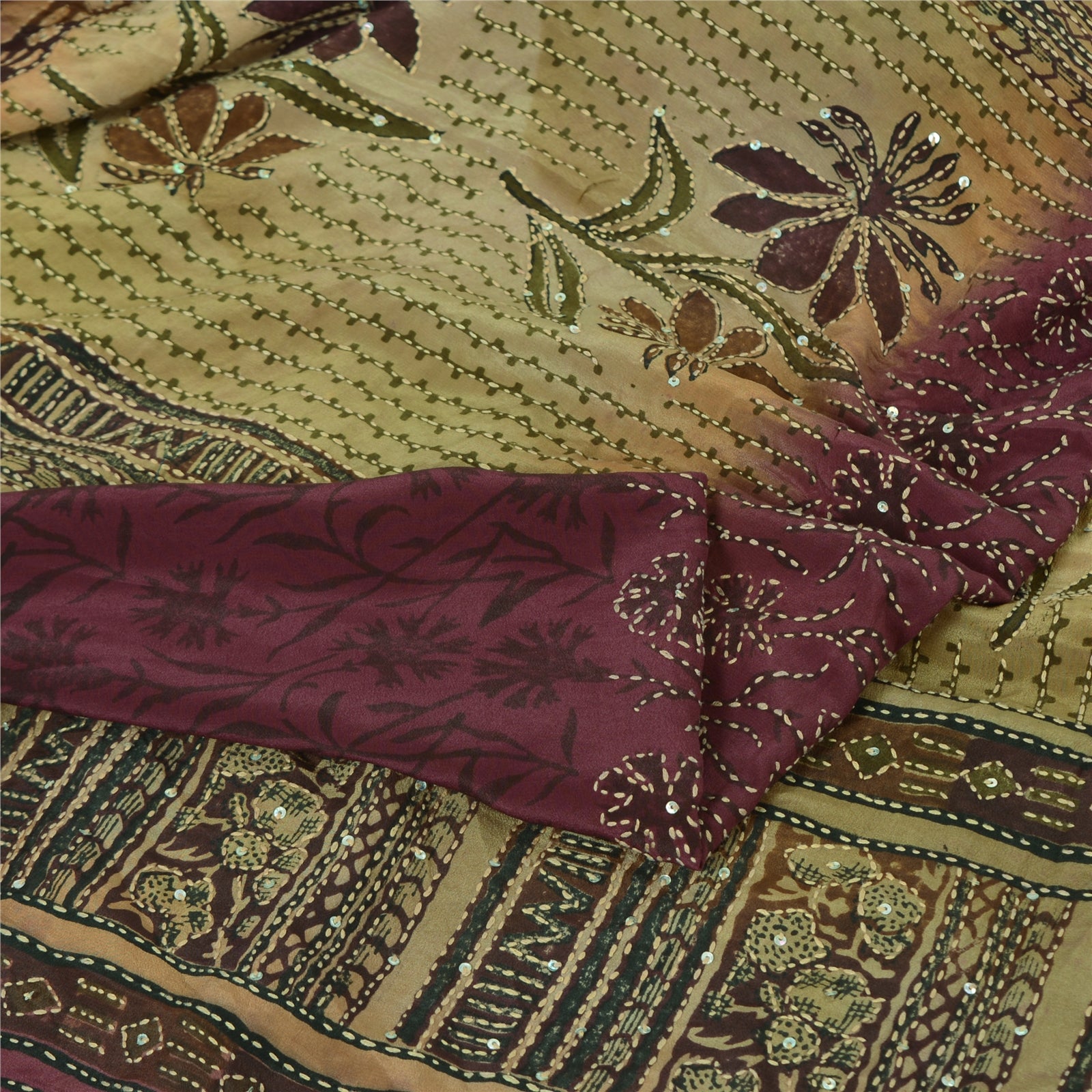 Sanskriti Vintage Sarees Handmade Kantha Wine/Cream Pure Crepe Print Sari Sustainable Fabric