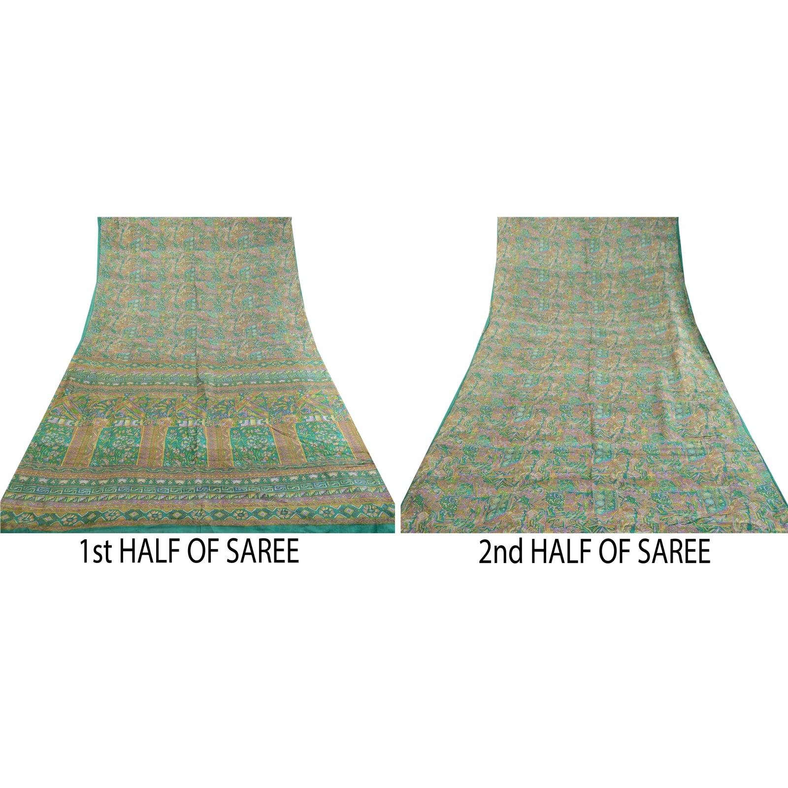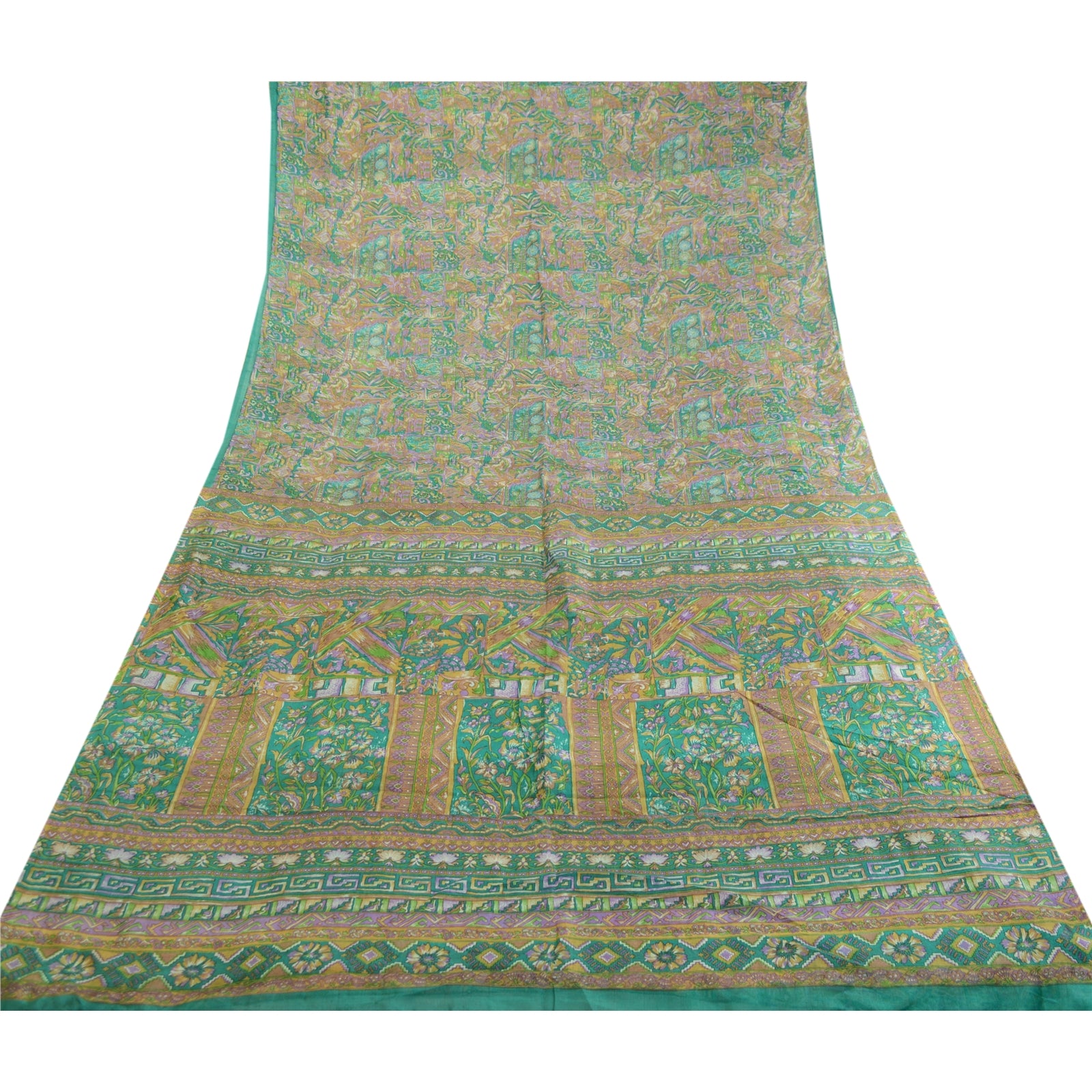 Sanskriti Vintage Sarees Indian Green 100% Pure Silk Printed Sari Craft Sustainable Fabric