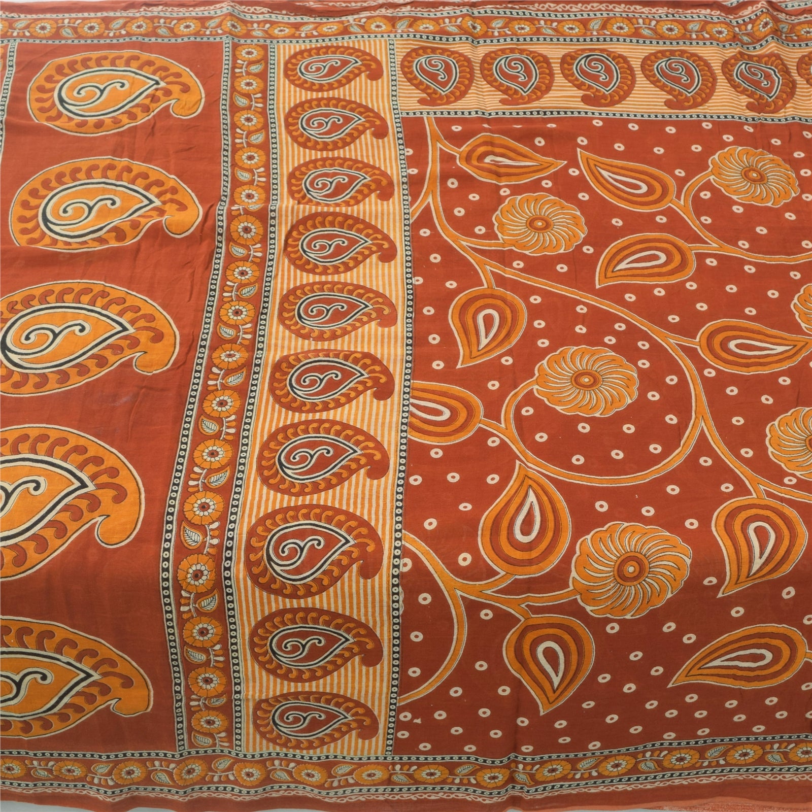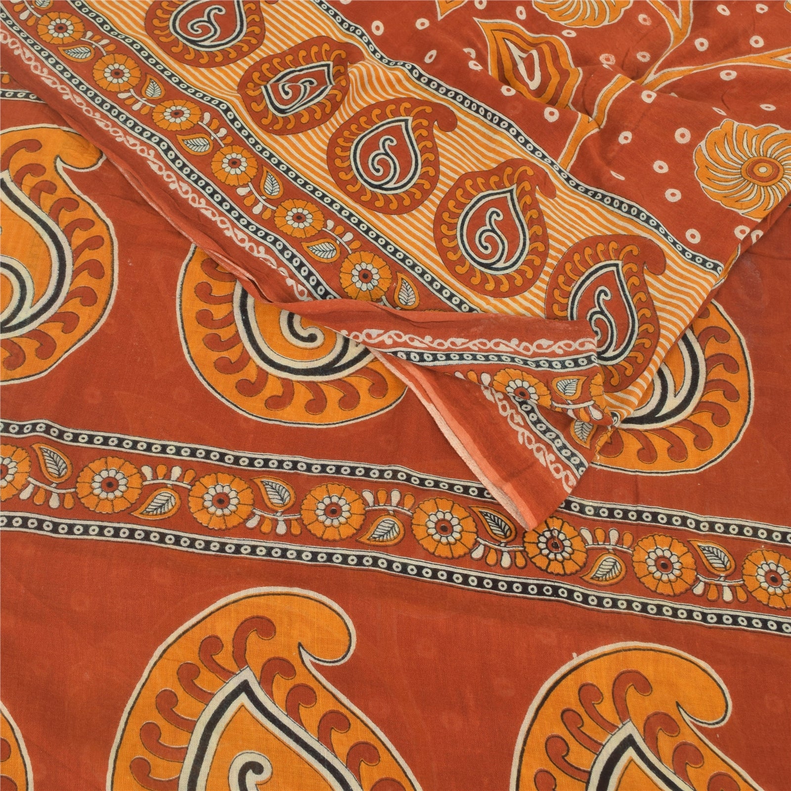 THE ITEM COLOR OR SHADE MAY BE DARKER OR LIGHTER THAN THE PICTURE. Attractive orange colored pure cotton printed sari. Pallu & Border has printed floral & paisley design. Similar design in center part of saree.. This unique vintage saree can be used for various crafting ideas even if you don't want to use it as a sari. Design a dress, use it as a as window dressing, upholstery, sarongs, throw, dress making and table linen much more. Let your creative juices flow and use this decorated Sustainable Fabric in multiple fashion. Shipping Note: 'International buyers please note: Import duties, taxes, and charges are not included in the item price or postage cost. These charges are the buyer's responsibility. Please check with your country's customs office to determine what these additional costs will be prior to bidding or buying. Buyer will pay custom duty/tax. It is calculated and charged differently by every country. As a seller I do not have any control over it. VAT or sales tax is calculated by the platform at the time of checkout. Customs charge is payable at the time of delivery.'