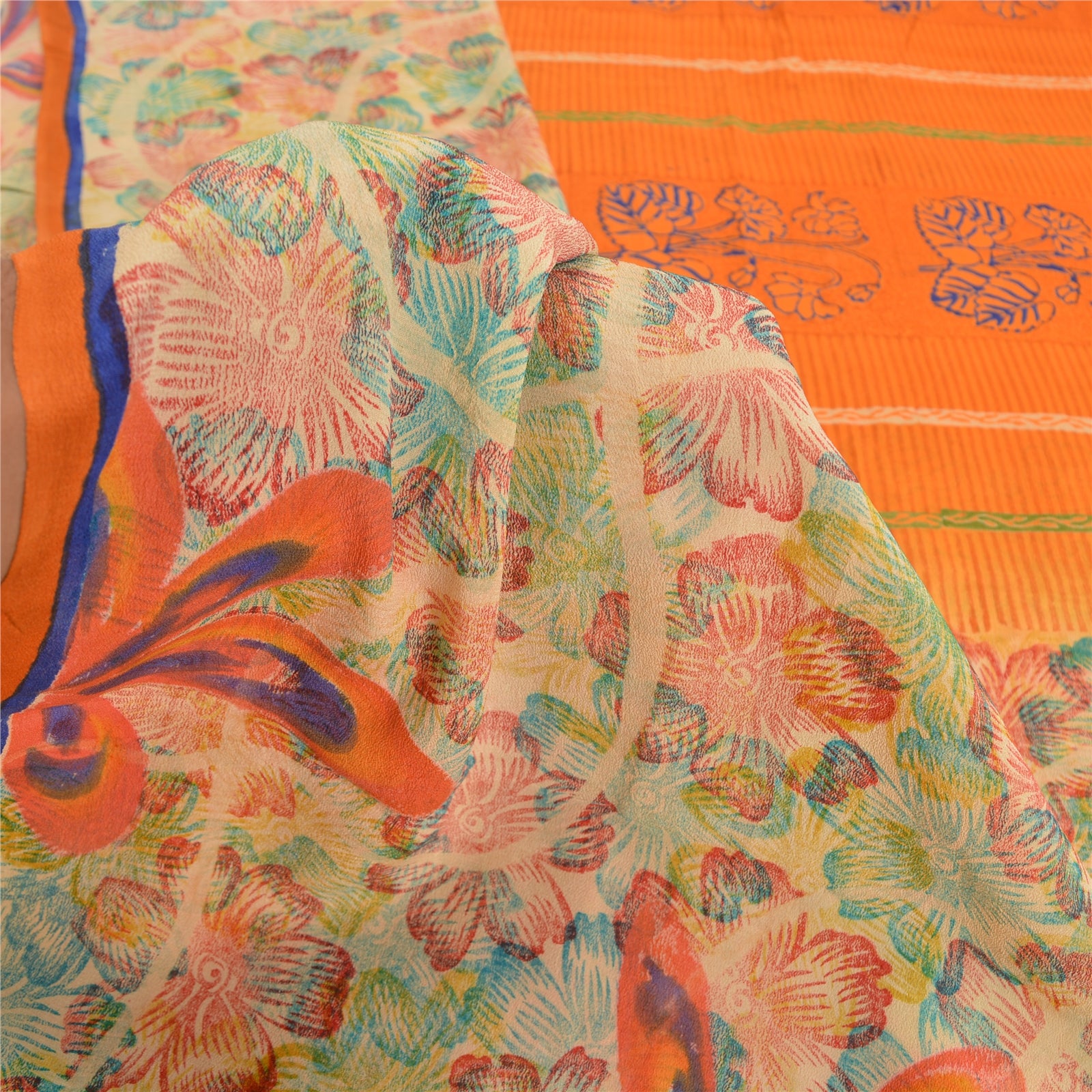 Sanskriti Vintage Sarees Indian Orange Pure Crepe Silk Printed Sari Craft Sustainable Fabric