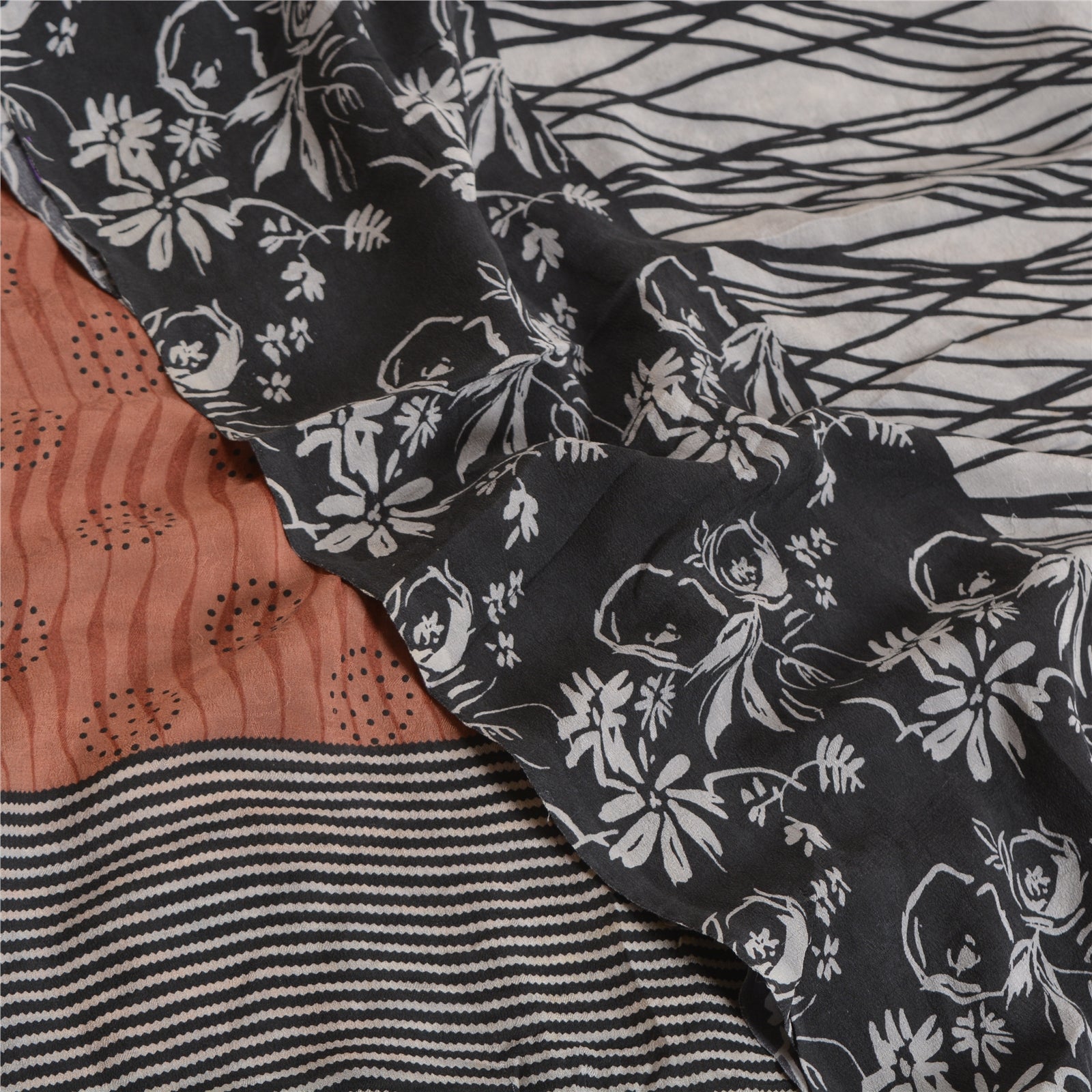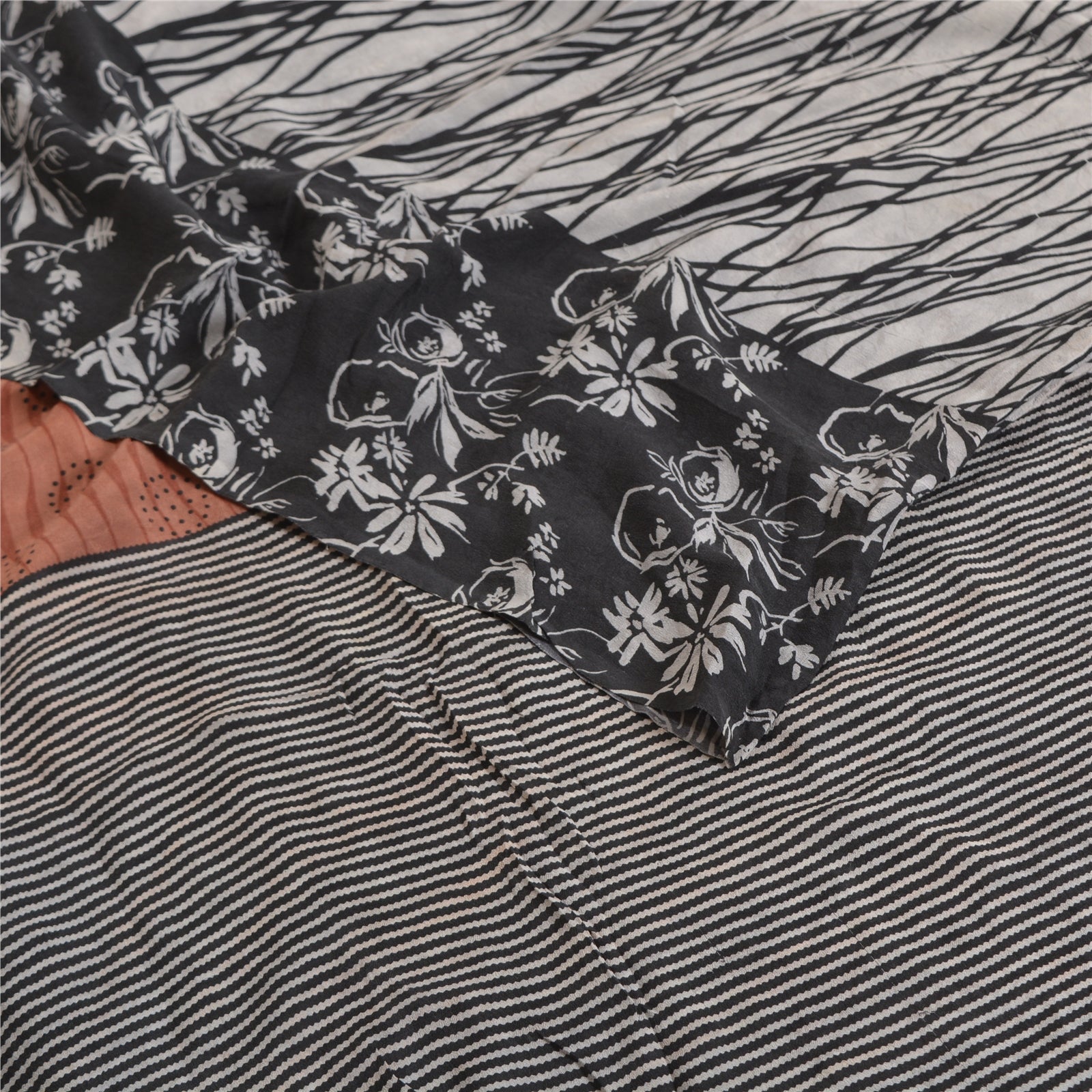 Sanskriti Vintage Sarees Ivory 100% Pure Crepe Silk Printed Sari Craft Sustainable Fabric