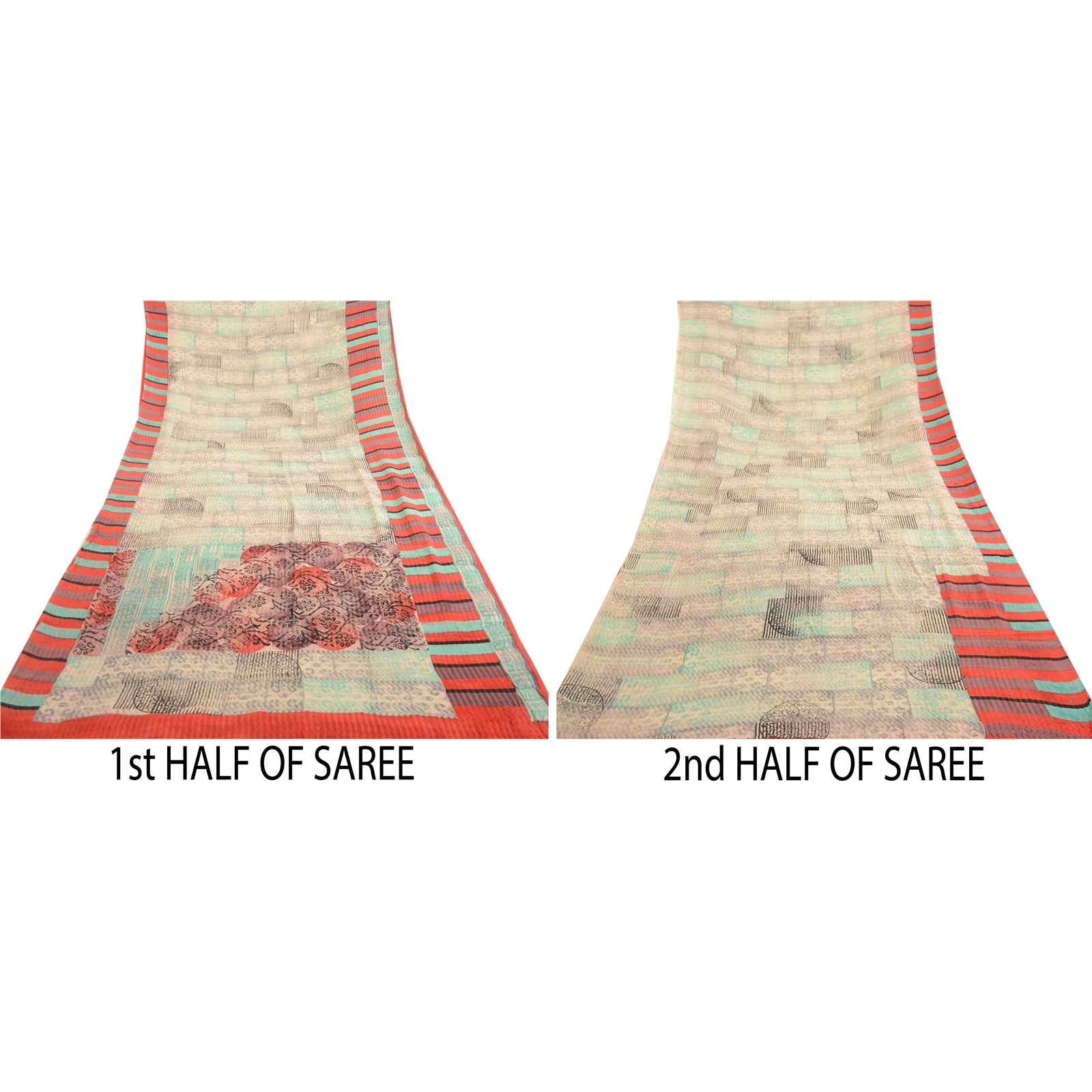 Sanskriti Vintage Sarees Ivory Block Print Woven Pure Georgette Silk Sari Sustainable Fabric