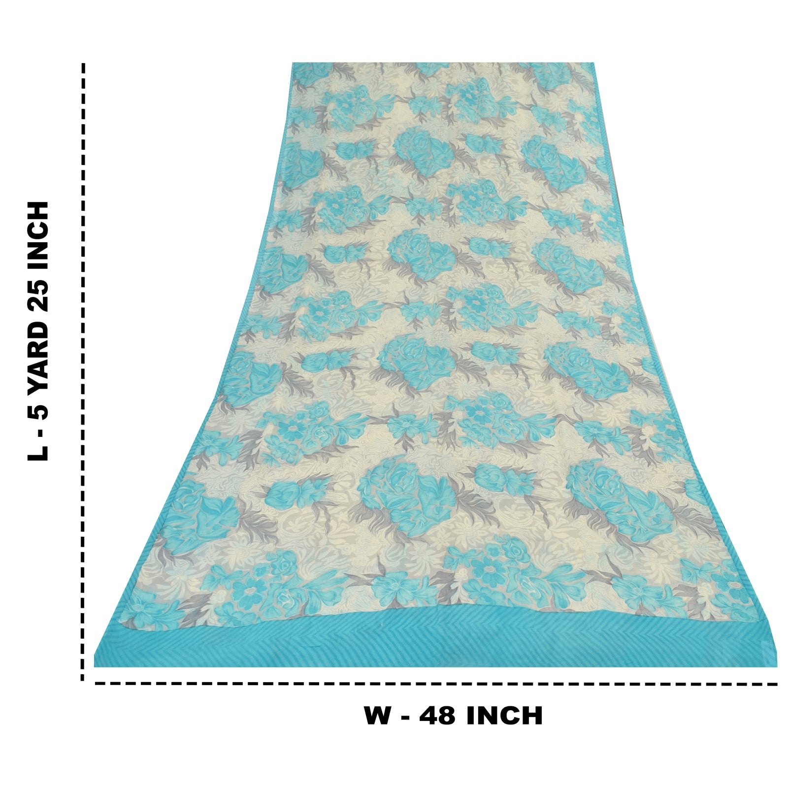Sanskriti Vintage Sarees Ivory/Blue Pure Georgette Silk Printed Sari 5+yd Sustainable Fabric