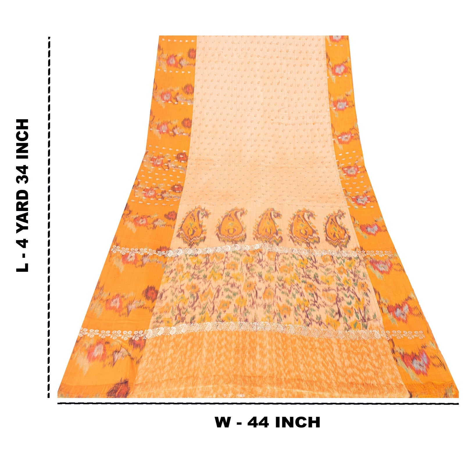 Sanskriti Vintage Sarees Ivory Brocade Zari & Ikat Woven Pure Silk Sari Fabric