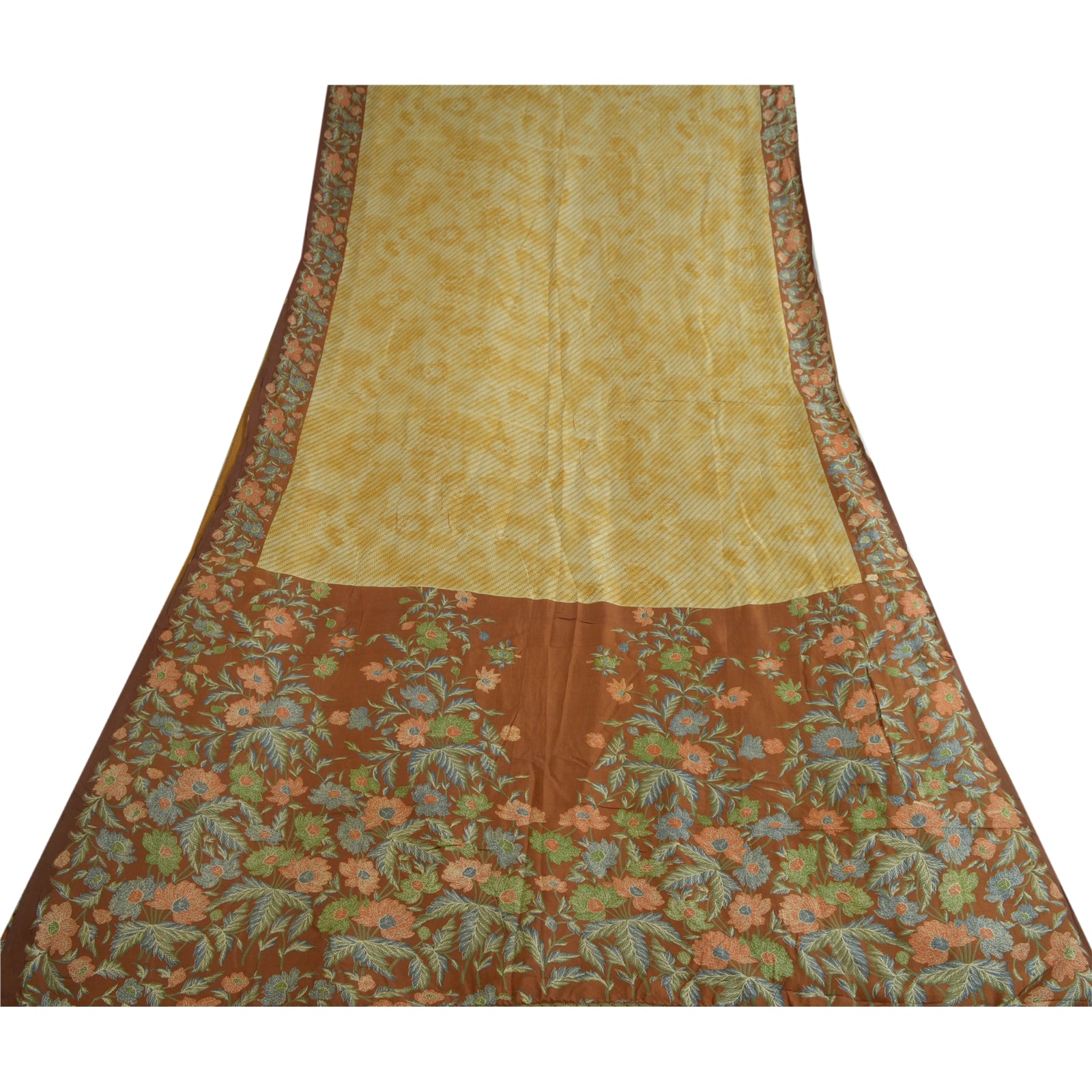 Sanskriti Vintage Sarees Ivory/Brown Pure Silk Printed Sari Floral Craft Sustainable Fabric
