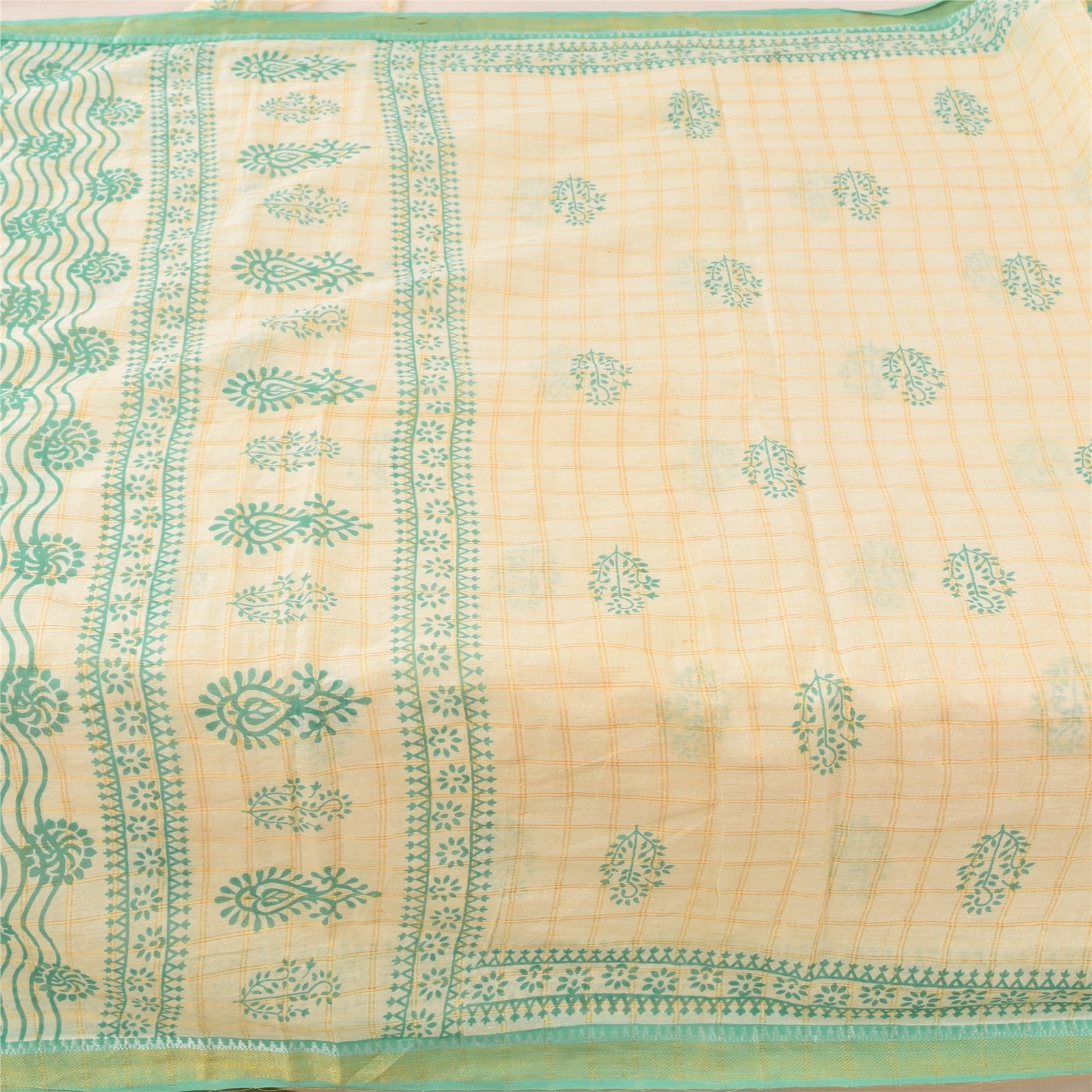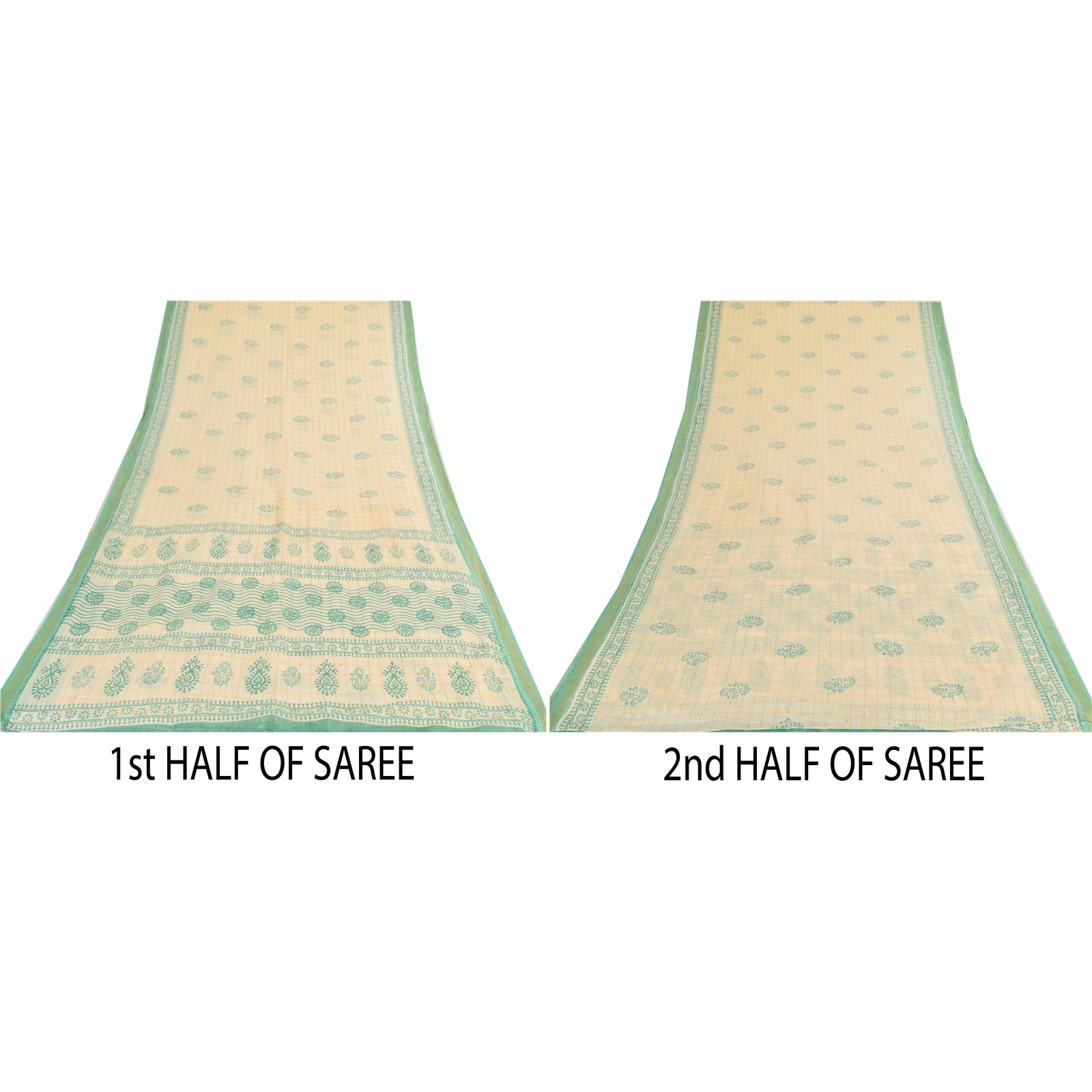 Sanskriti Vintage Sarees Ivory/Green Hand Block Printed Pure Cotton Sari Sustainable Fabric