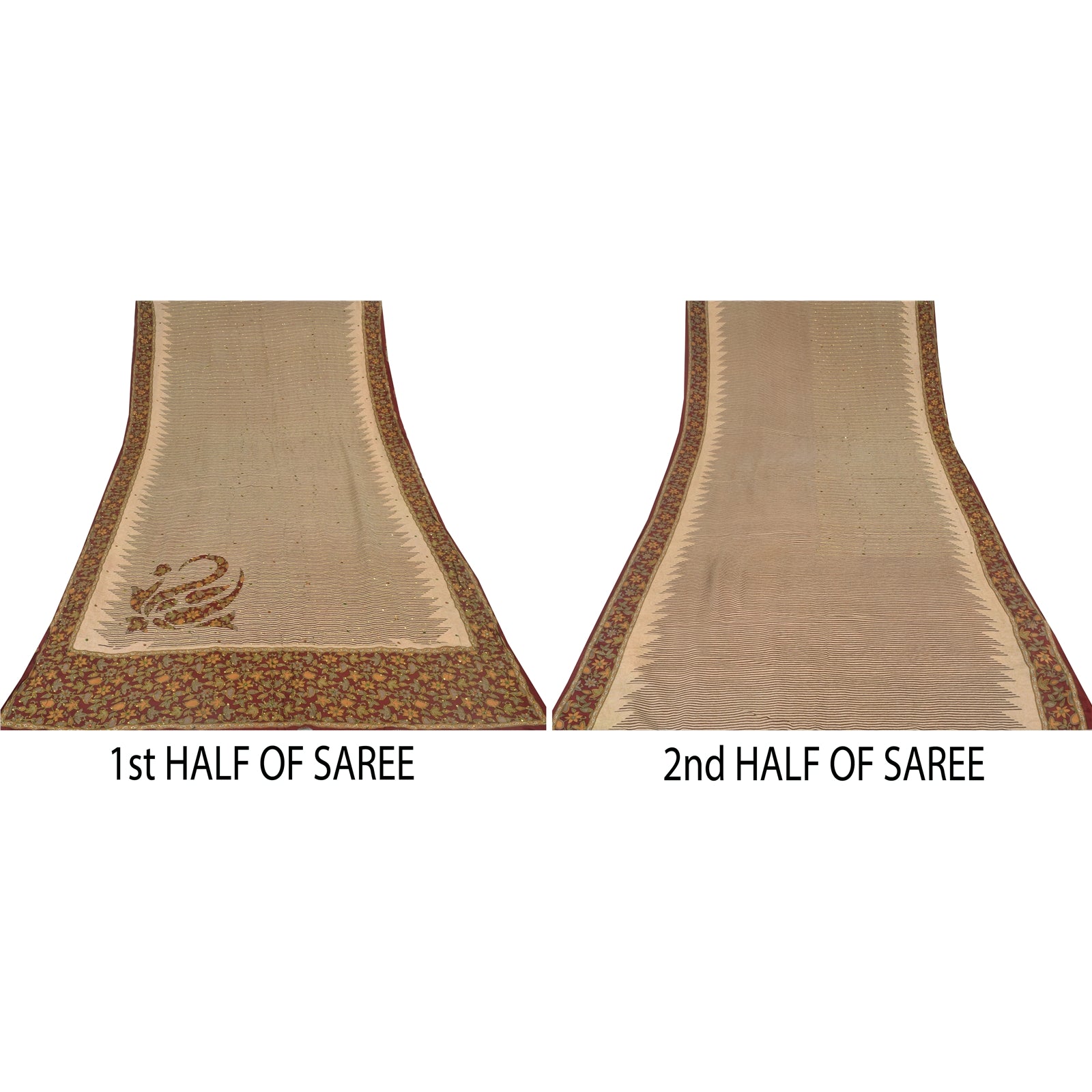 Sanskriti Vintage Sarees Ivory Hand Beaded Pure Crepe Printed Sari 5yd Sustainable Fabric