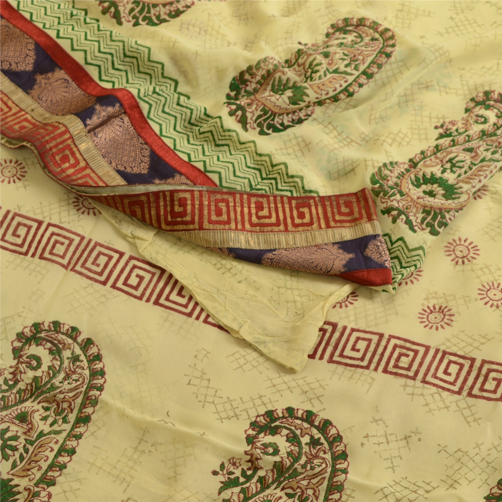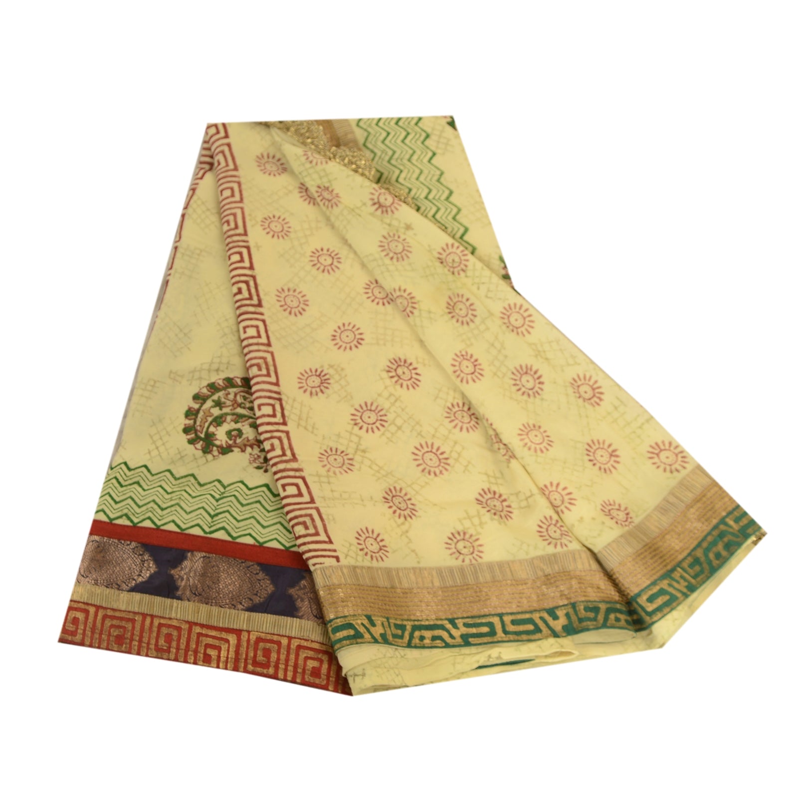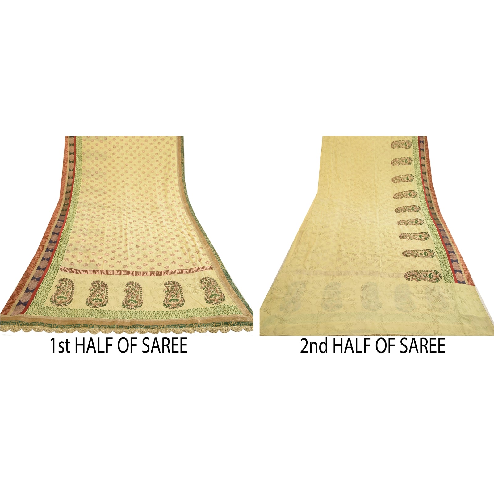 Sanskriti Vintage Sarees Ivory Hand Block Print Lace Blend Georgette Sari Sustainable Fabric