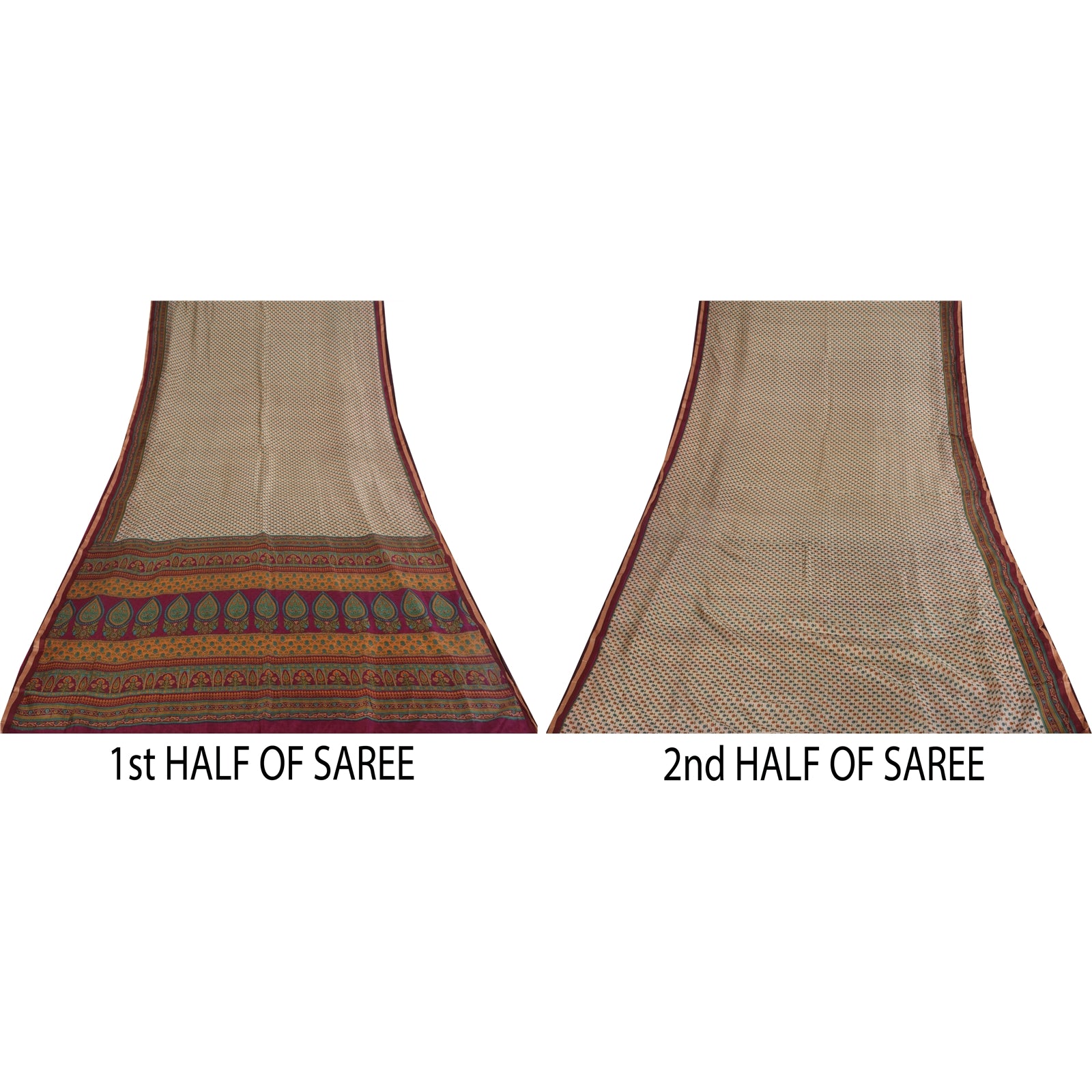 Sanskriti Vintage Sarees Ivory Indian Pure Silk Printed Sari 5+yd Craft Fabric