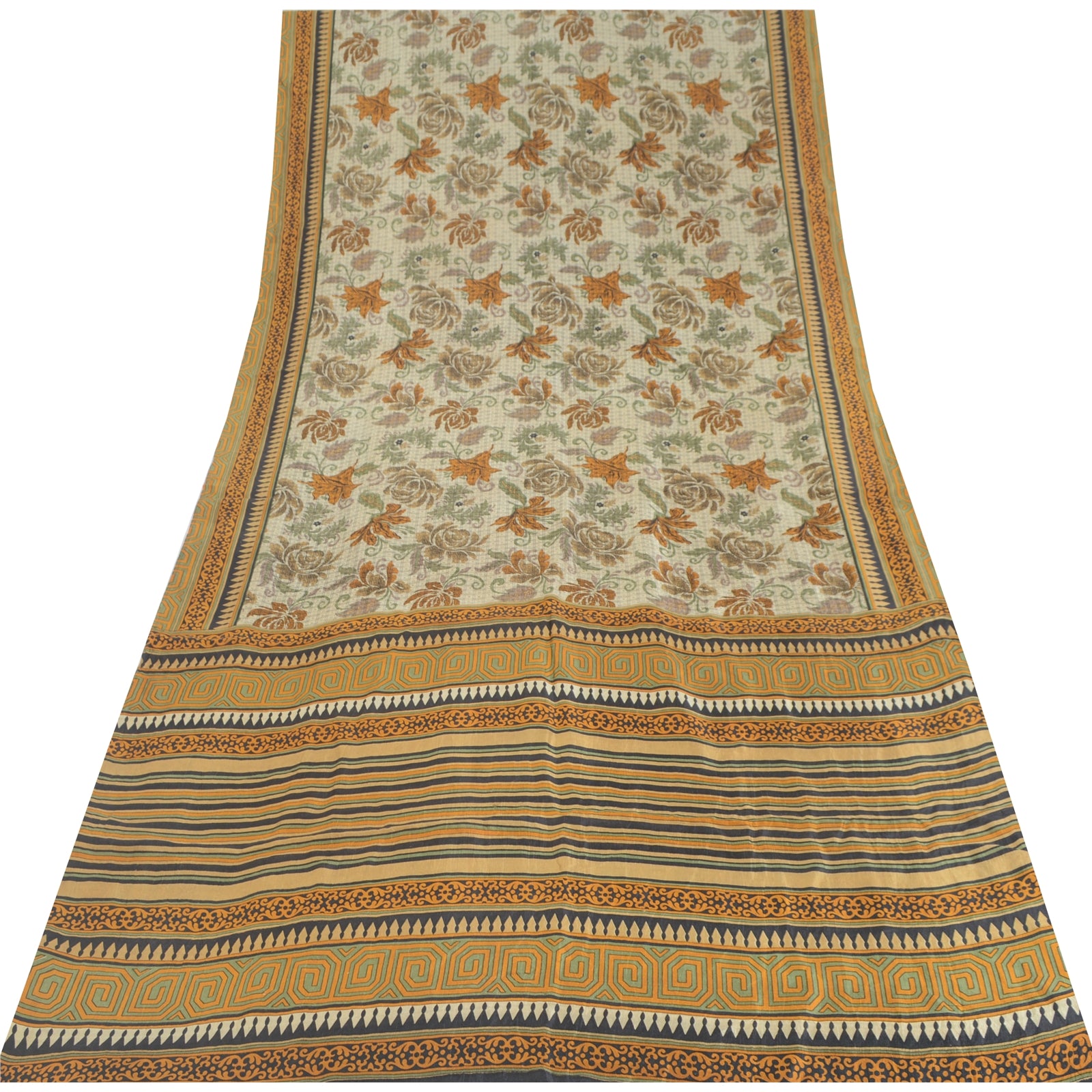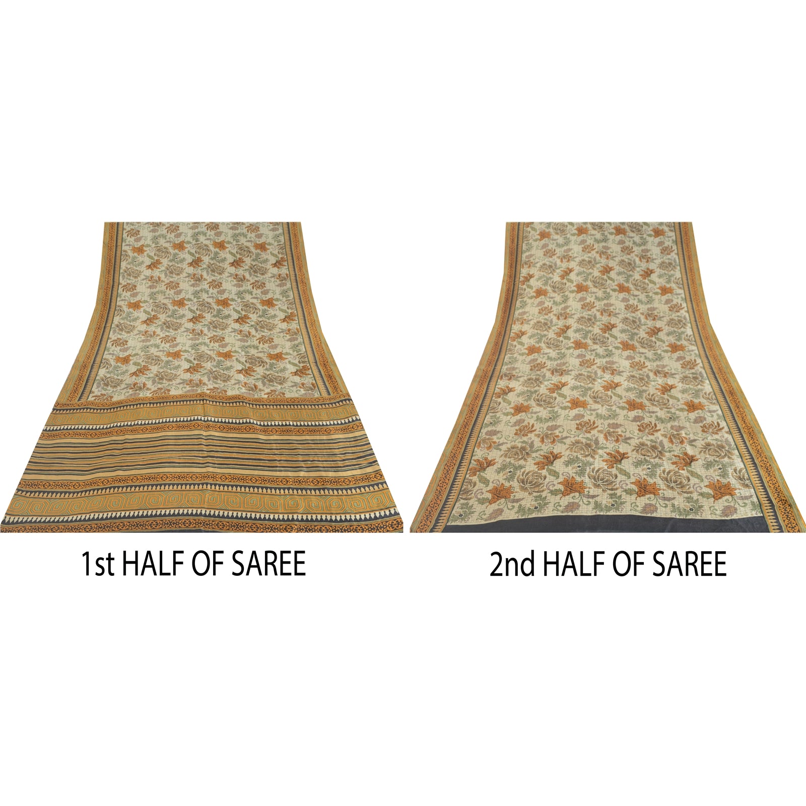 Sanskriti Vintage Sarees Ivory Indian Pure Silk Printed Sari 5yd Craft Sustainable Fabric