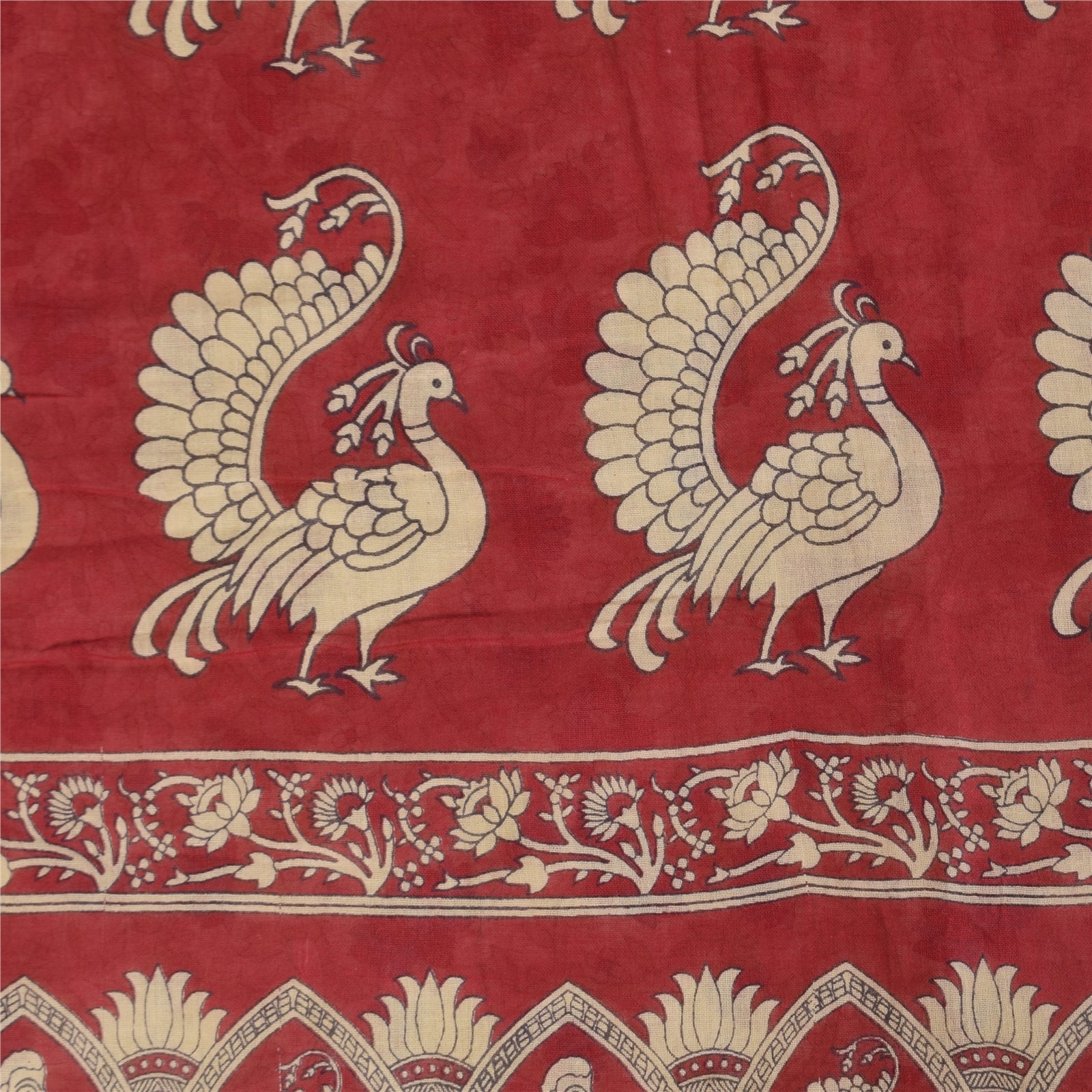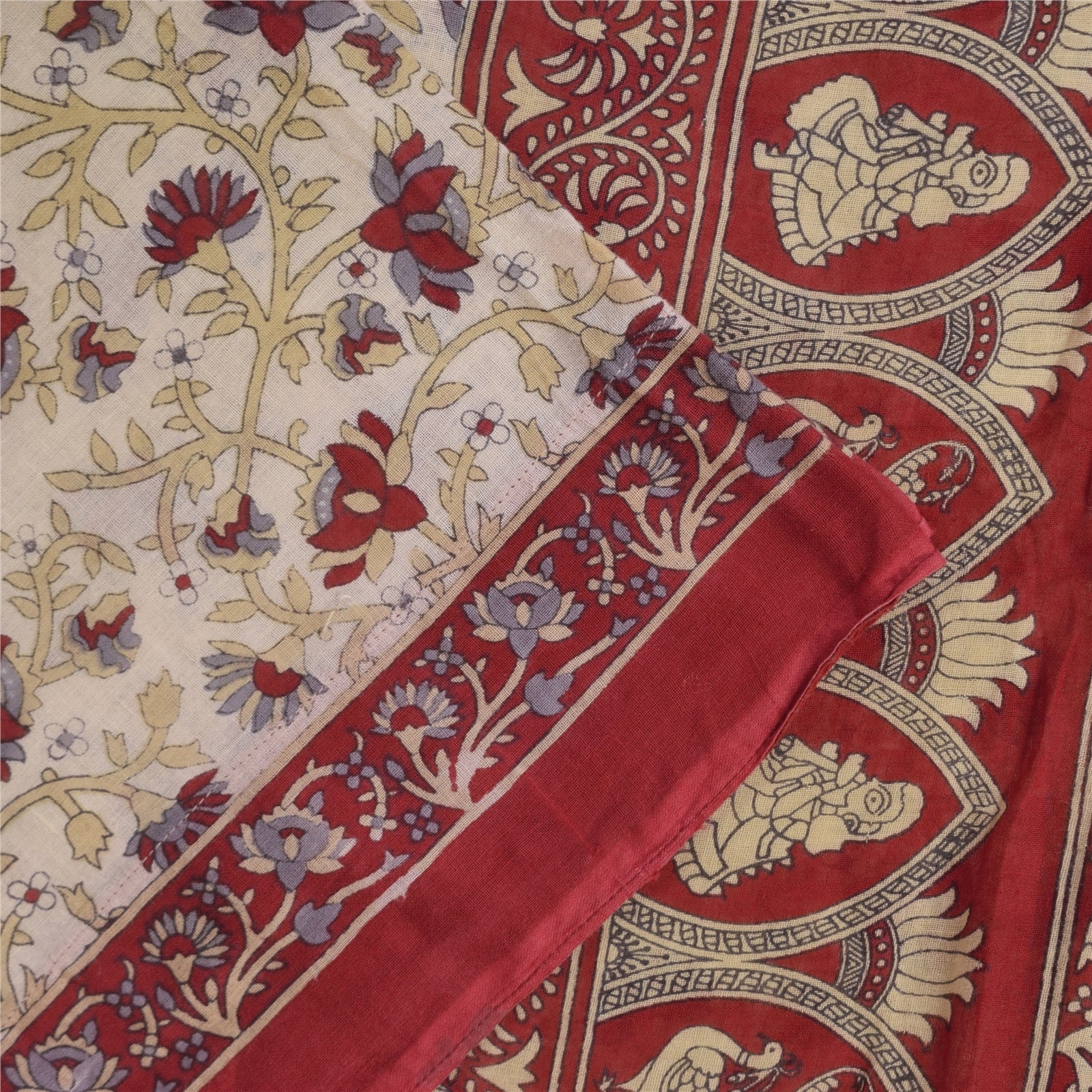 Sanskriti Vintage Sarees Ivory Kalamkari PrintPure Cotton Sari 5+yd Craft Sustainable Fabric