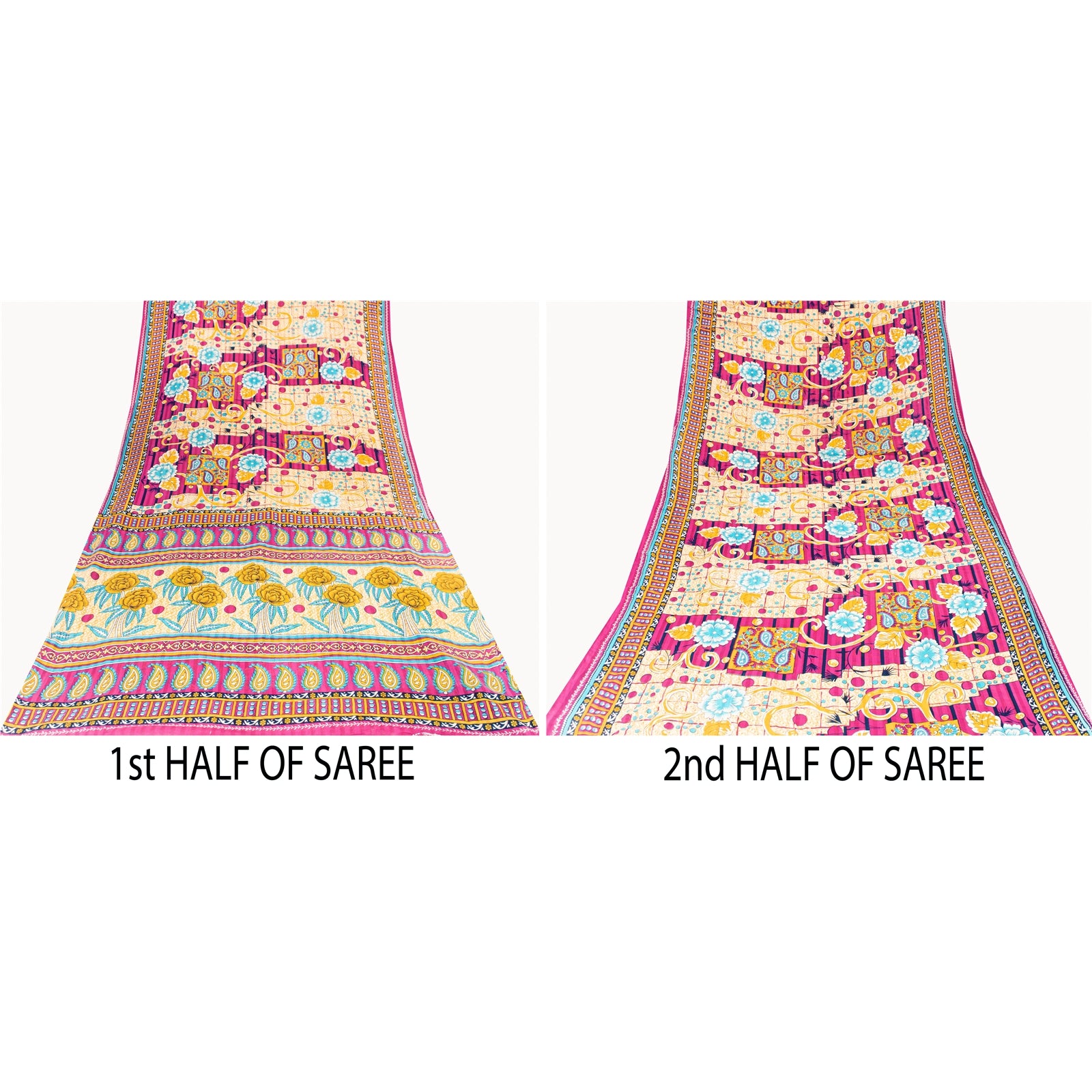 Sanskriti Vintage Sarees Ivory & Pink Pure Cotton Printed Sari 5+yd Craft Fabric