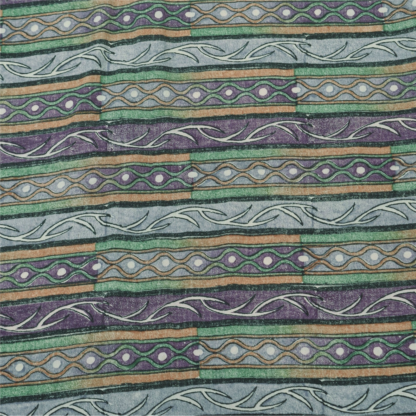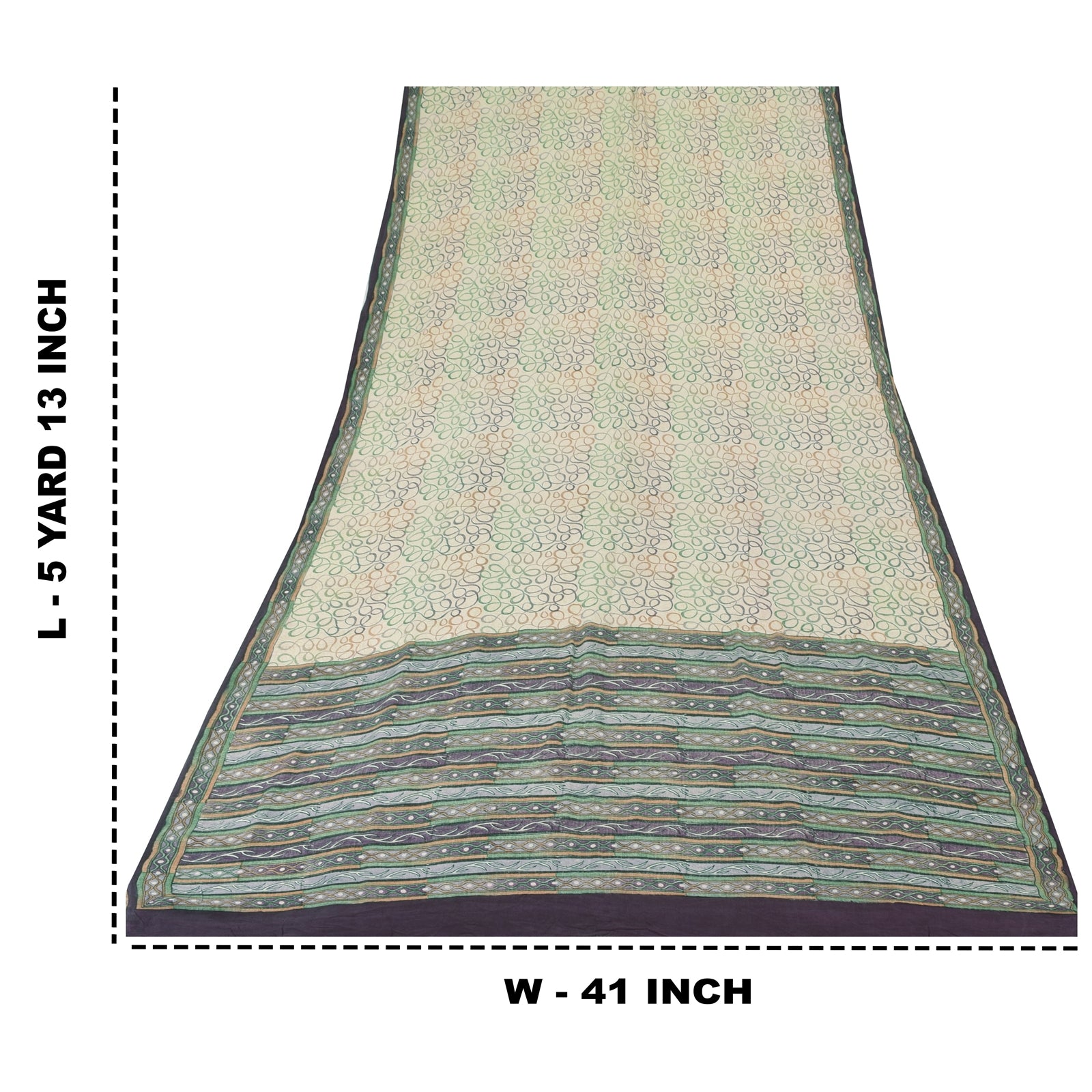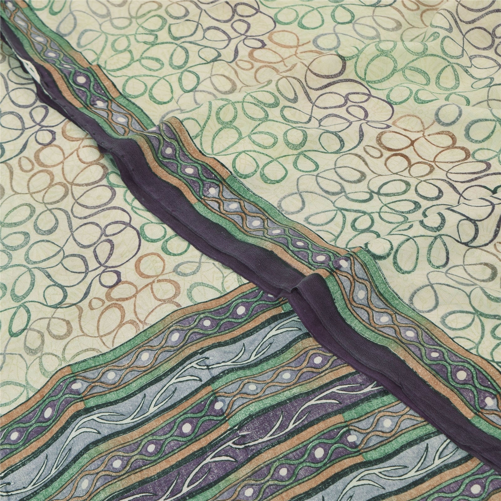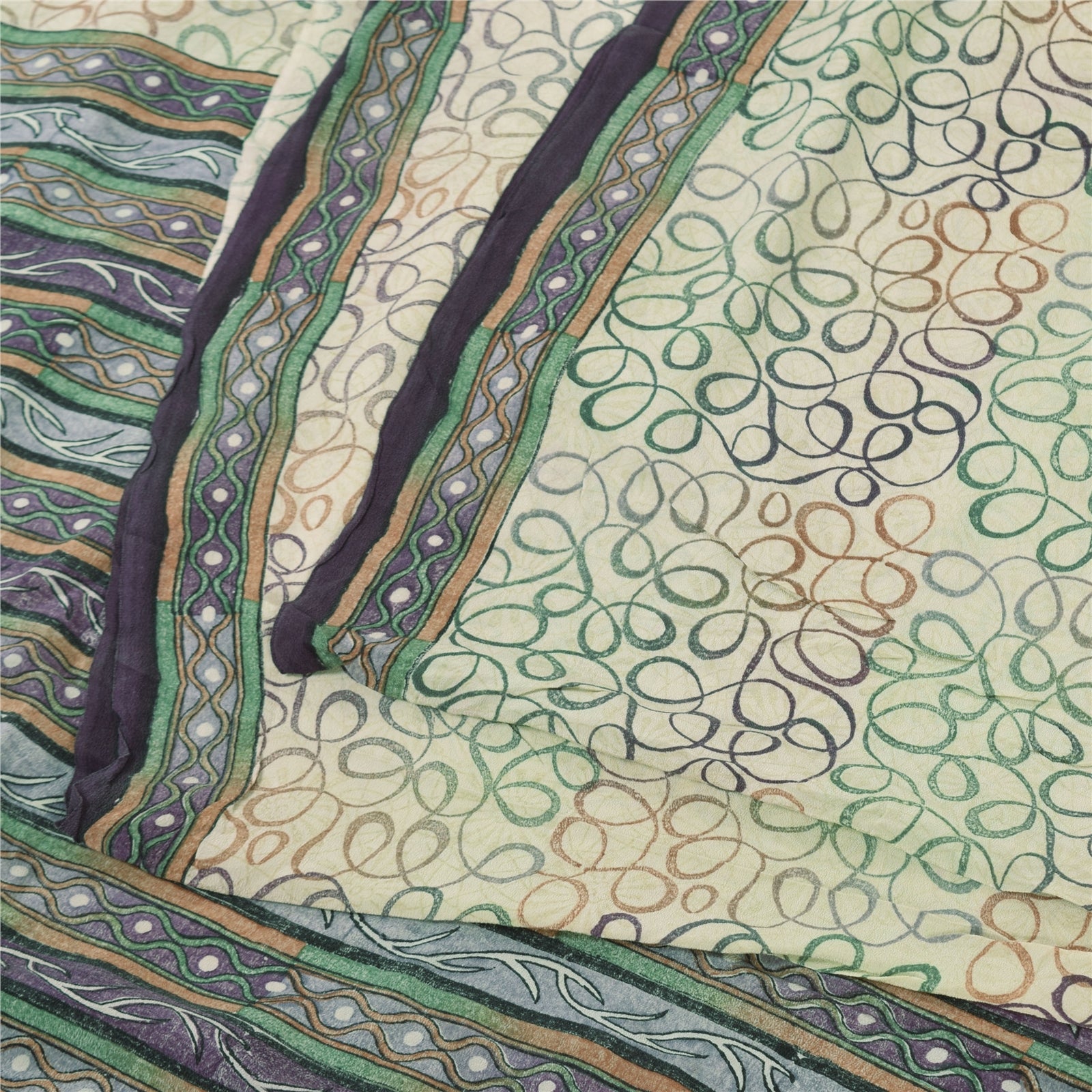 Sanskriti Vintage Sarees Ivory Pure Crepe Silk Printed Sari 5yd SoftCraft Sustainable Fabric