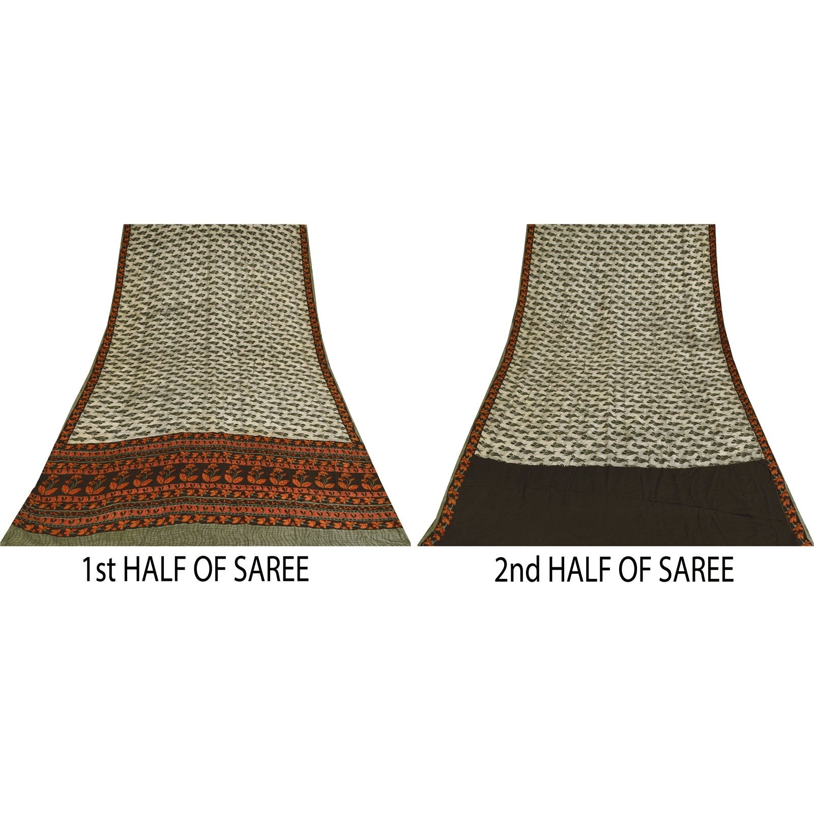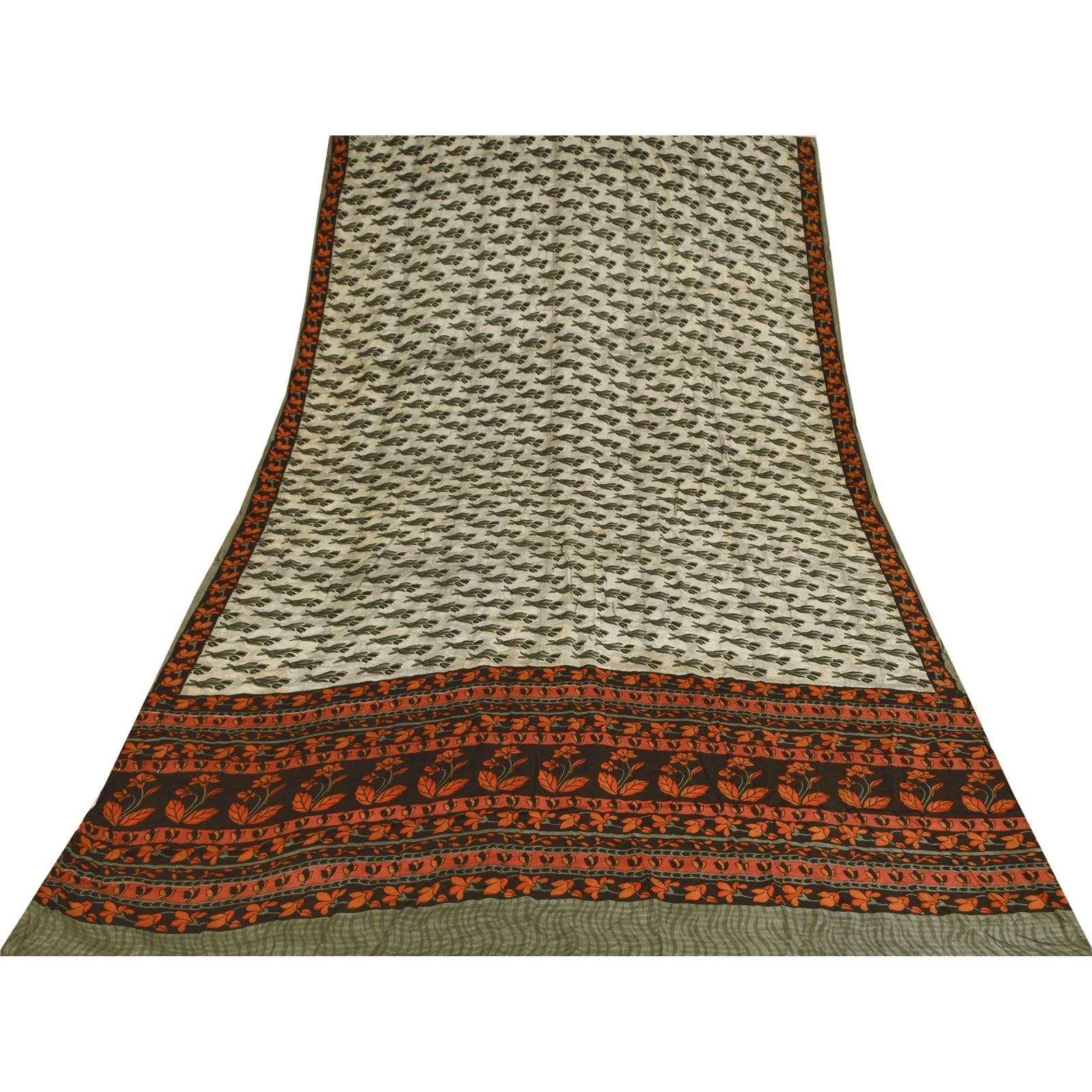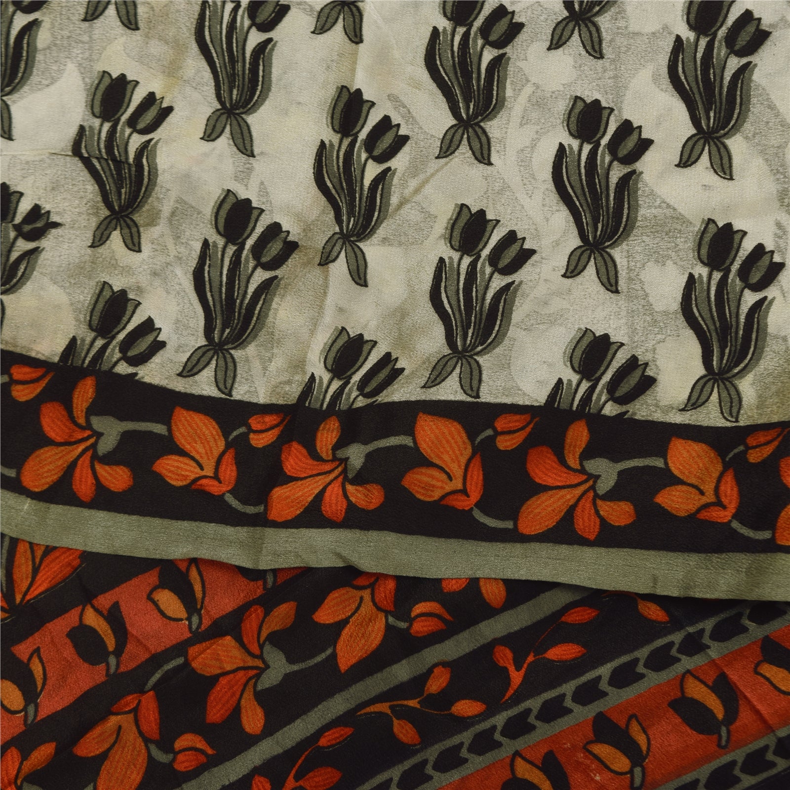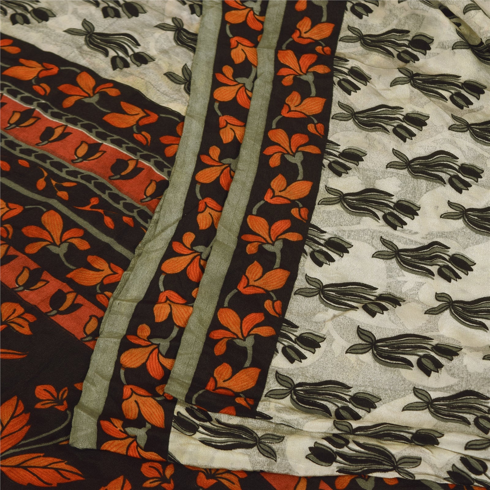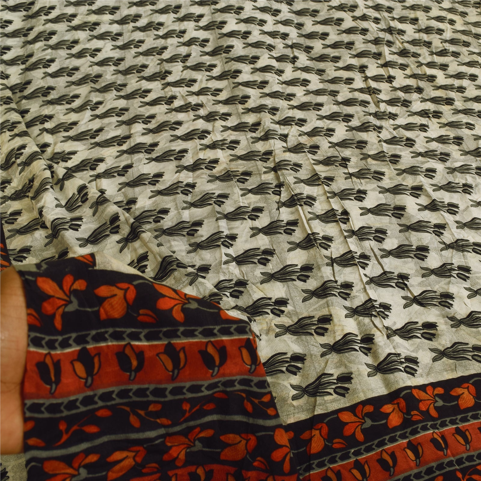 Sanskriti Vintage Sarees Ivory Pure Crepe Silk Printed Sari 6yd Craft Sustainable Fabric