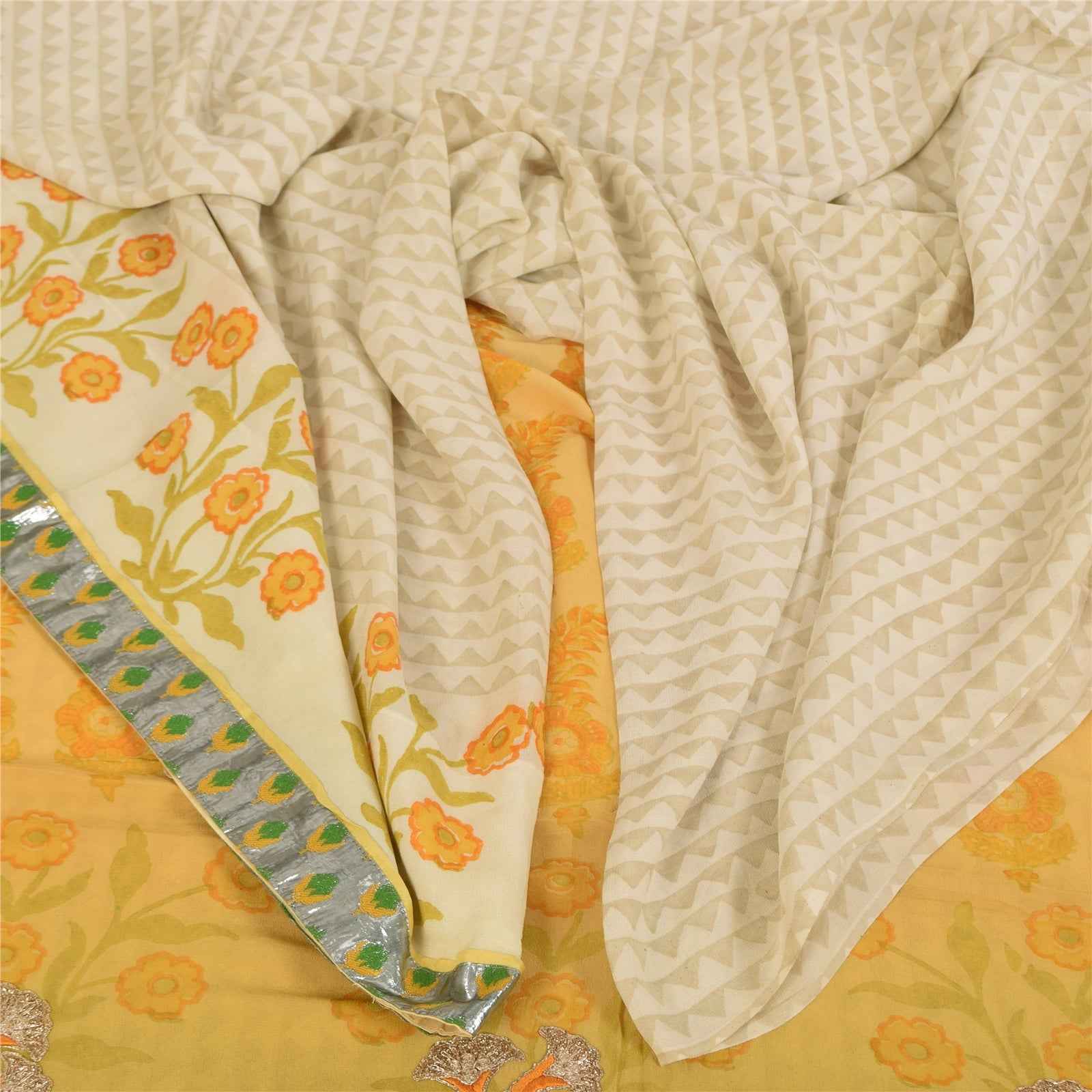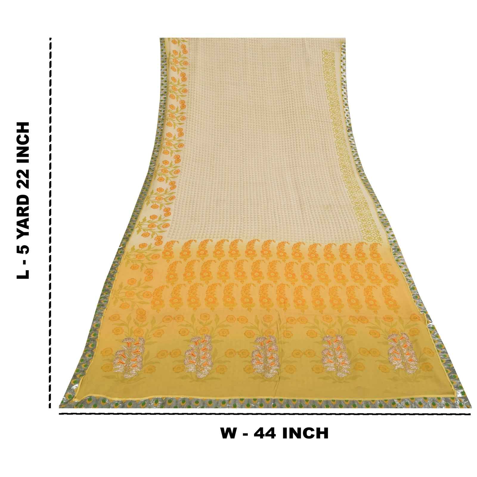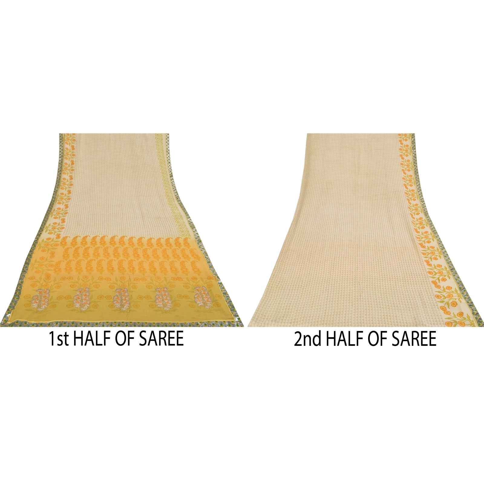 Sanskriti Vintage Sarees Ivory Pure Georgette Silk Print Sari 5+yd Craft Fabric