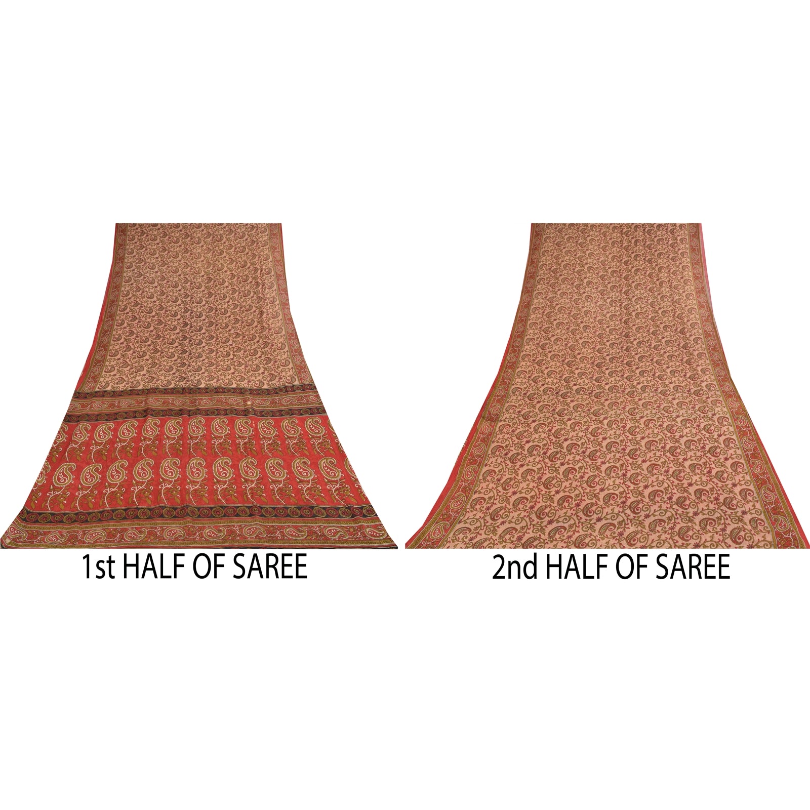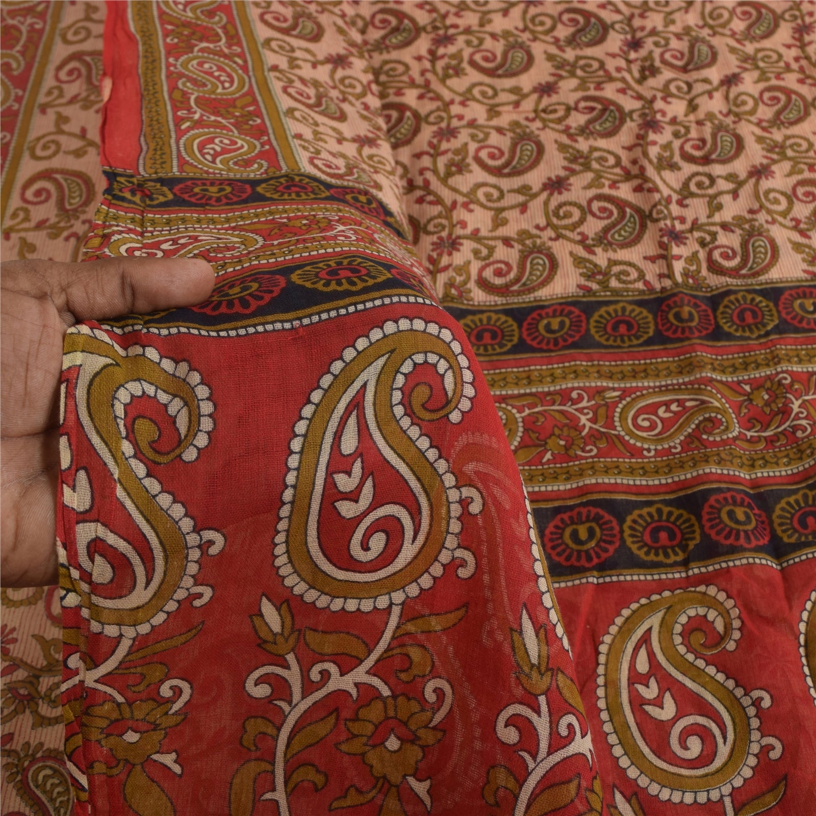 THE ITEM COLOR OR SHADE MAY BE DARKER OR LIGHTER THAN THE PICTURE. Attractive ivory & red colored pure cotton printed sari. Pallu & Border has printed floral & paisley design. Similar design in center part of saree.. This unique vintage saree can be used for various crafting ideas even if you don't want to use it as a sari. Design a dress, use it as a as window dressing, upholstery, sarongs, throw, dress making and table linen much more. Let your creative juices flow and use this decorated Sustainable Fabric in multiple fashion. Shipping Note: 'International buyers please note: Import duties, taxes, and charges are not included in the item price or postage cost. These charges are the buyer's responsibility. Please check with your country's customs office to determine what these additional costs will be prior to bidding or buying. Buyer will pay custom duty/tax. It is calculated and charged differently by every country. As a seller I do not have any control over it. VAT or sales tax is calculated by the platform at the time of checkout. Customs charge is payable at the time of delivery.' PCS-6504