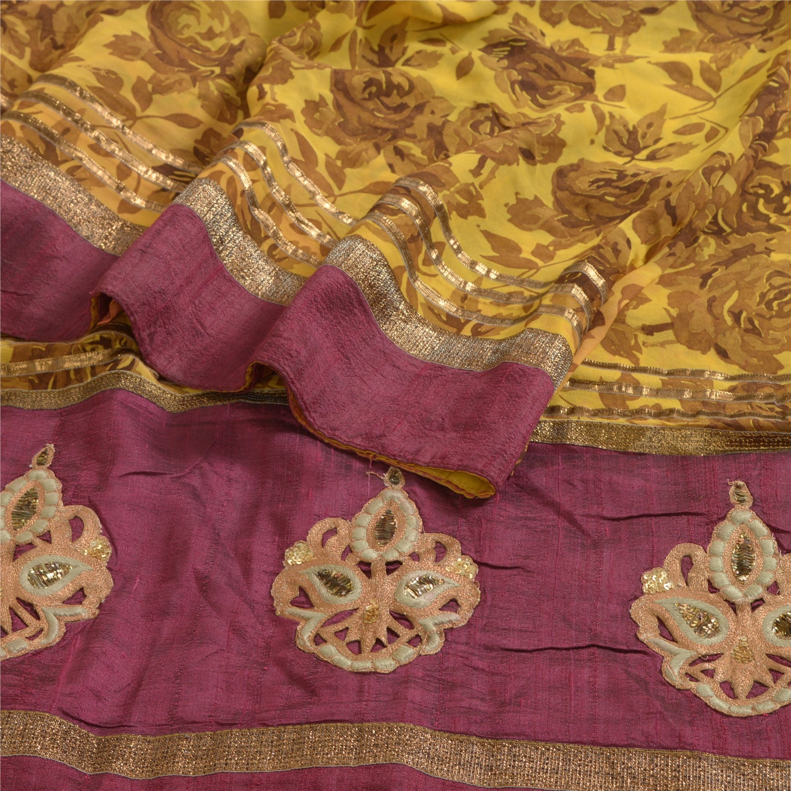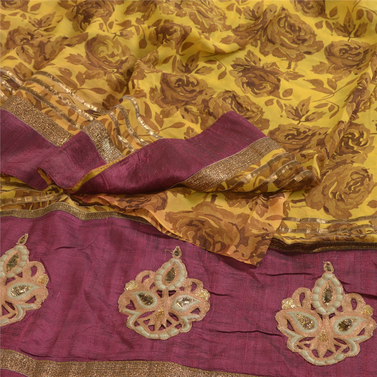 Sanskriti Vintage Sarees Mustard PatchWork Pure Georgette Silk Print Sari Sustainable Fabric