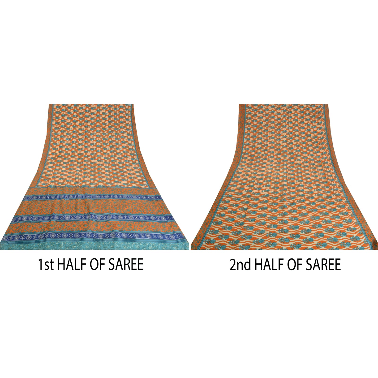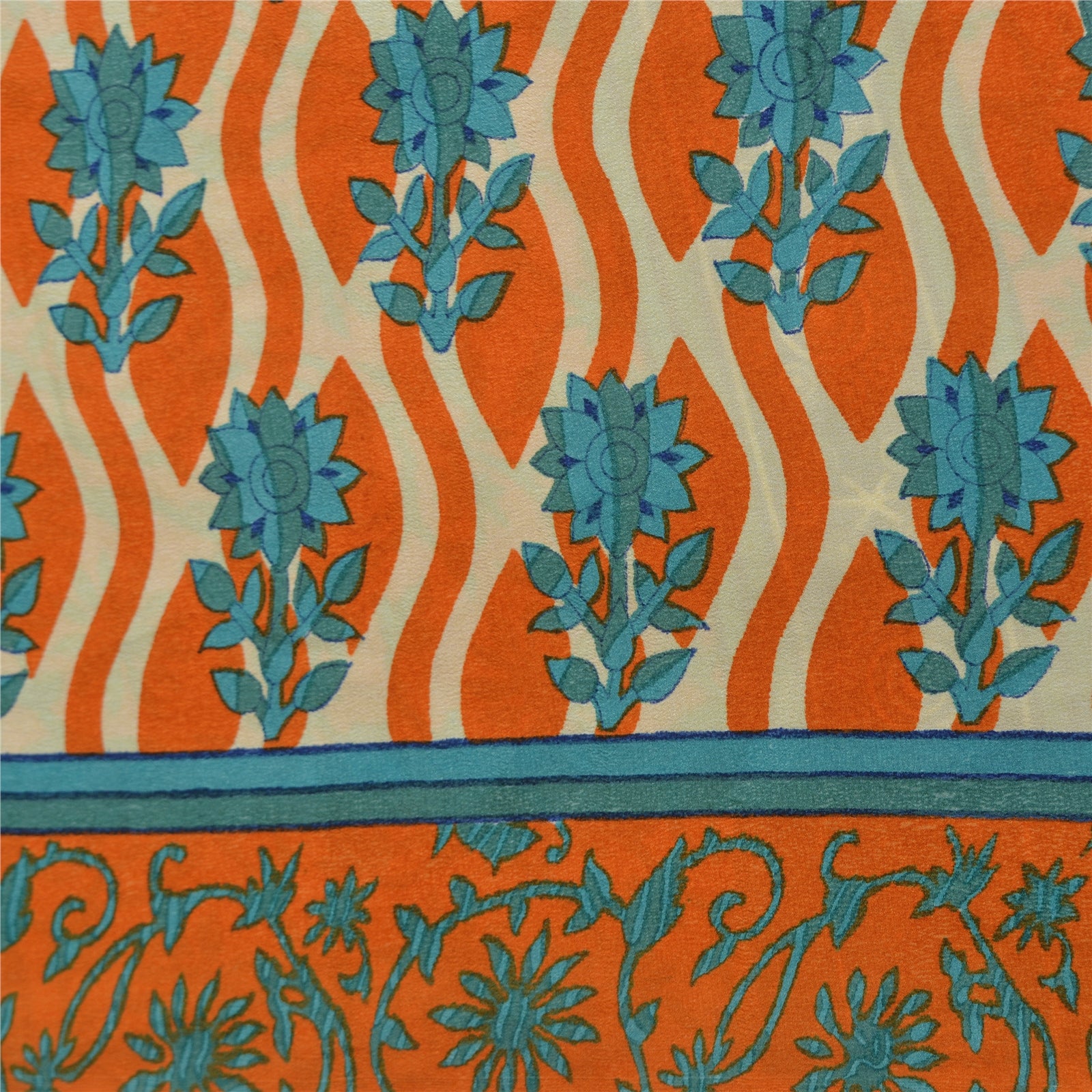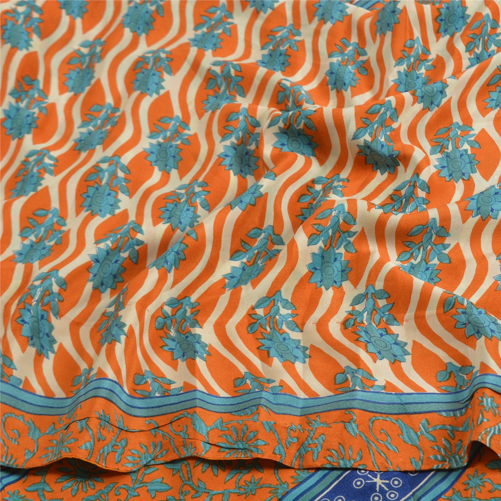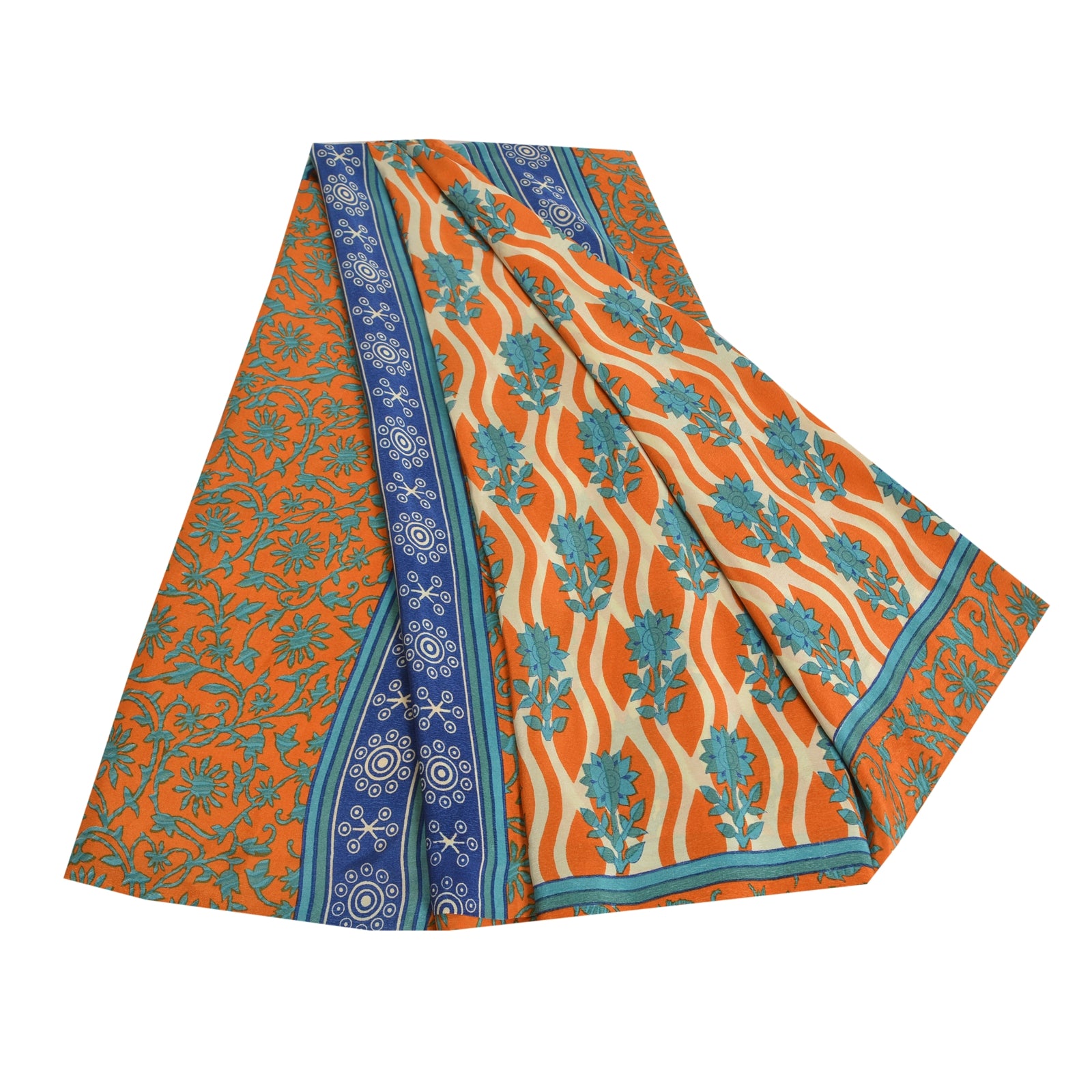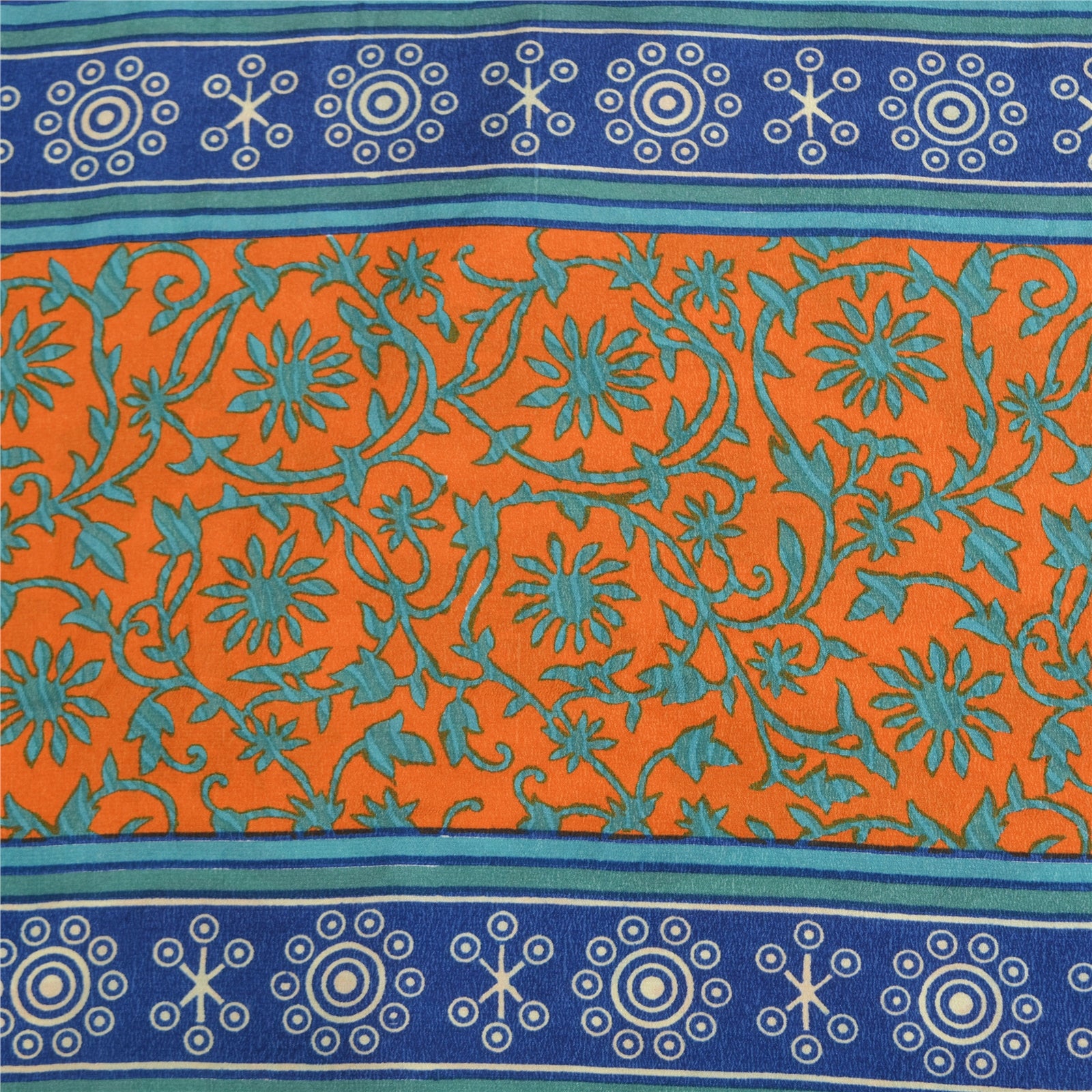 Sanskriti Vintage Sarees Orange/Blue Pure Crepe Silk Printed Sari Craft Sustainable Fabric