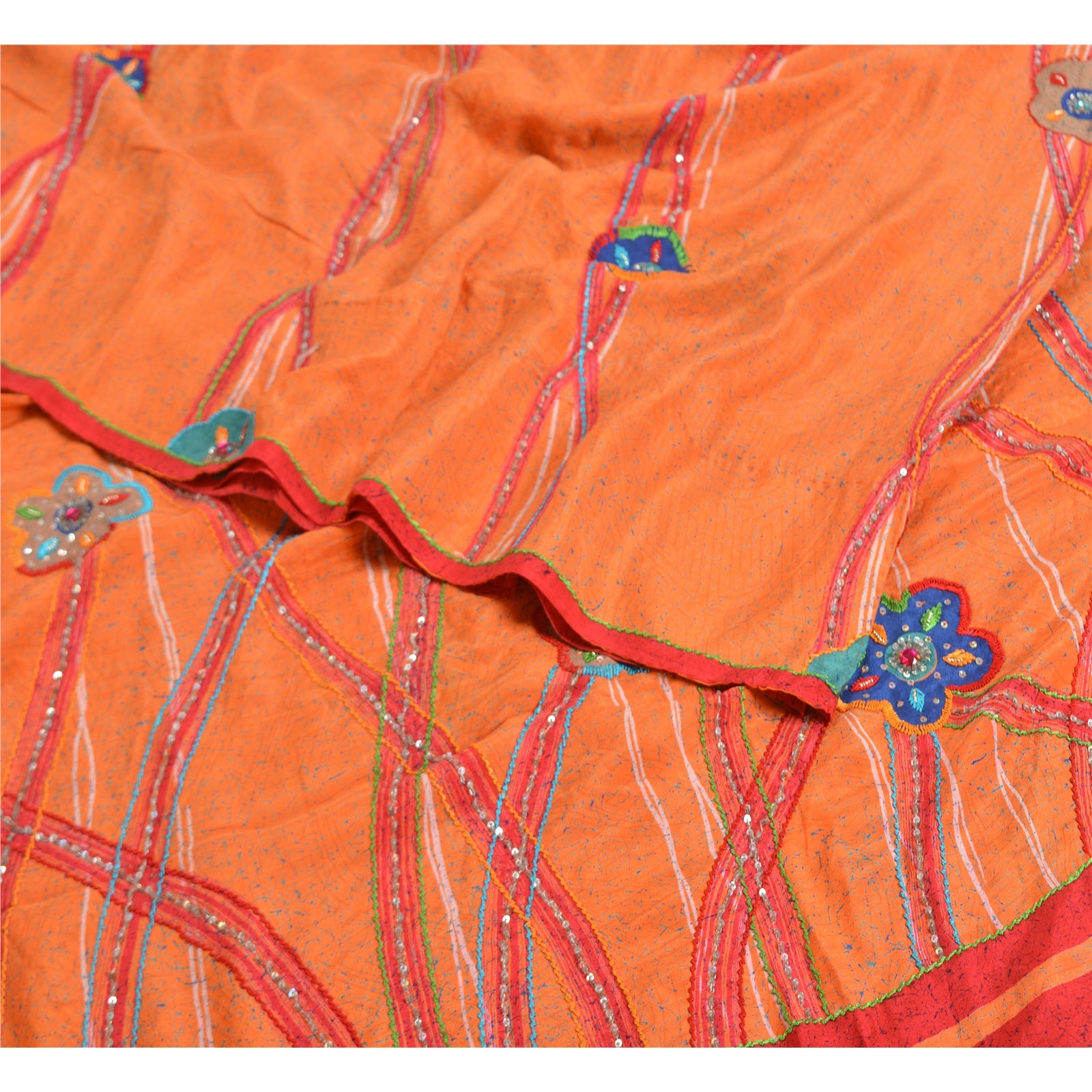 Sanskriti Vintage Sarees Orange Hand Beaded Pure Crepe Silk Printed Sari Sustainable Fabric