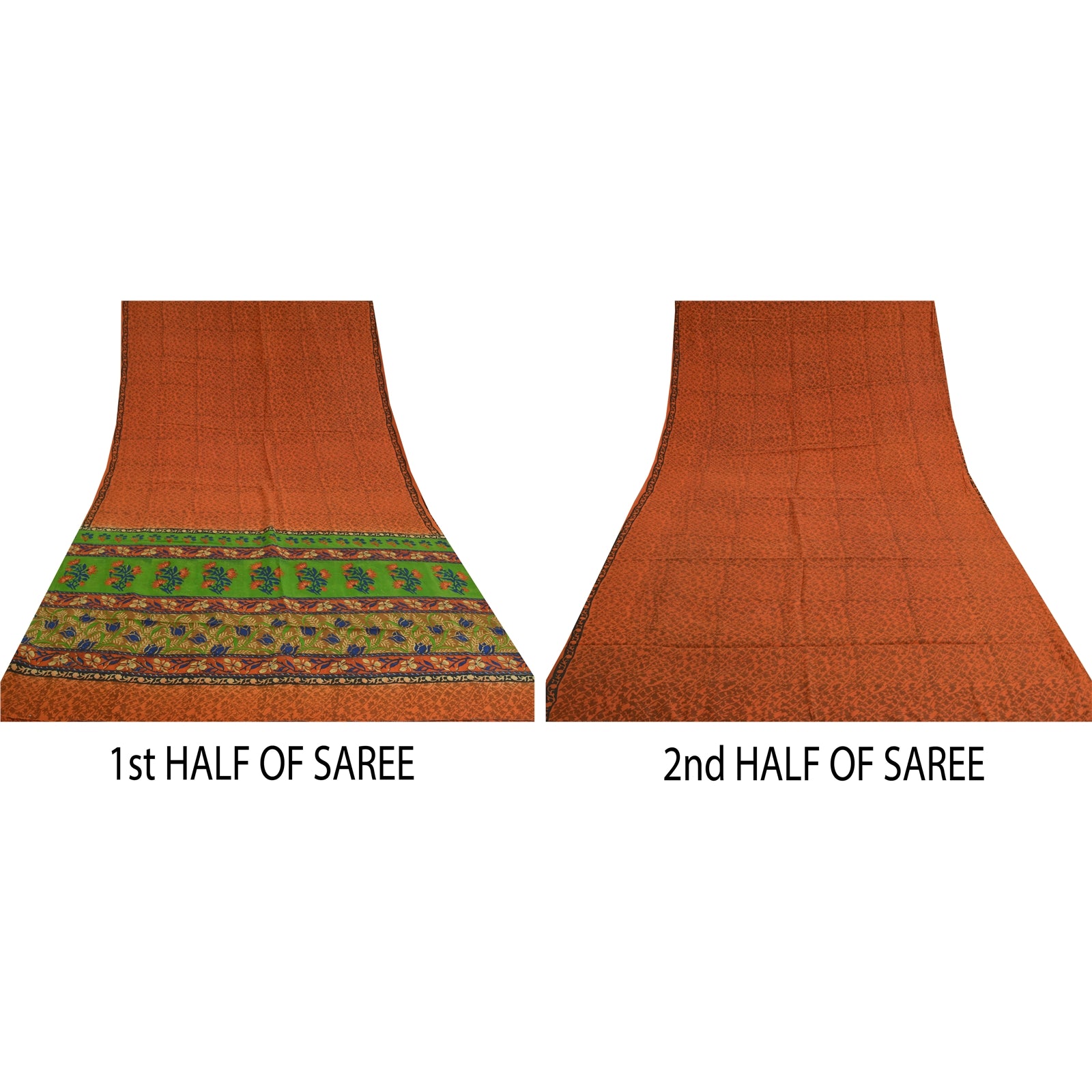 Sanskriti Vintage Sarees Orange Indian Pure Crepe Silk Sari Floral Craft Sustainable Fabric