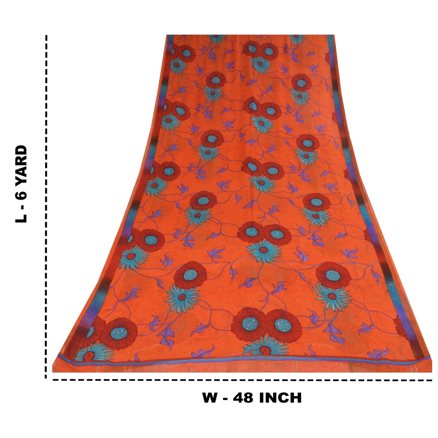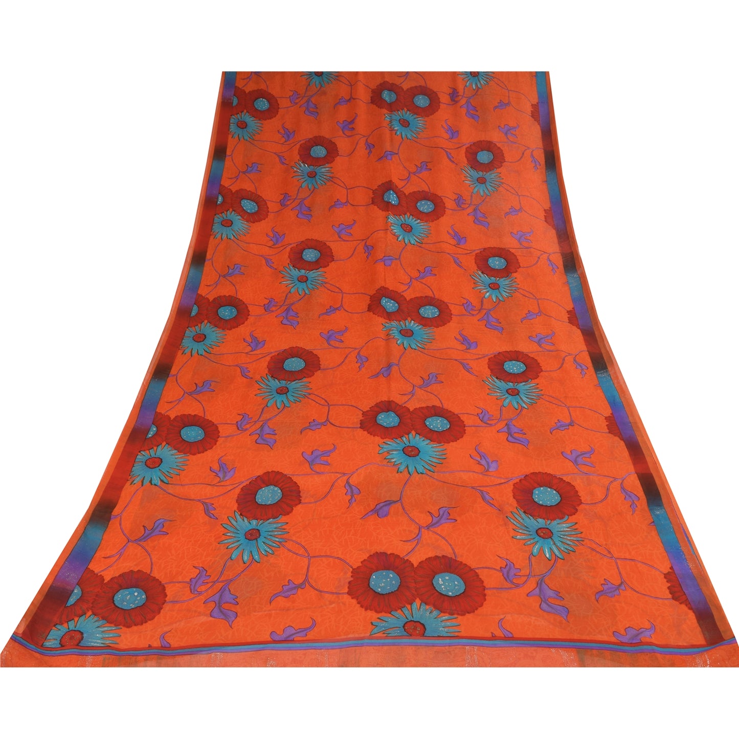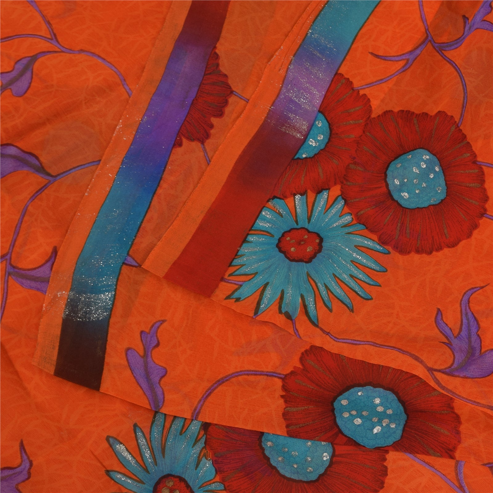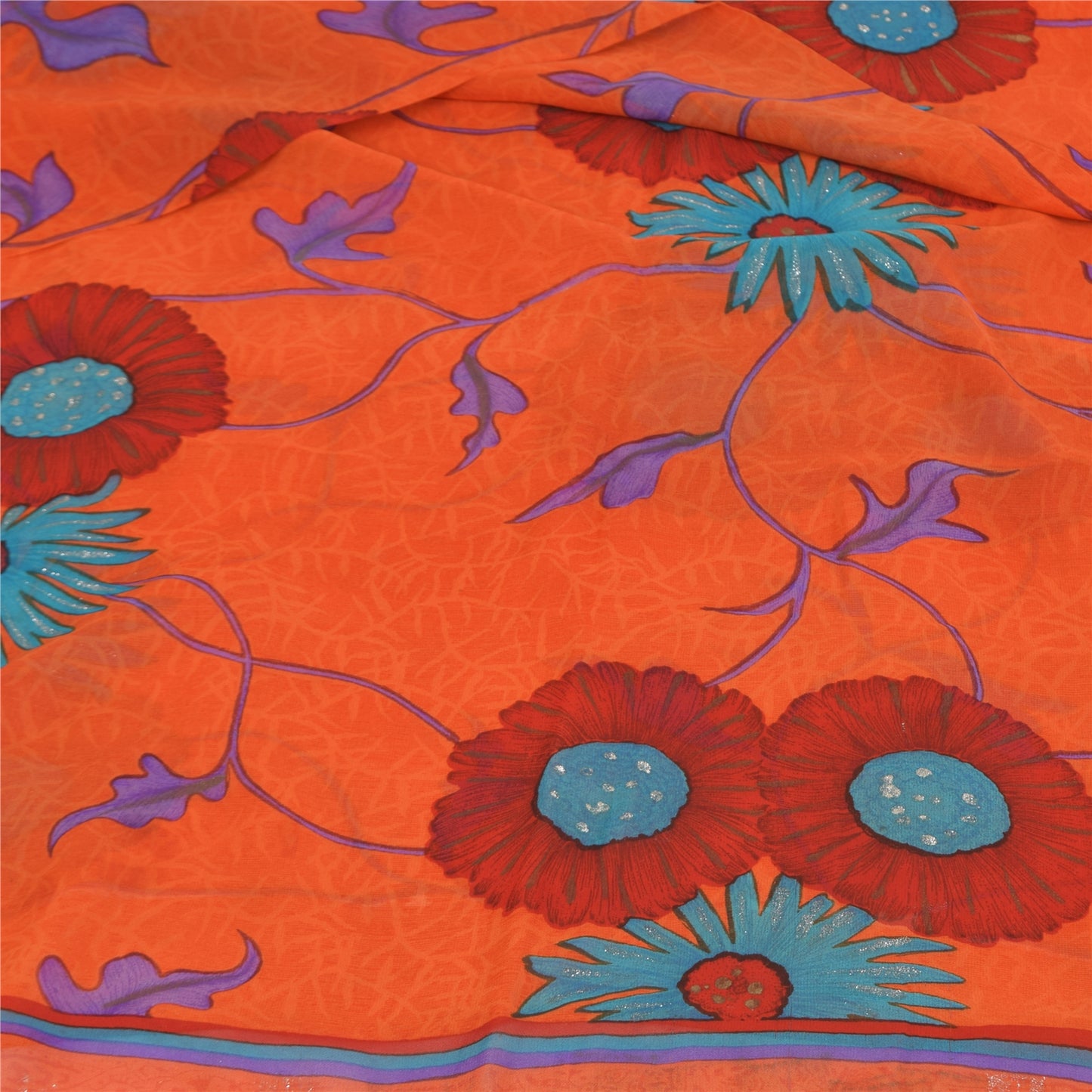 Sanskriti Vintage Sarees Orange Pure Georgette Printed Sari 5+yd Craft Fabric
