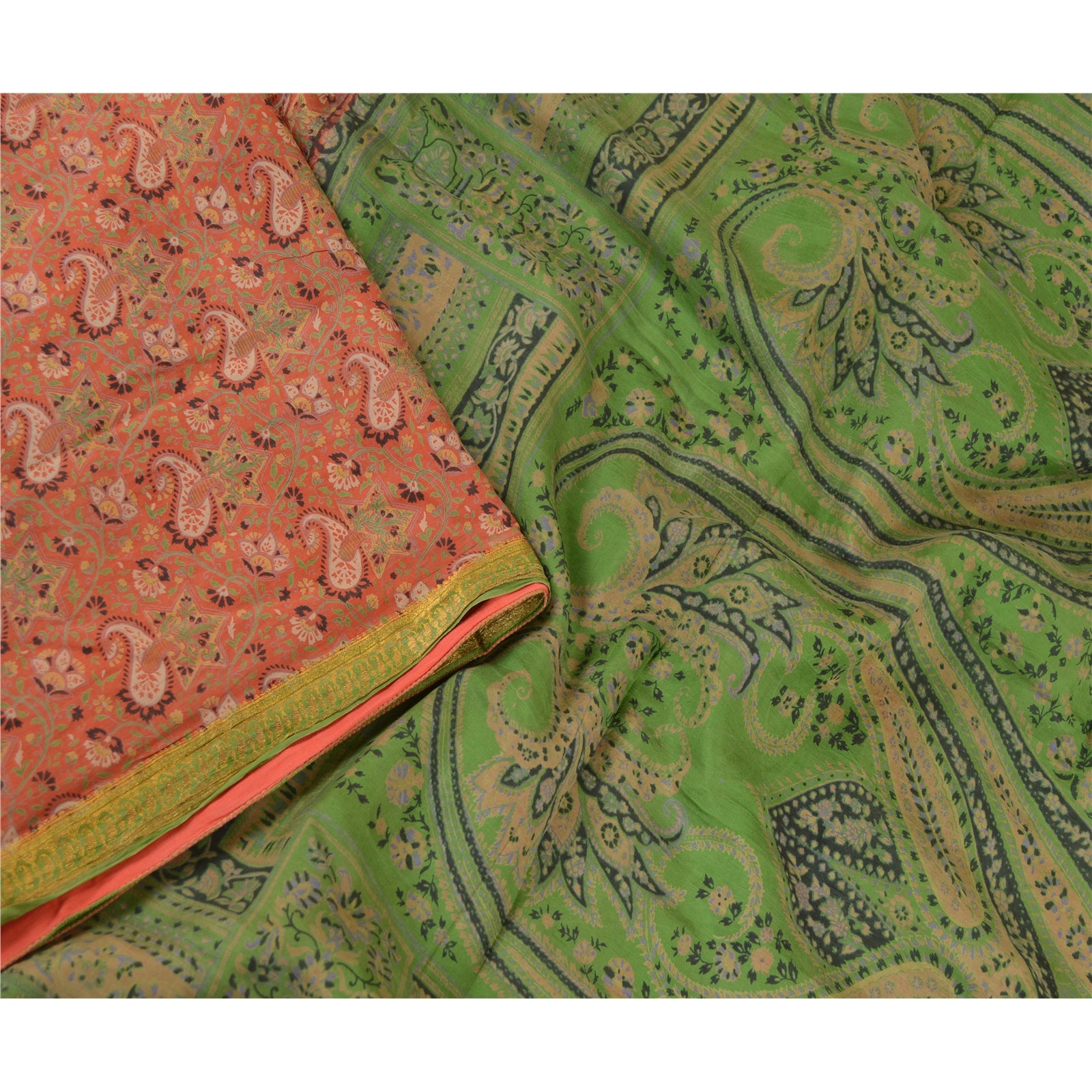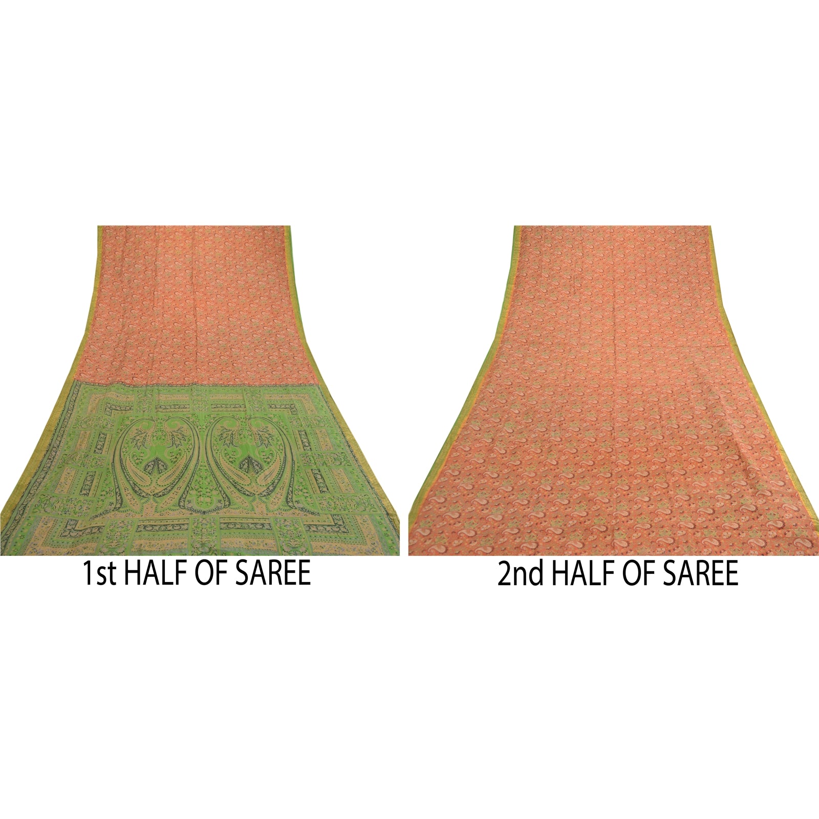 Beautiful orange & green colored pure silk printed saree. Pallu & Border has printed floral design & golden zari woven work. Similar design in center part of saree. What is special about this saree? Fabulous design is really enhancing the beauty of the saree.This unique vintage saree can be used for various crafting ideas even if you don't want to use it as a sari. Design a dress, use it as window,dressing, upholstery, sarongs, throw, dress making and table linen much more. Let your creative juices flow and use this decorated Sustainable Fabric in multiple fashion.