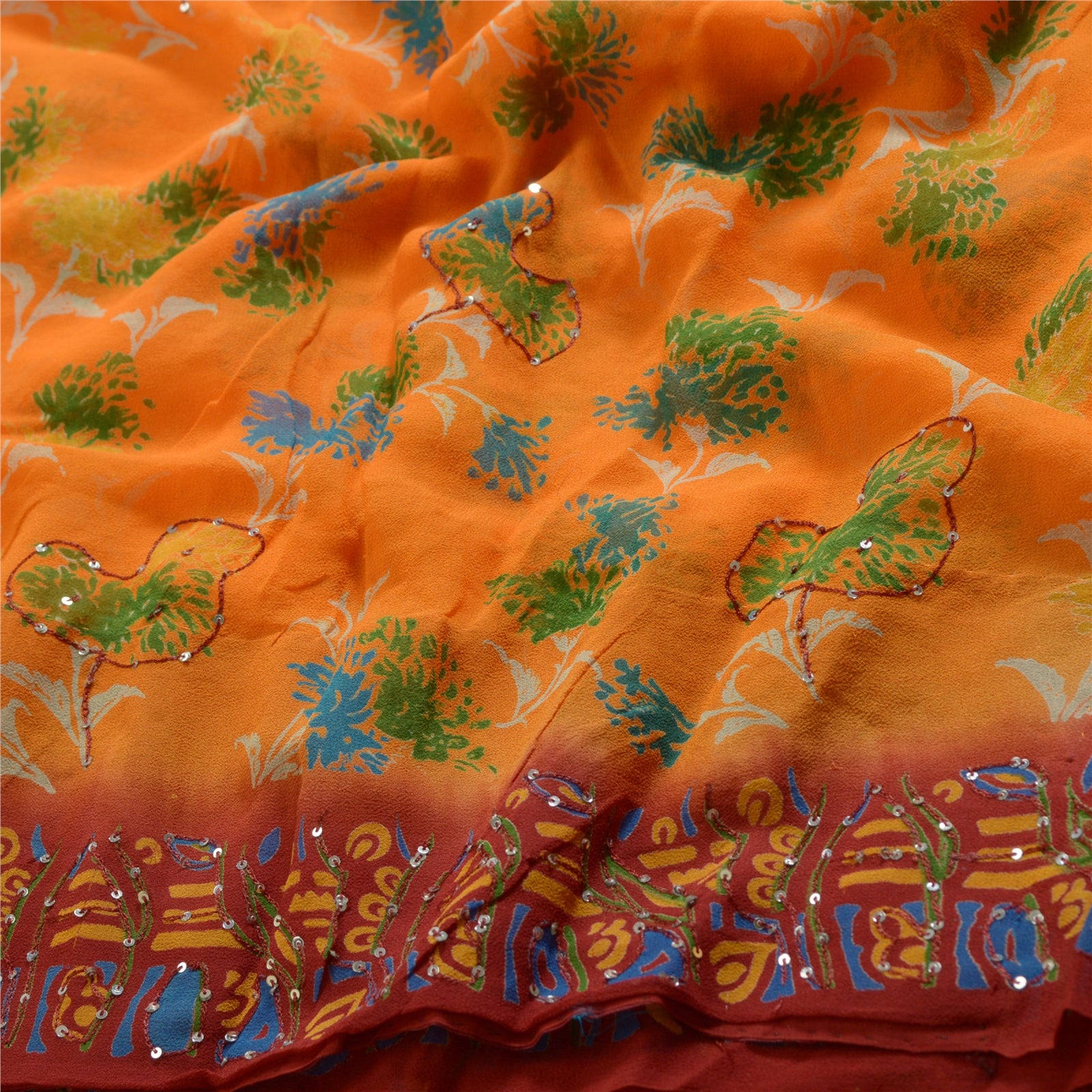Sanskriti Vintage Sarees Orange/Red Hand Beaded Pure Georgette Silk Sari Sustainable Fabric
