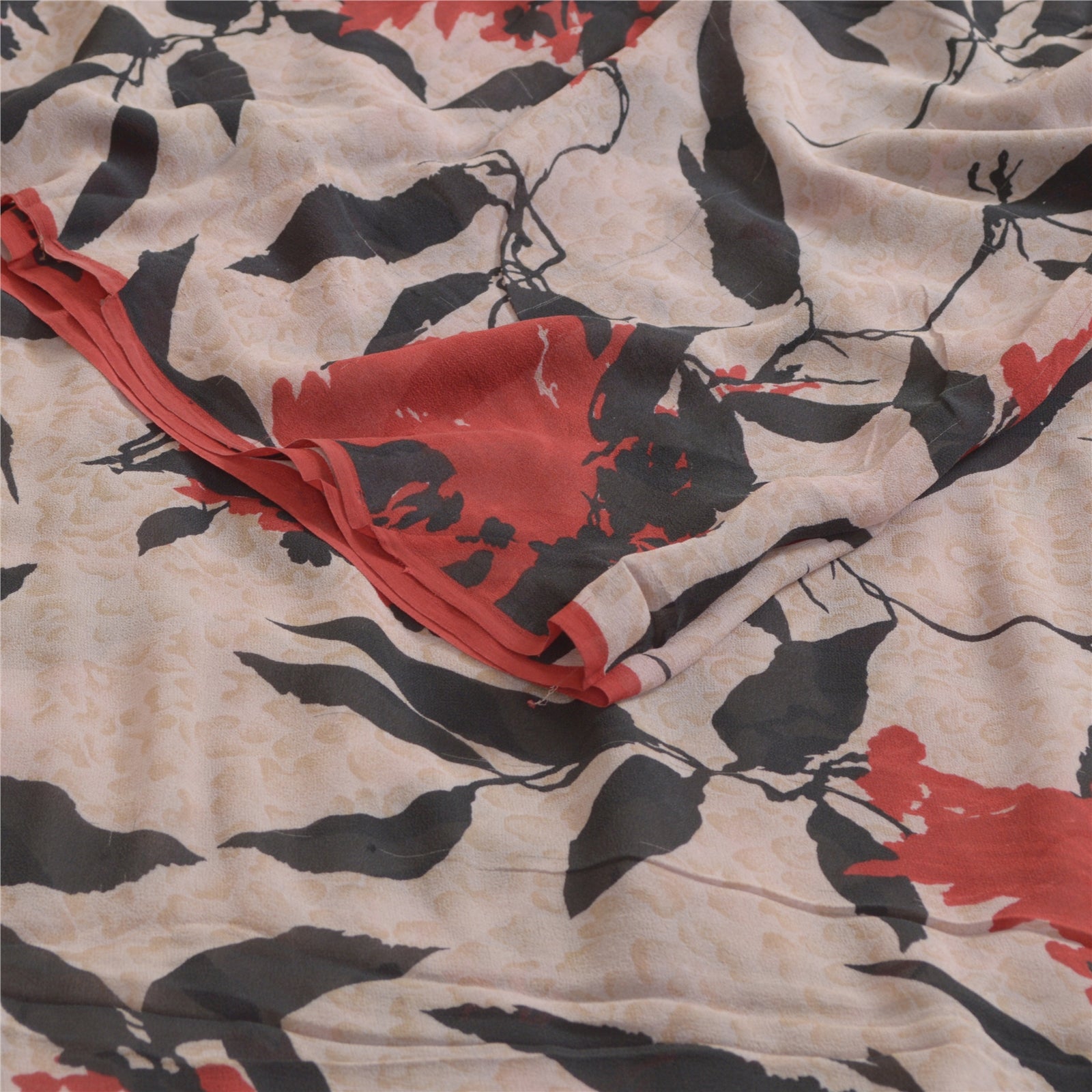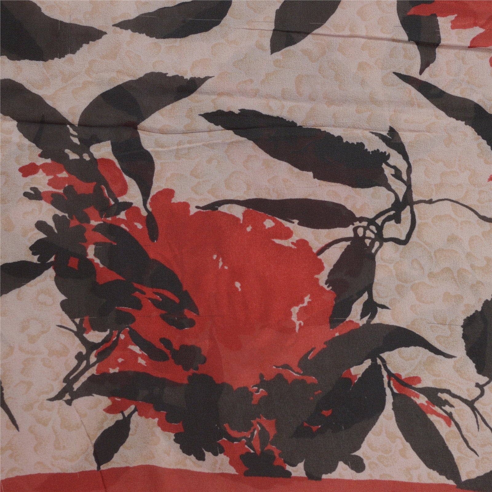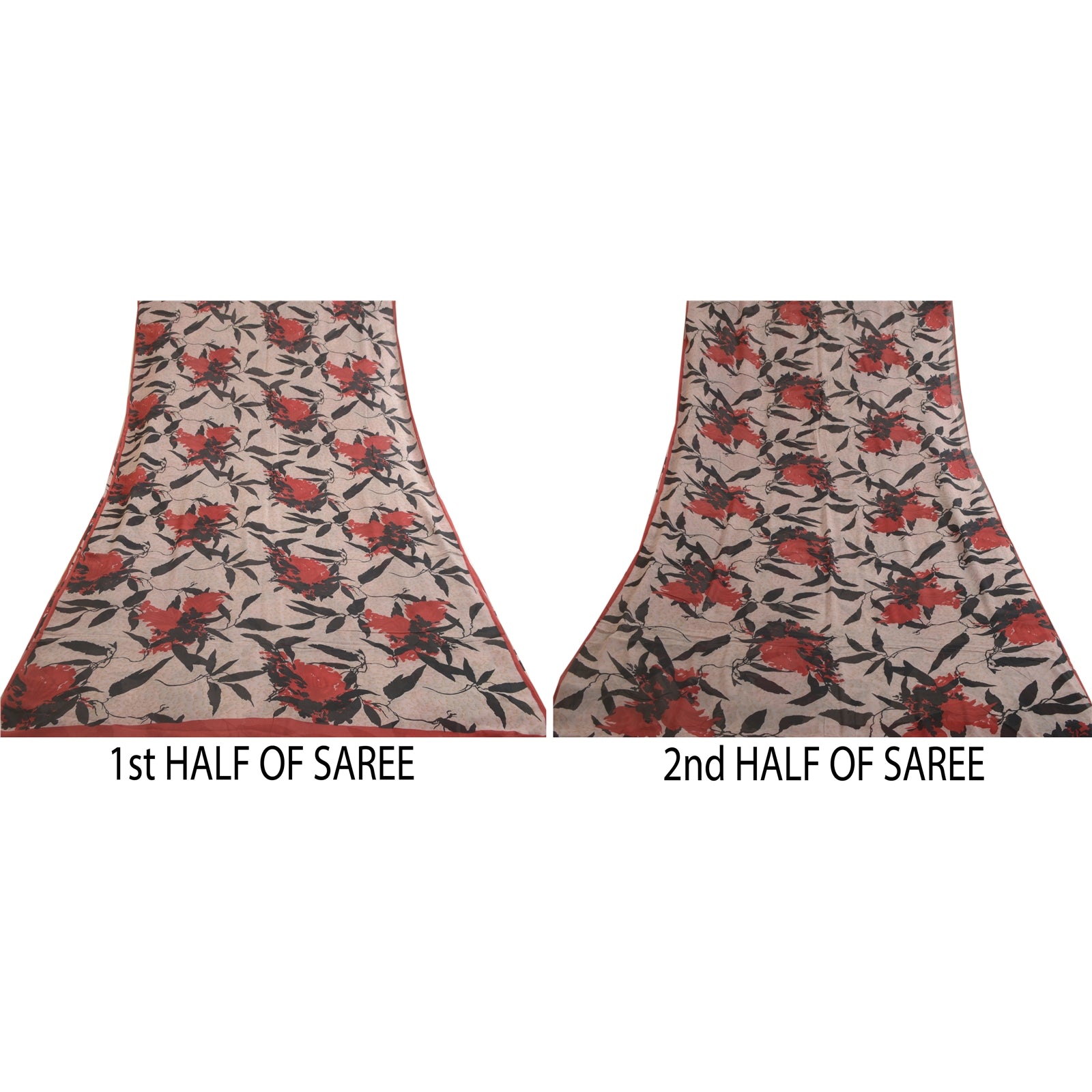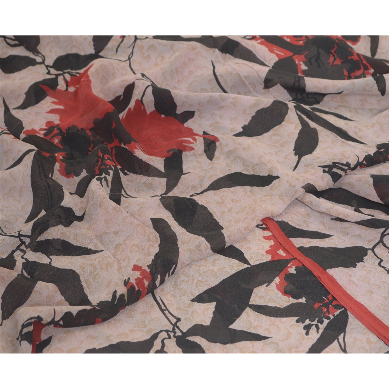 Sanskriti Vintage Sarees Pale-Cream Pure Georgette Silk Print Sari Craft Sustainable Fabric